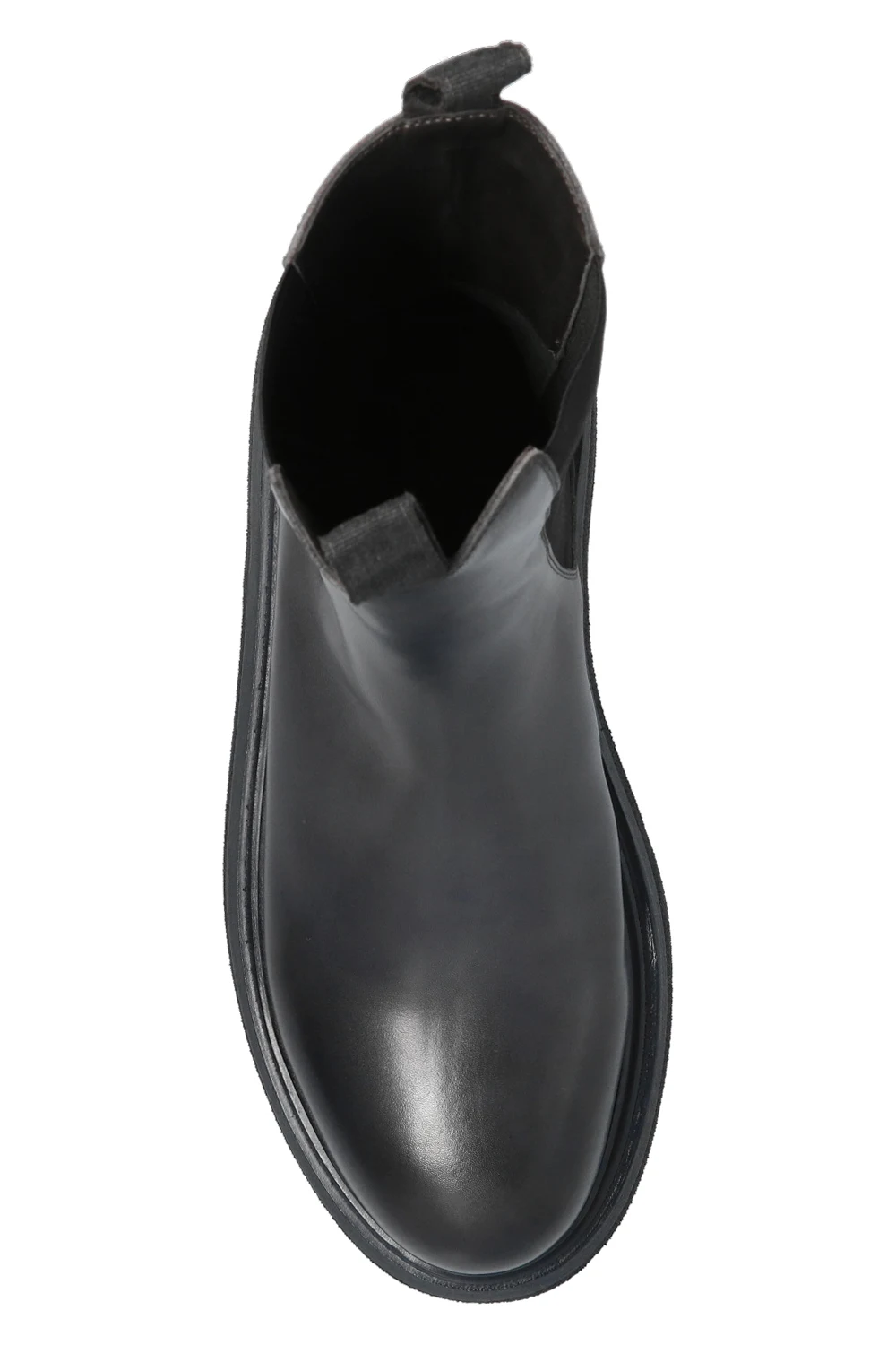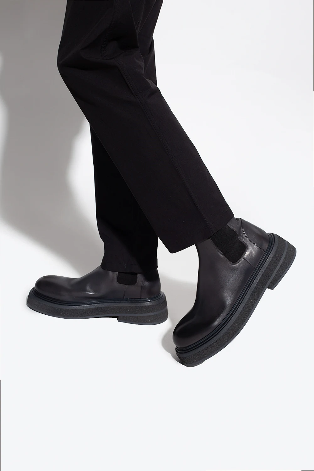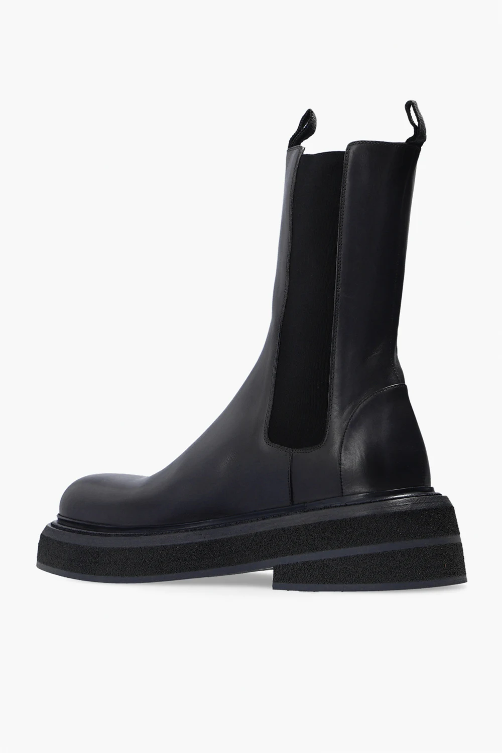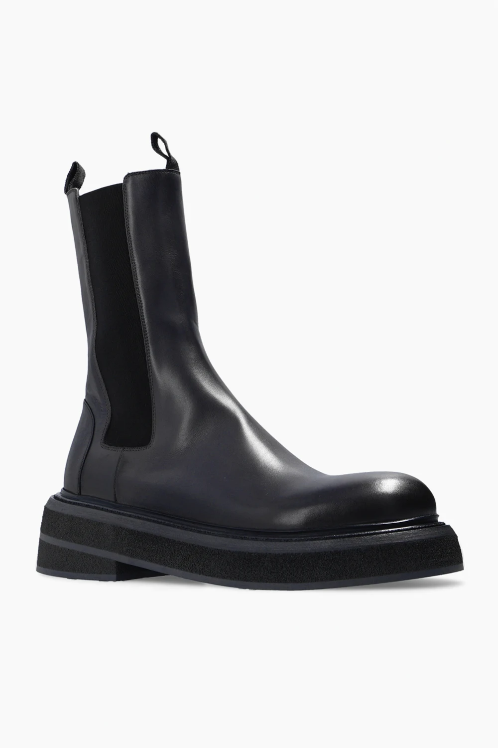 Dark grey ankle boots from Marsll. Crafted from calf leather, they sit on a dark grey rubber platform and feature elastic panels on the sides.