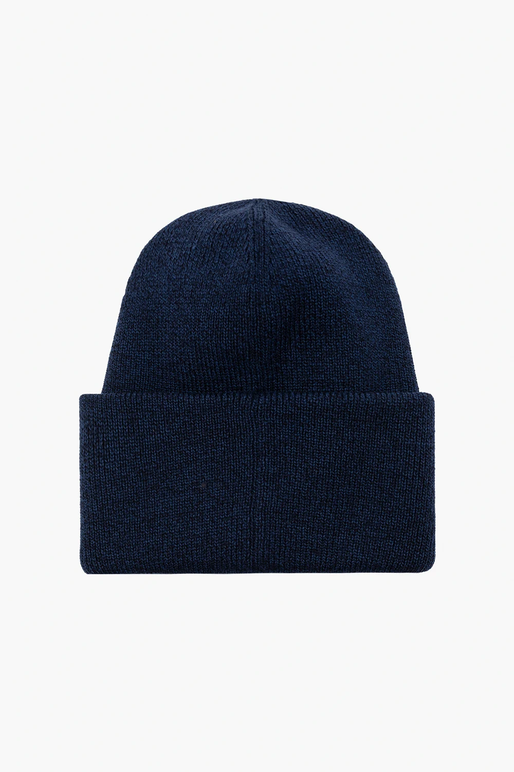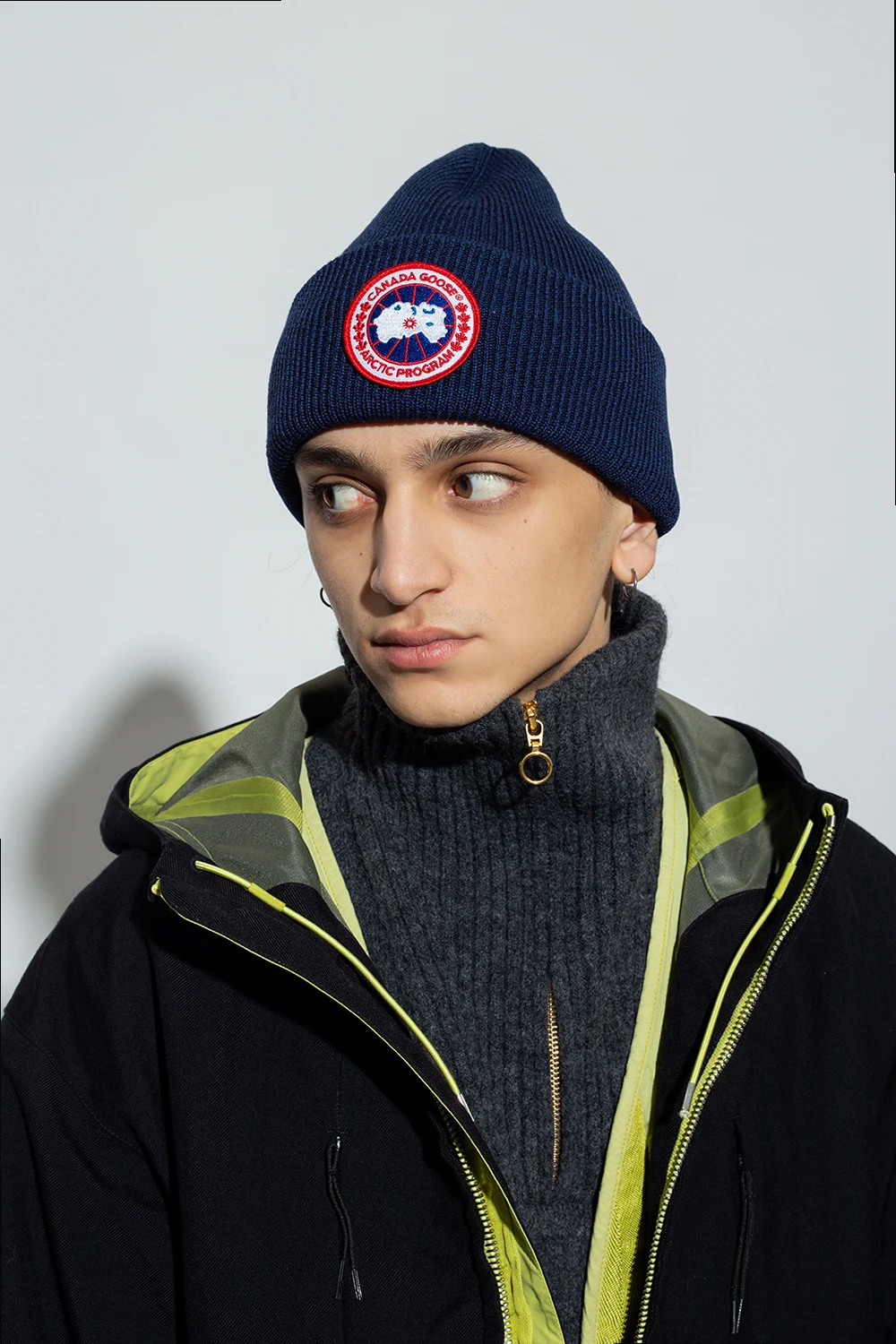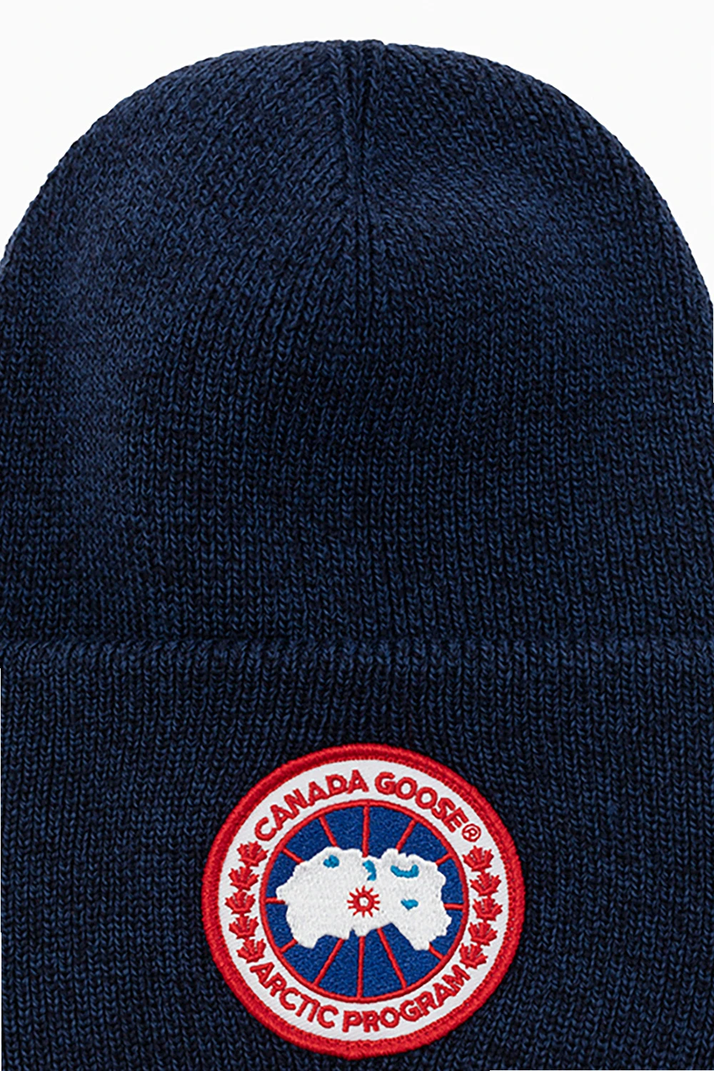 Navy blue beanie from Canada Goose. Made of wool, this item showcases a logo patch on the front.