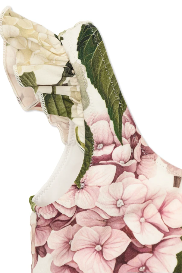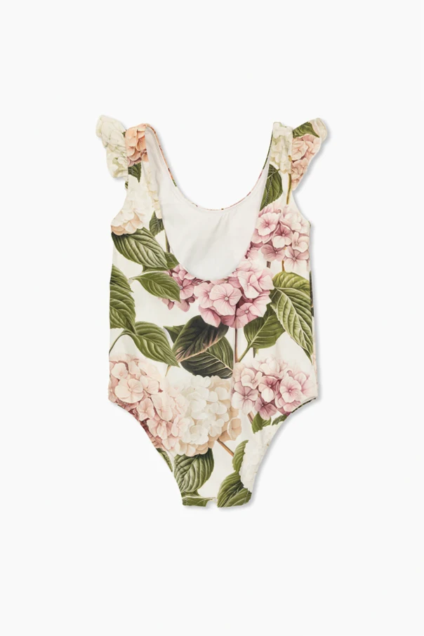 Der einteilige Badeanzug von Dolce & Gabbana Kids ist die Quintessenz kindlicher Eleganz und fröhlicher Leichtigkeit. Er begeistert durch eine raffinierte Komposition – der klassische, trägerlose Schnitt mit leicht ausgeschnittenem Rücken harmoniert perfekt mit dekorativen Volants an den Schultern, die den Charme des gesamten Looks dezent unterstreichen.