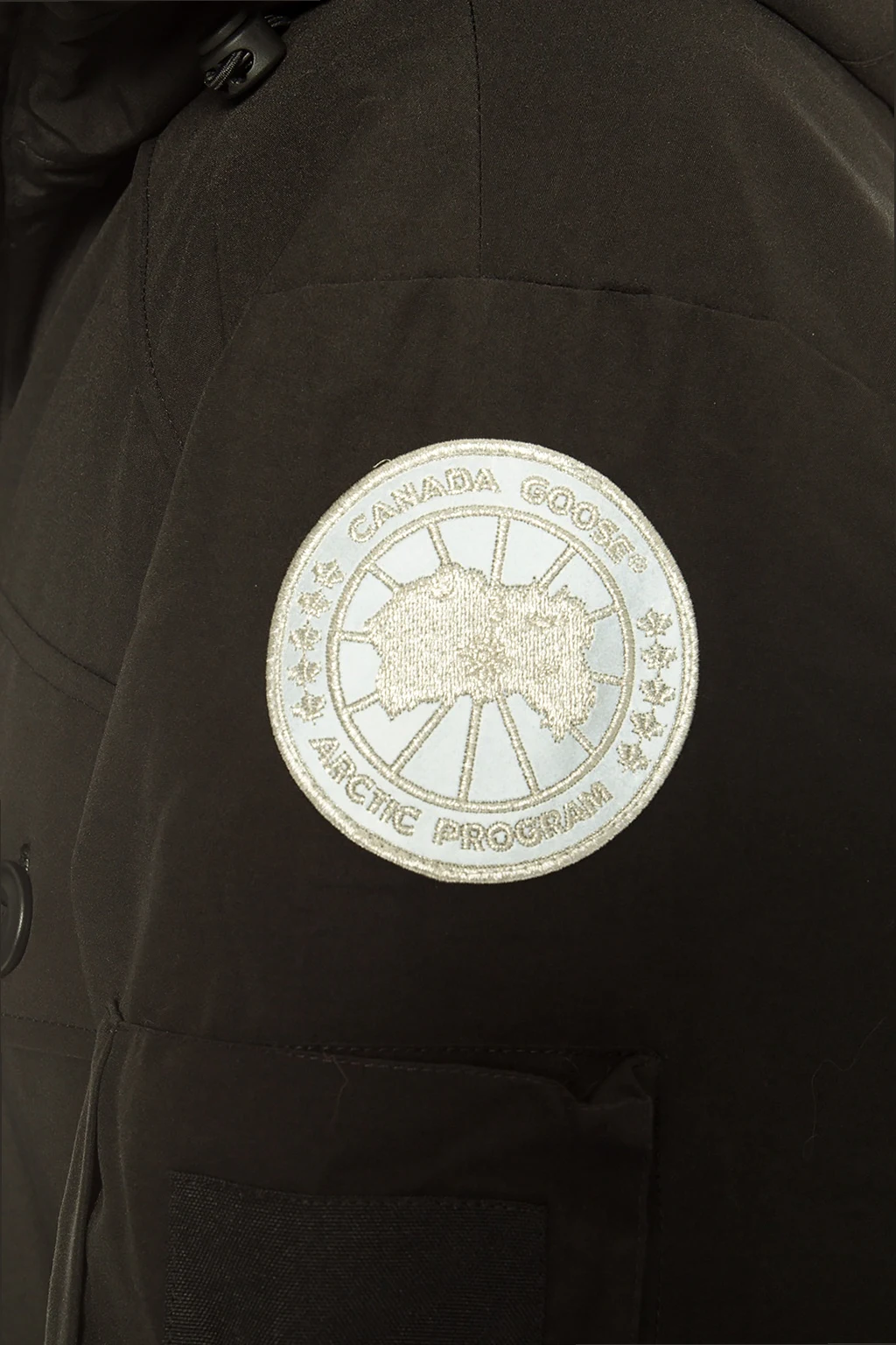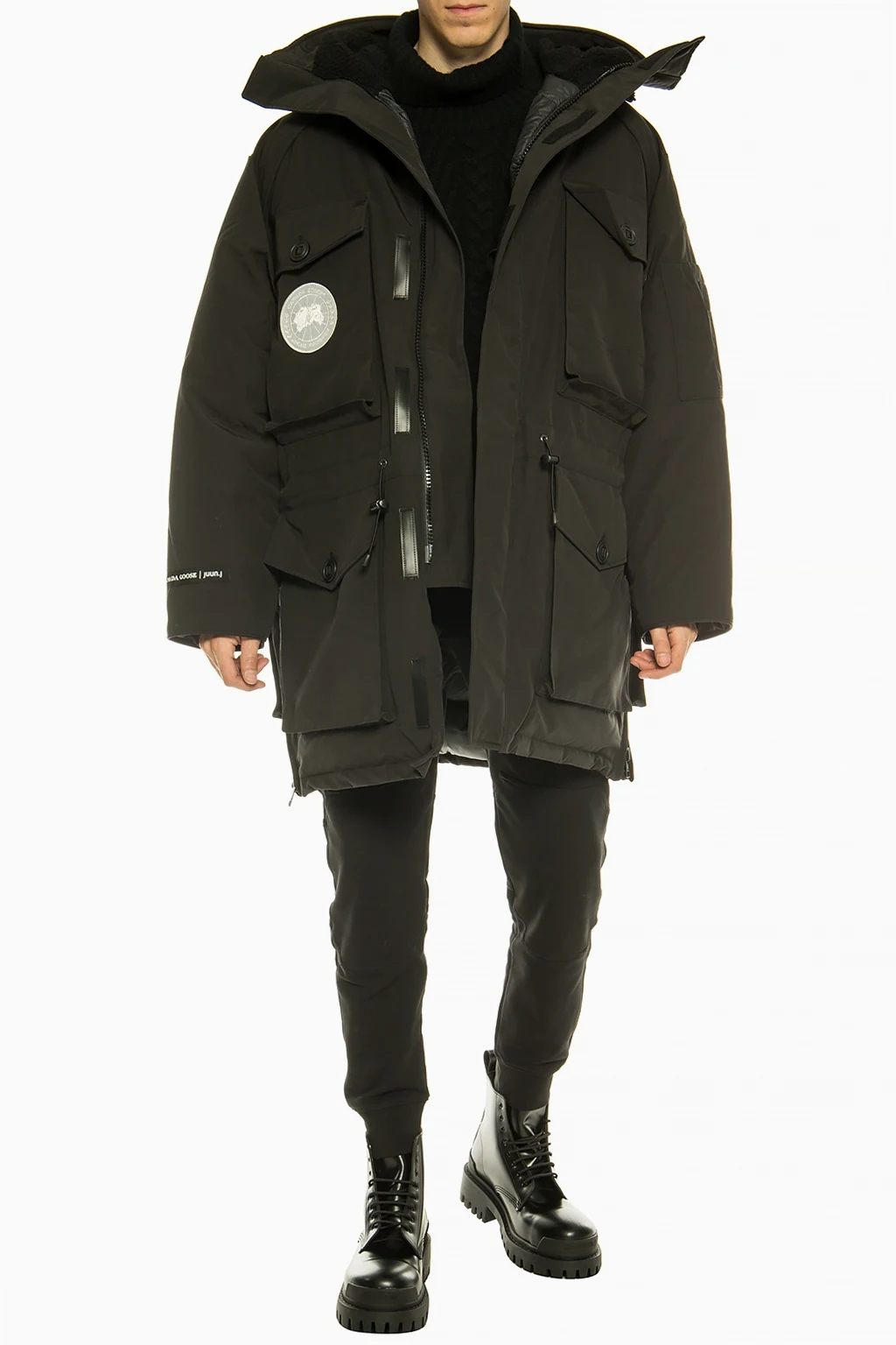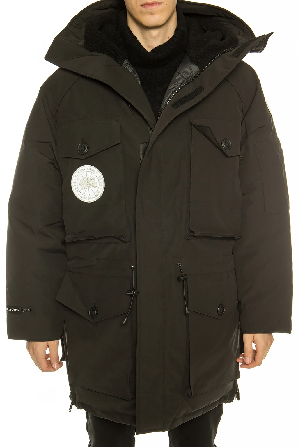 Black ‘Expedition’ hooded down jacket from Canada Goose x Juun J. Zip and velcro closure. Decorated with black, white and silver-tone logo patch. 6 button flap pockets: 4 on the front and 2 in the back. Detachable drawstring hood and drawsting waist. Long sleeves.