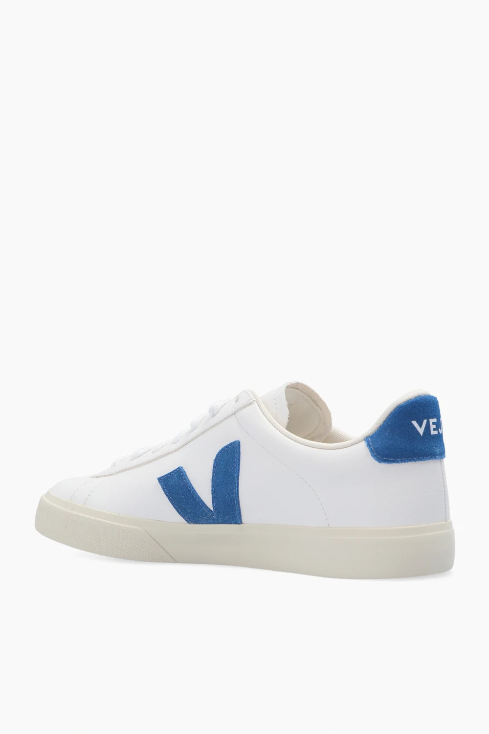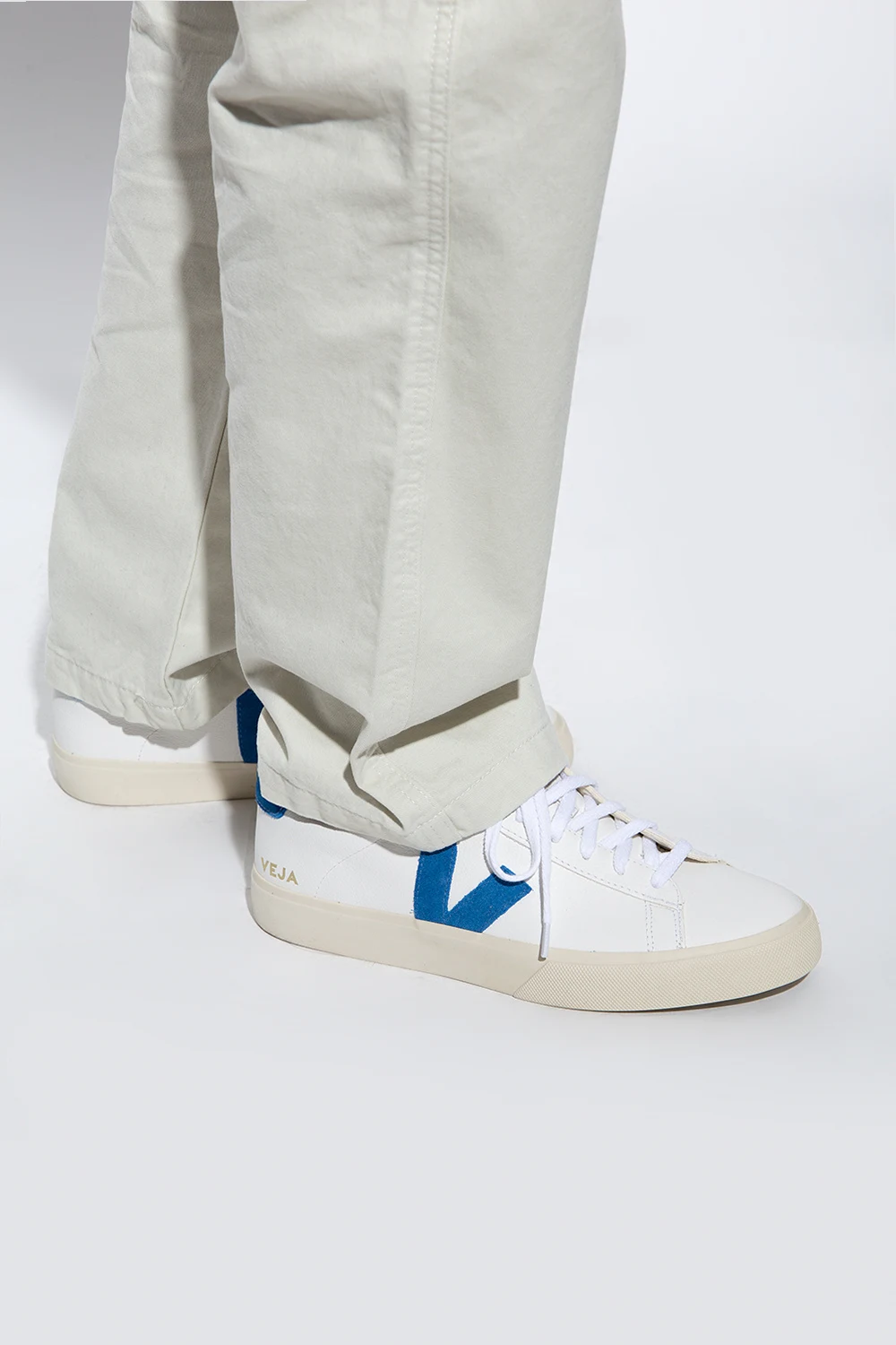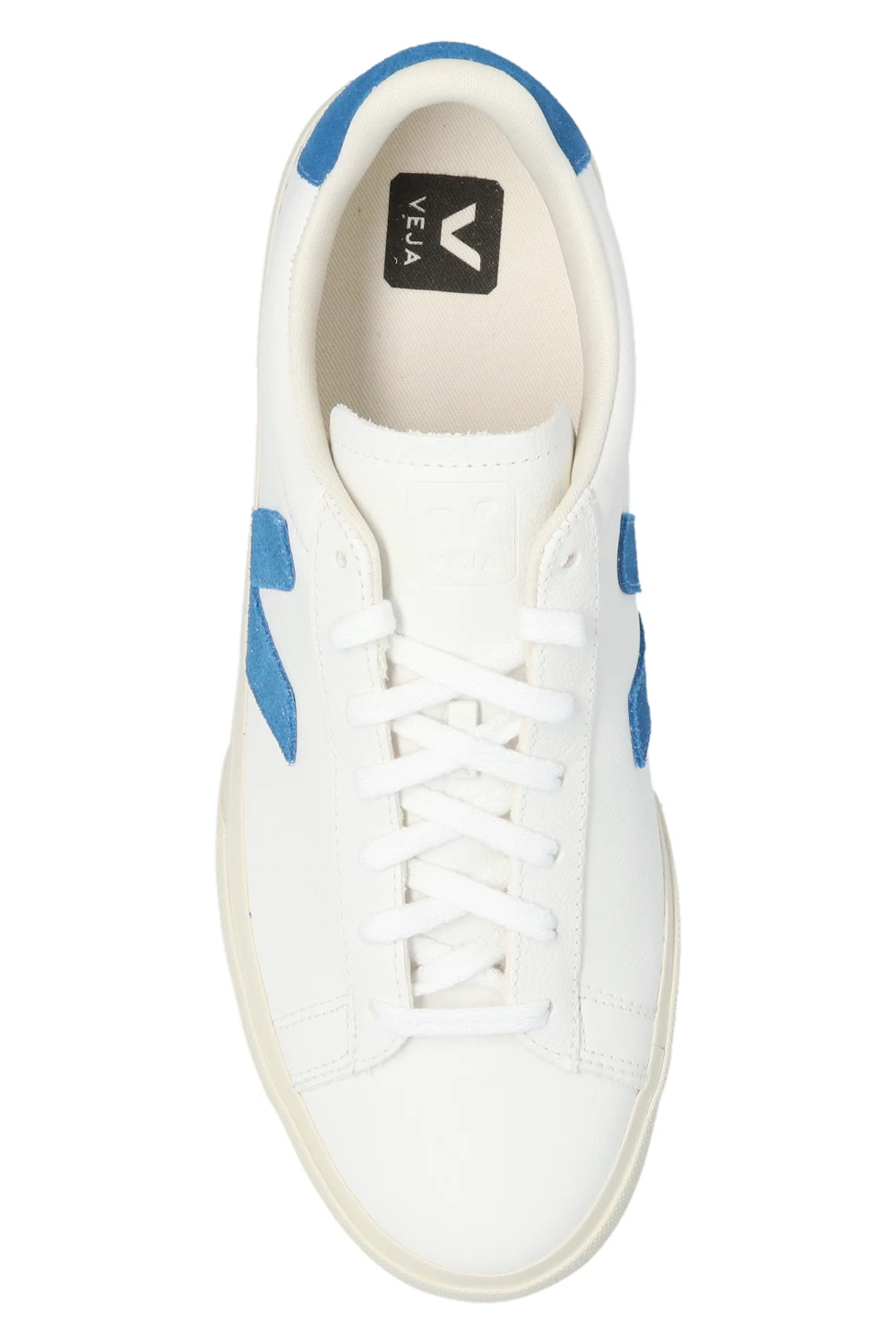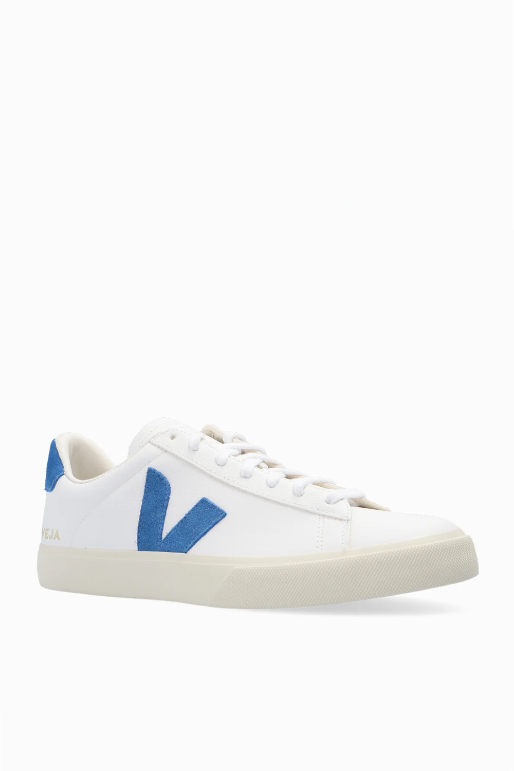 White ‘Campo’ sneakers from Veja. Crafted from chrome-free leather, this lace-up model features an embossed logo on the tongue, the brand's signature dark blue logo patch in rubber and vegan suede and organic cotton shoelaces. The mesh inner lining made from recycled materials was developed to acquire a better resistance to friction. The organic-sourced and recycled insole consists of sugar cane, Amazon rubber, organic cotton and recycled EVA. It is set on a cream rubber sole made from organic and recycled materials. This leather undergoes an innovative tanning process where no chrome, heavy metals or dangerous acids are involved. By simplifying the tanning process, the use of chemicals and energy is limited, the use of water is reduced by about 40% and the use of salt by 80%. After tanning, the water is recyclable.