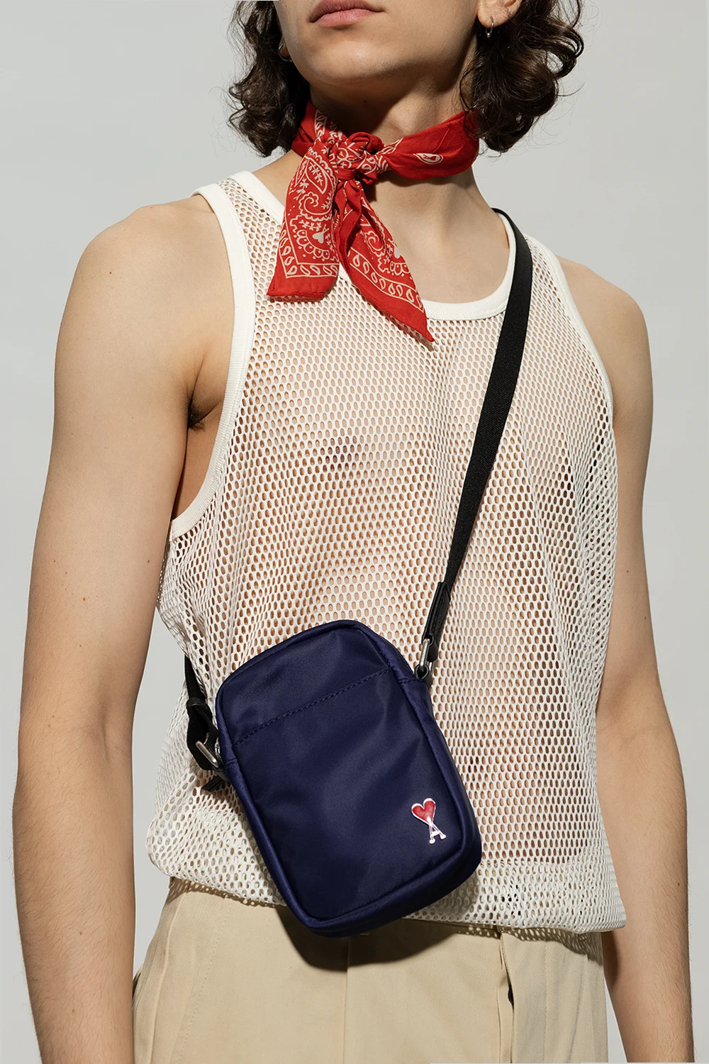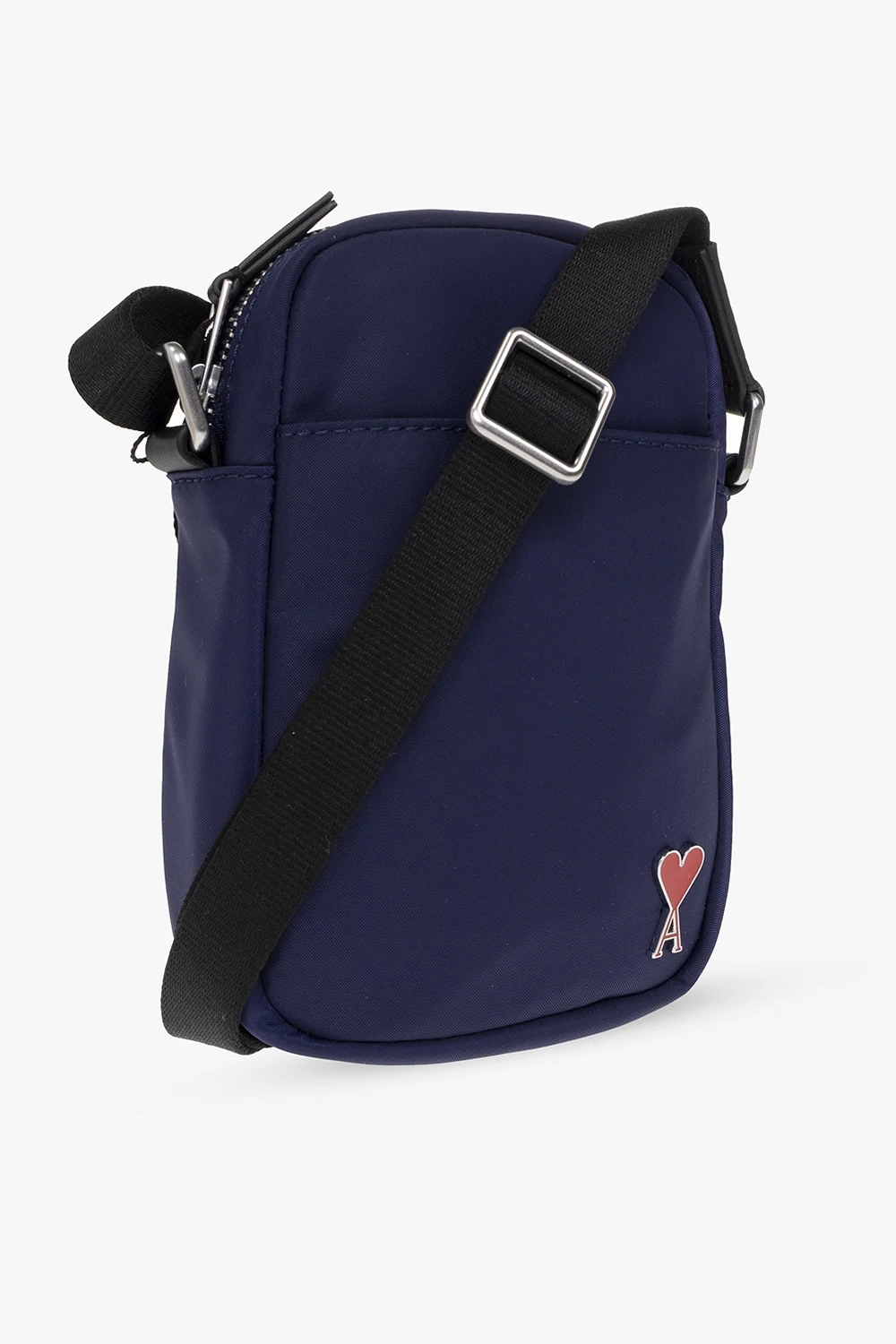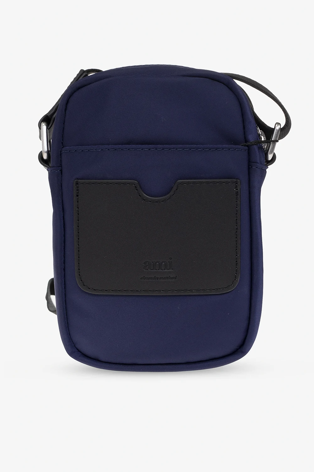 Navy and black shoulder bag from Ami Alexandre Mattiussi. Made of leather-trimmed fabric, this model is complete with a zip fastening, front pocket, silver-tone and red logo detail, slip pocket and one card slot at the back, adjustable strap, silver-tone metal hardware and one internal compartment with one slip pocket.