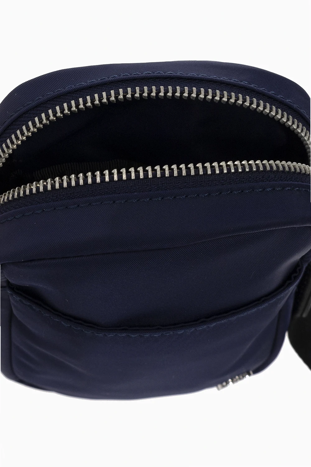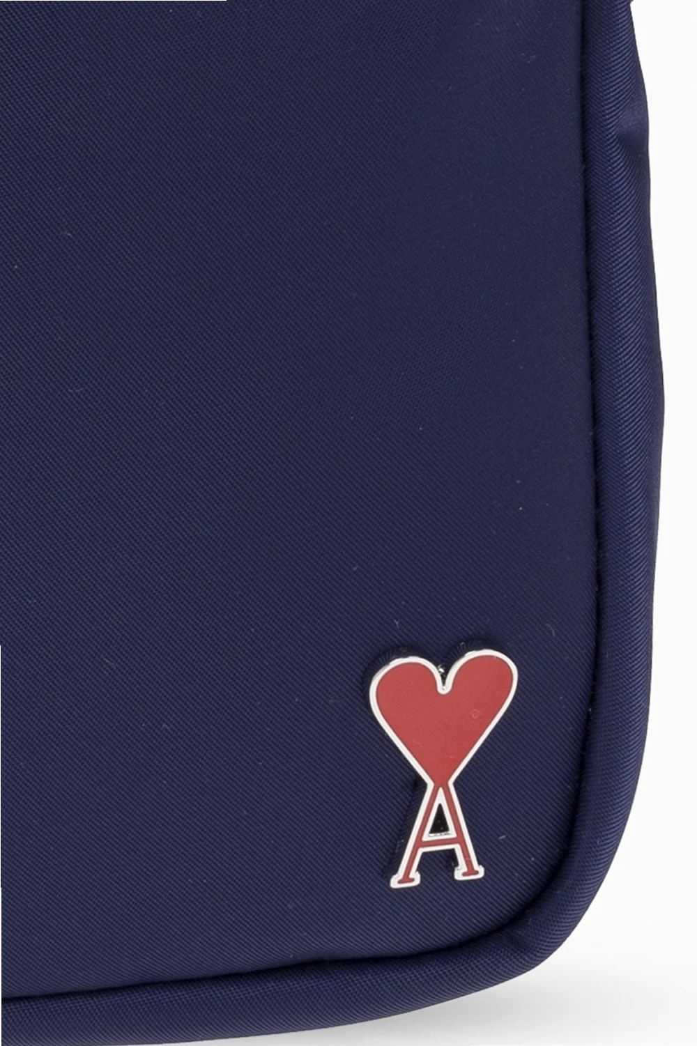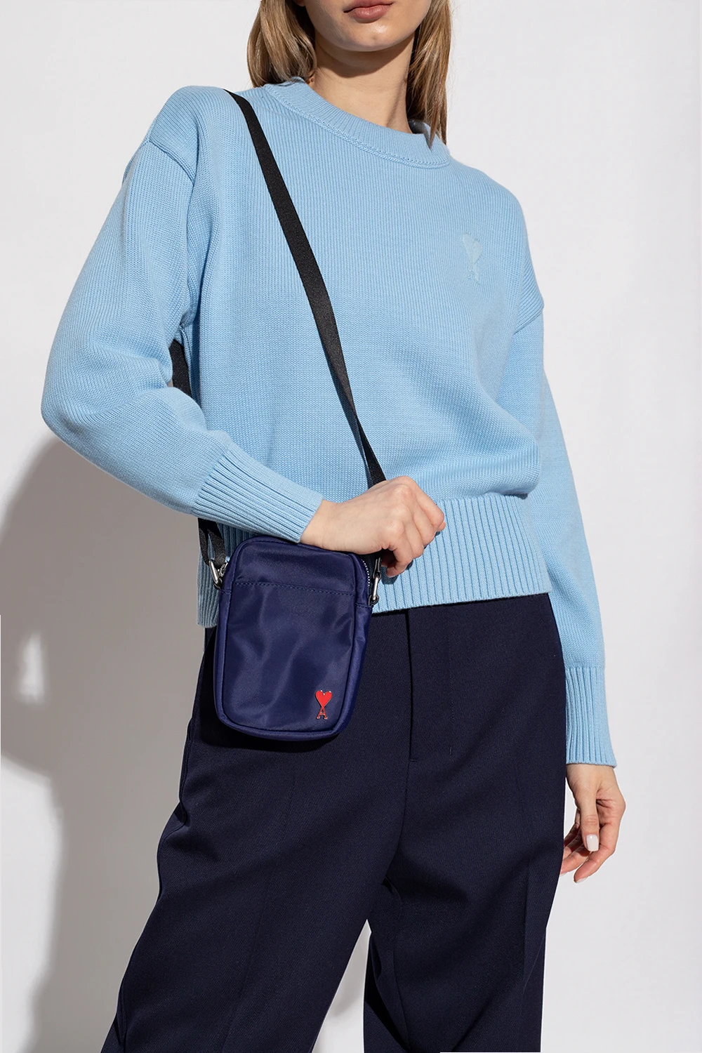 Navy and black shoulder bag from Ami Alexandre Mattiussi. Made of leather-trimmed fabric, this model is complete with a zip fastening, front pocket, silver-tone and red logo detail, slip pocket and one card slot at the back, adjustable strap, silver-tone metal hardware and one internal compartment with one slip pocket.