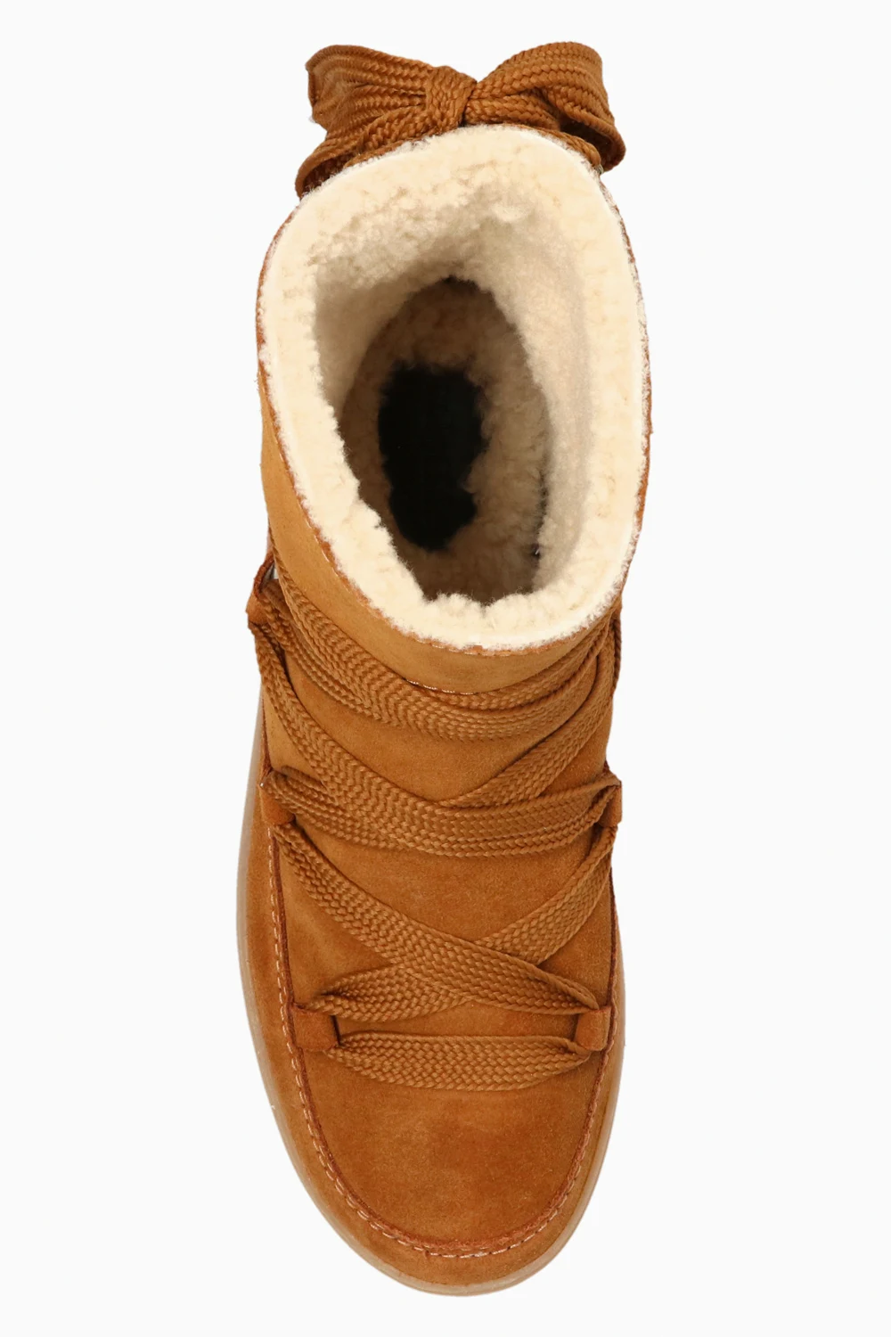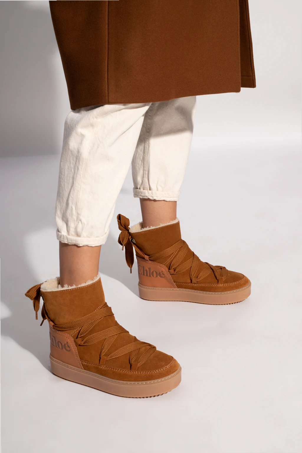Brown ‘Charlee’ suede ankle boots from See By Chloé. Crafted from suede, this pair is complete with an embossed logo, decorative ankle ties, shearling lining and brown rubber sole.