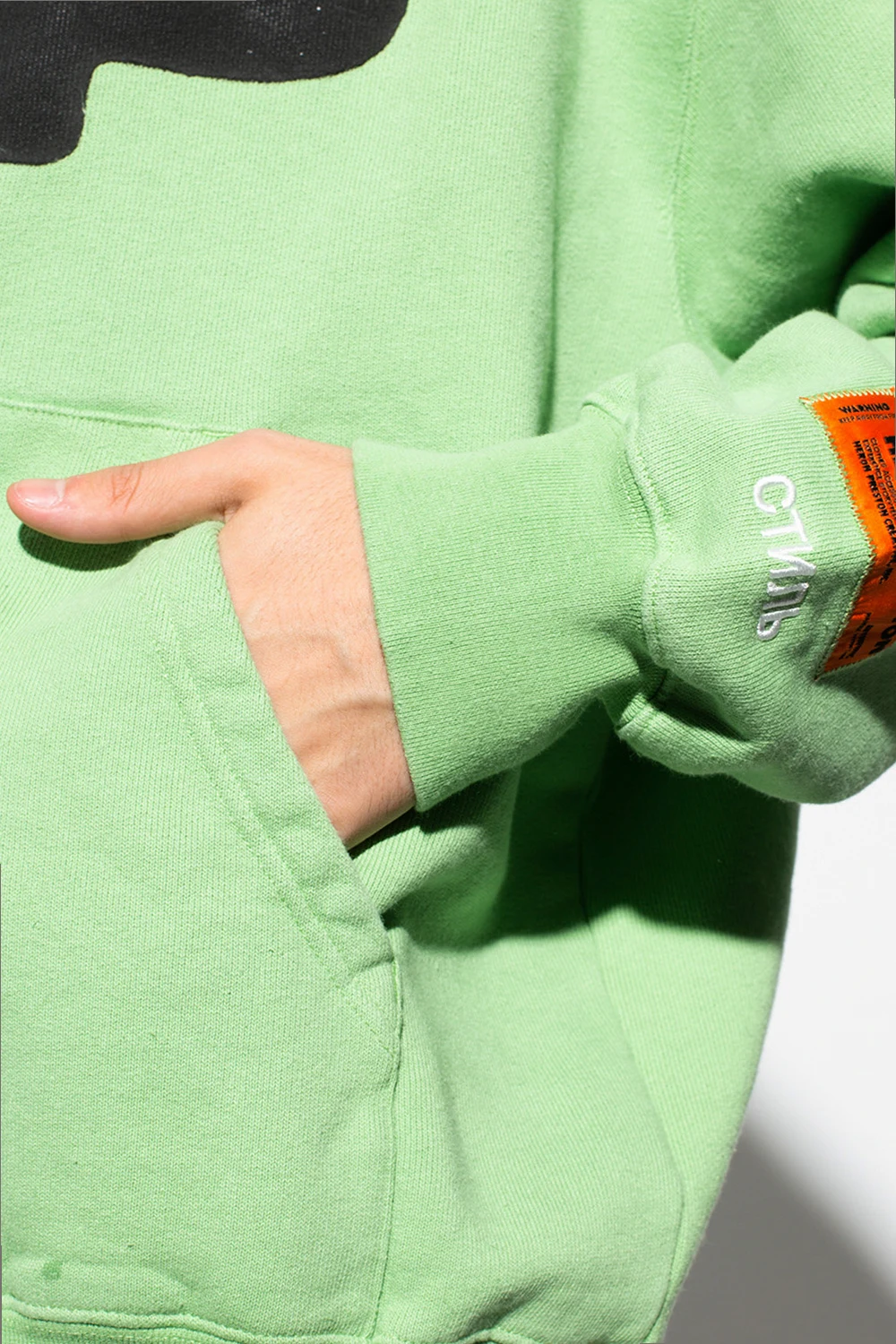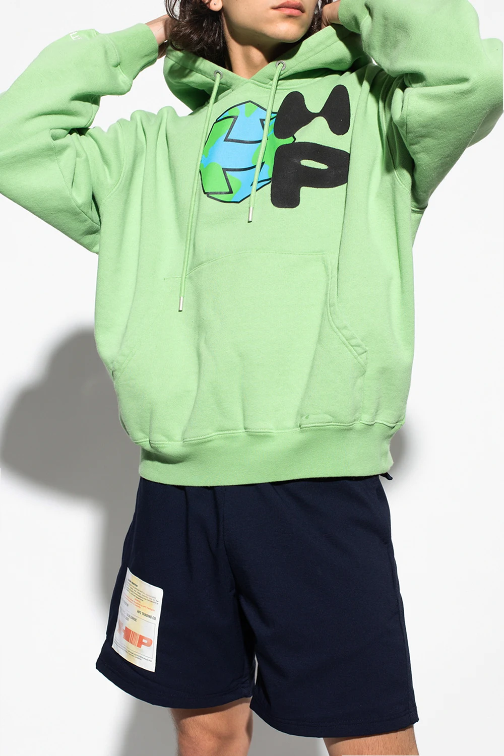 Green hoodie from Heron Preston. Made of organic cotton, this garment features a multicolored print, front pocket, drawstring hood and ribbed trims at the hem and cuffs.