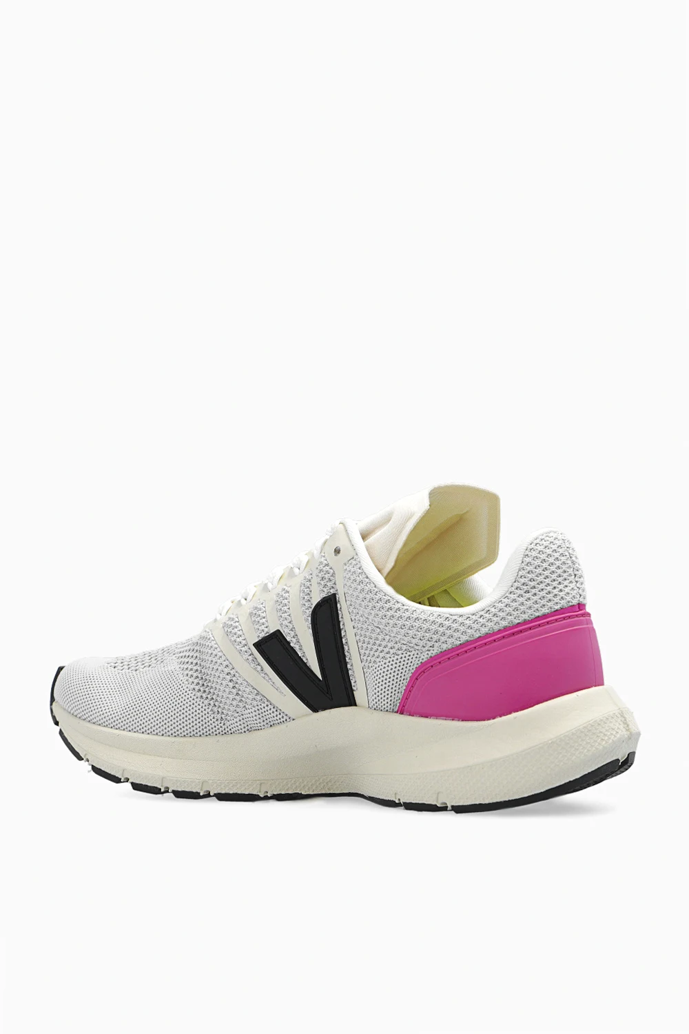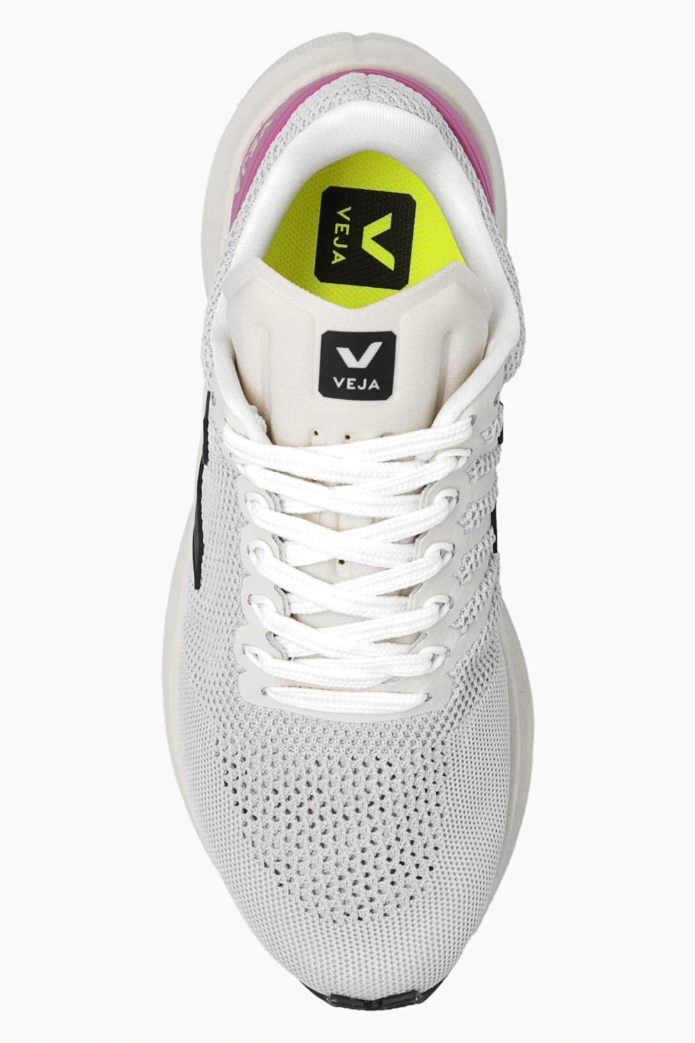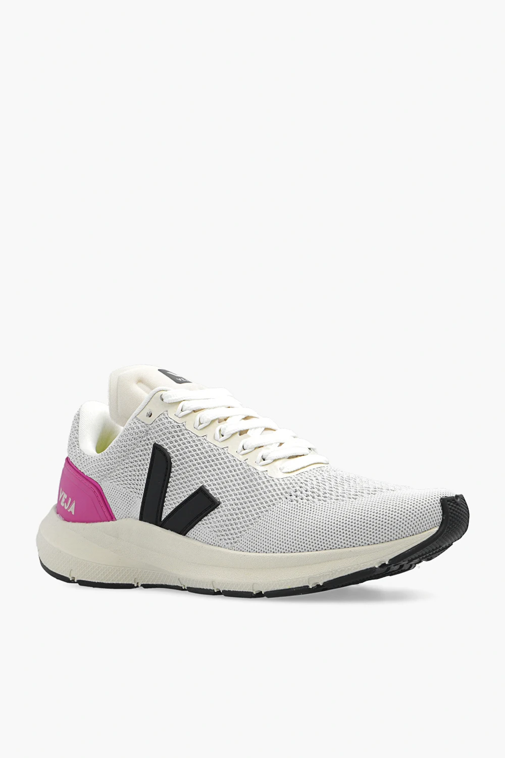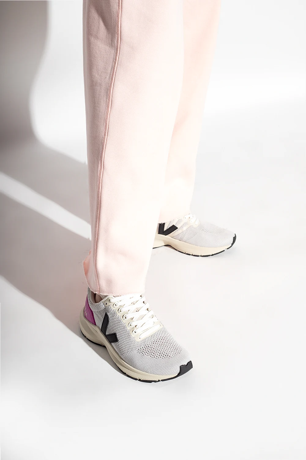 Light grey and beige ‘Marlin V-Knit’ sneakers from Veja. Crafted from V-Knit which is made of 100% recycled plastic bottles, this lace-up model features a heel counter and the brand's signature V patch made of Pebax® Rnew®(that contains 62% castor oil). The organic-sourced and recycled insole consists of sugar cane, Amazon rubber, organic cotton and recycled EVA. It is set on a black and beige rubber sole made from organic and recycled materials.