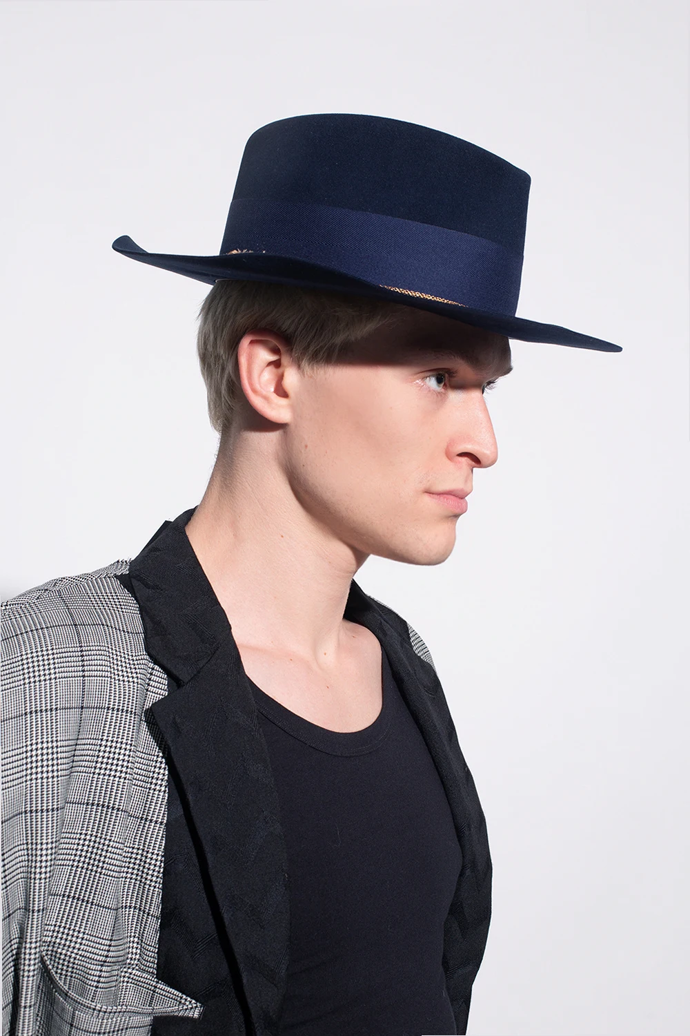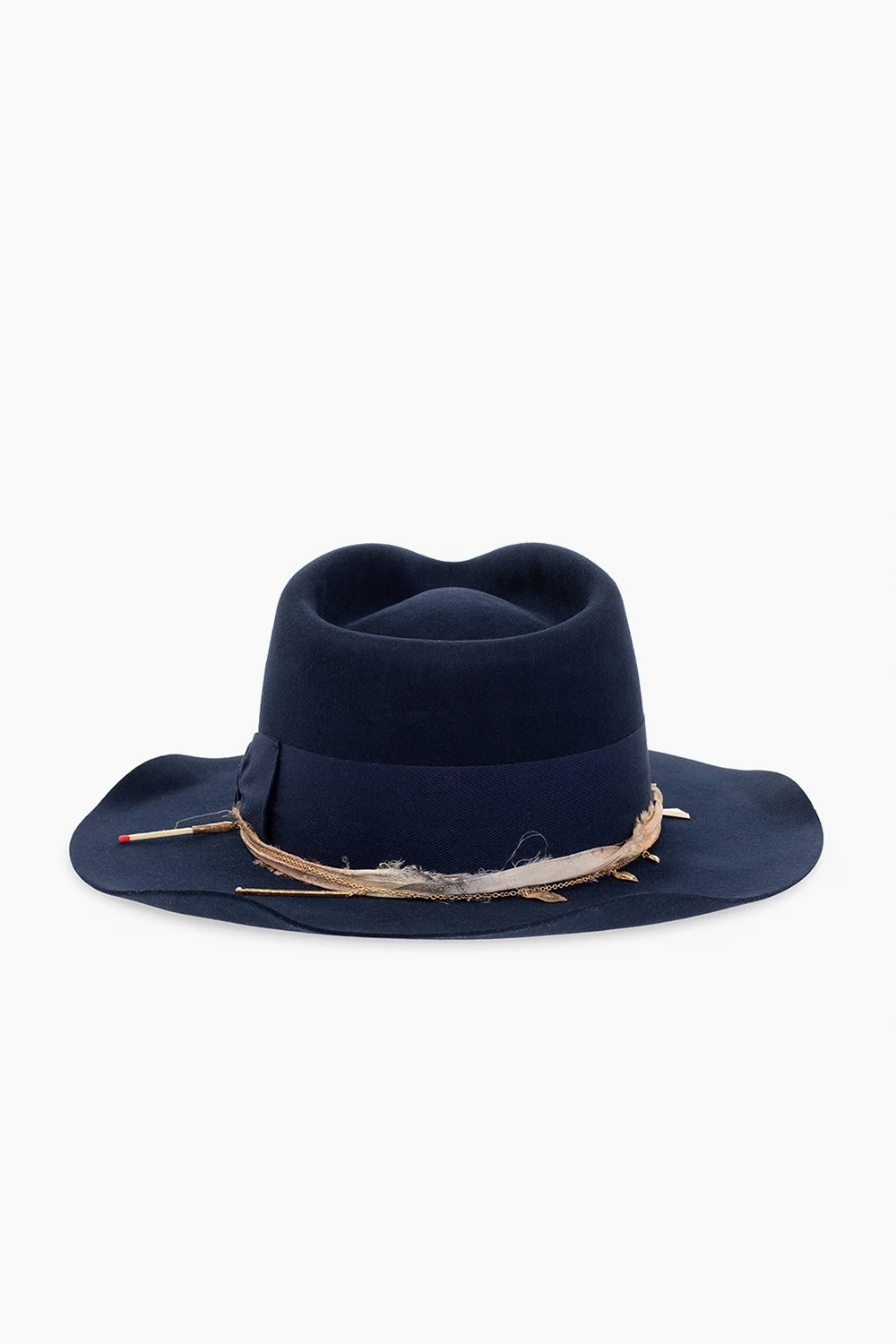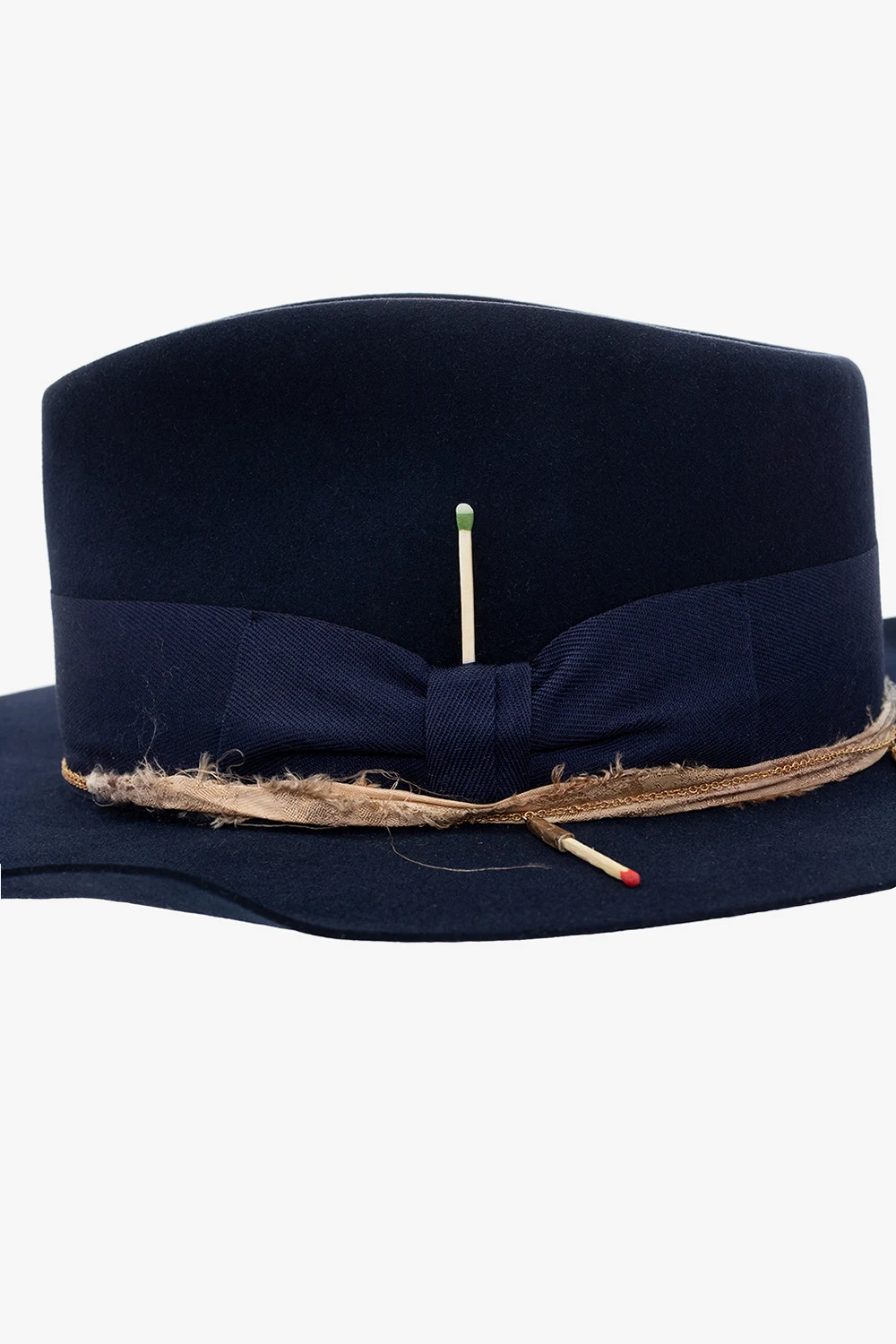 Navy ‘Terrell’ hat from Nick Fouquet. Crafted from felt, this model features a chain with gold-tone charms and a navy grosgrain ribbon with a bow and the iconic matchstick.