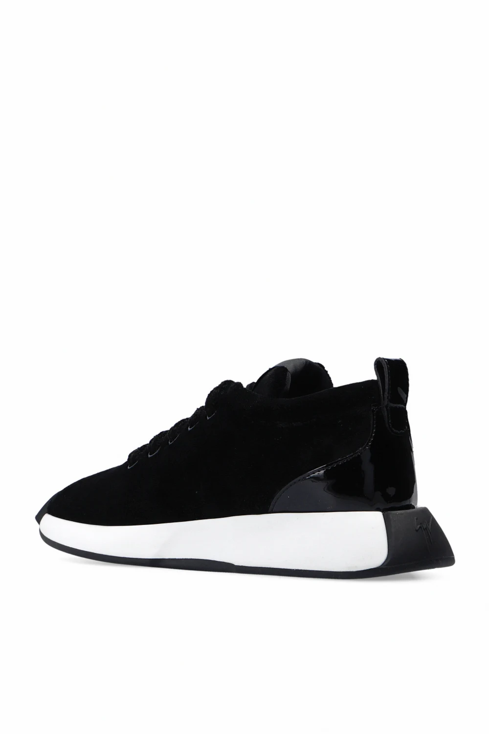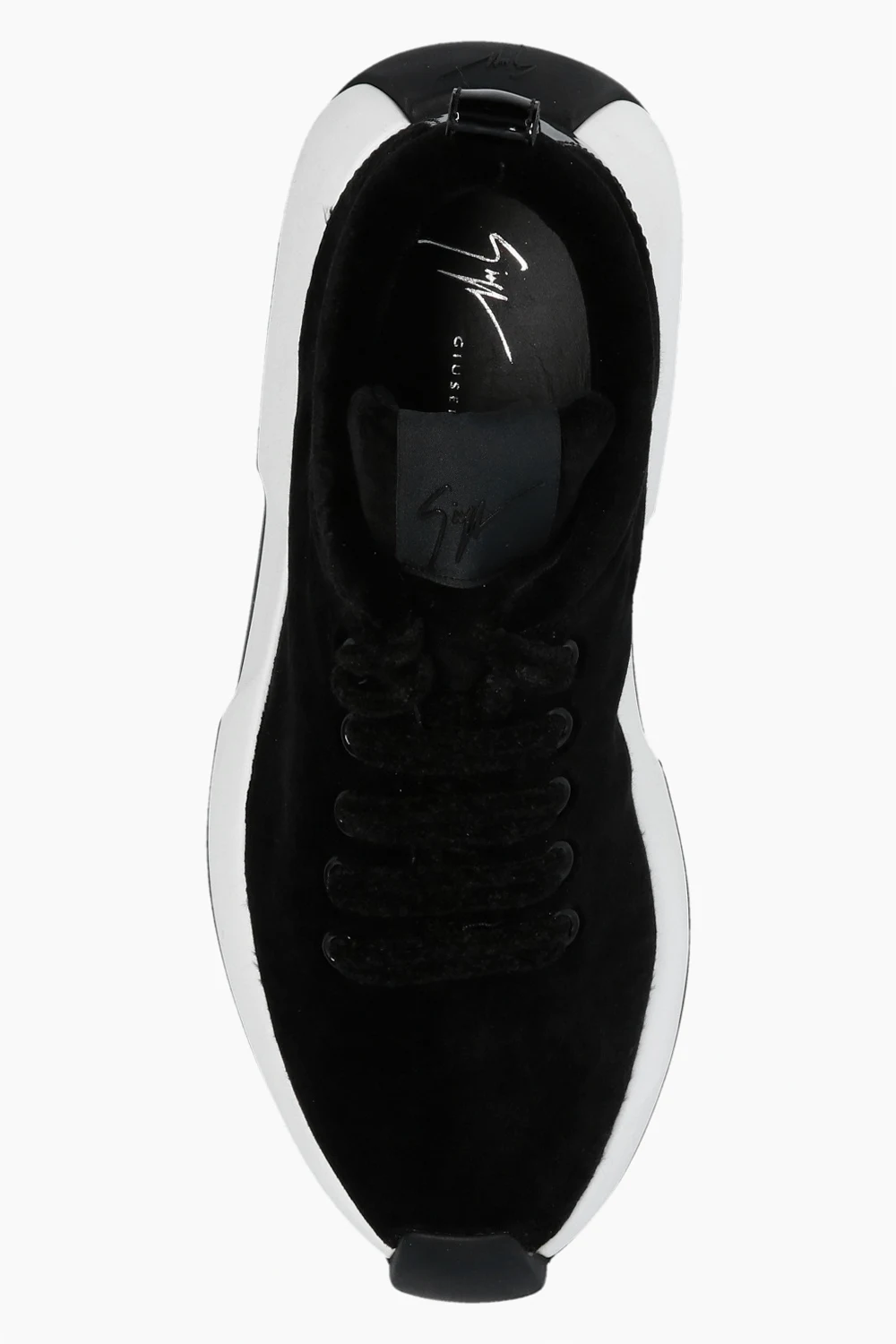Black ‘Verona’ sneakers from Giuseppe Zanotti. Crafted from leather with velvet trims, this model is complete with a raised logo appliqué on the tongue and rubber sole in white and black.