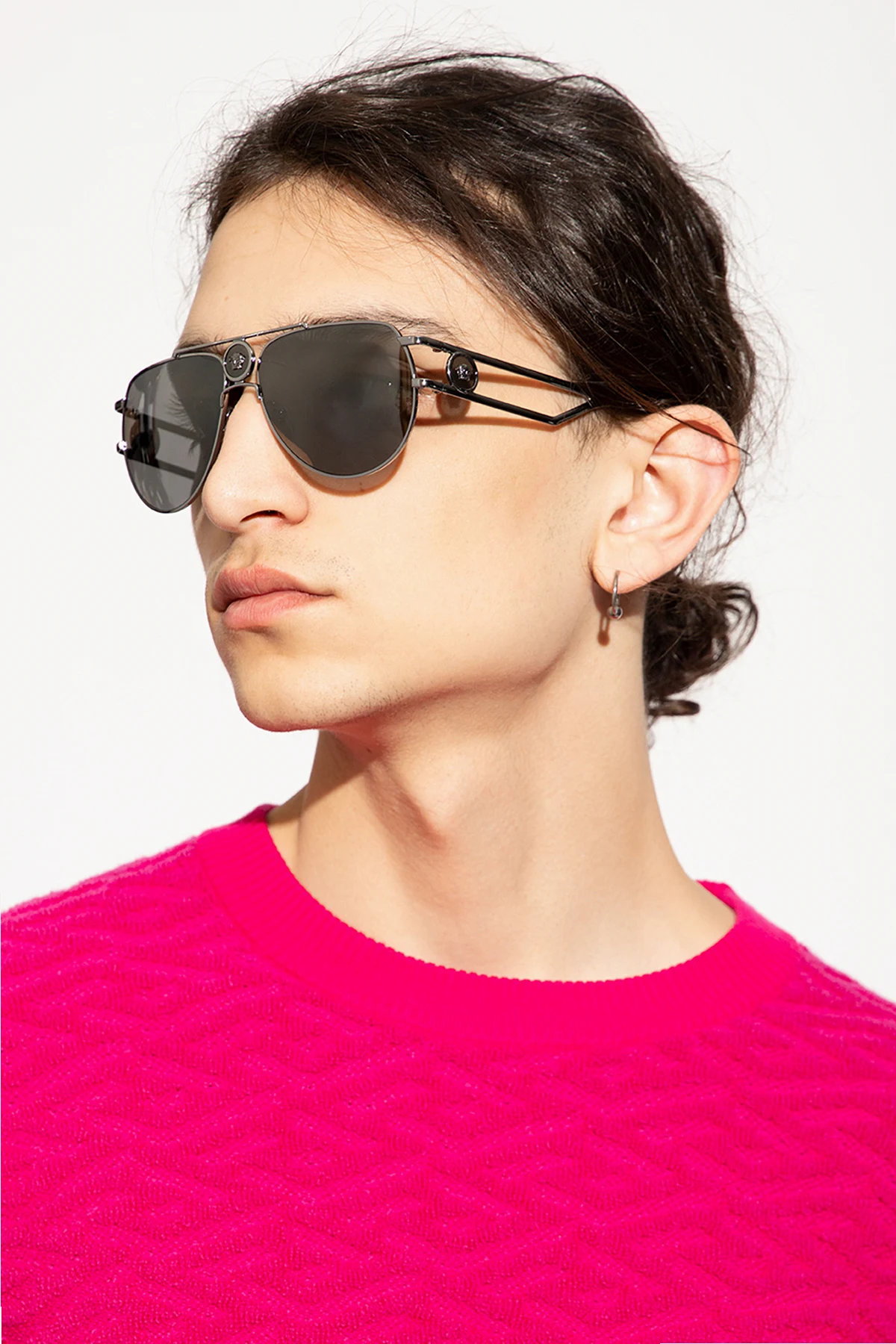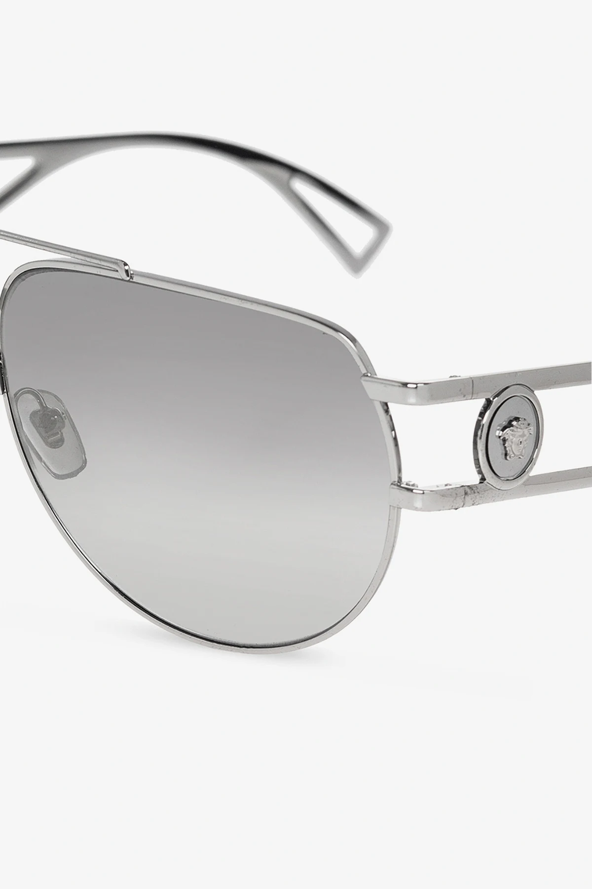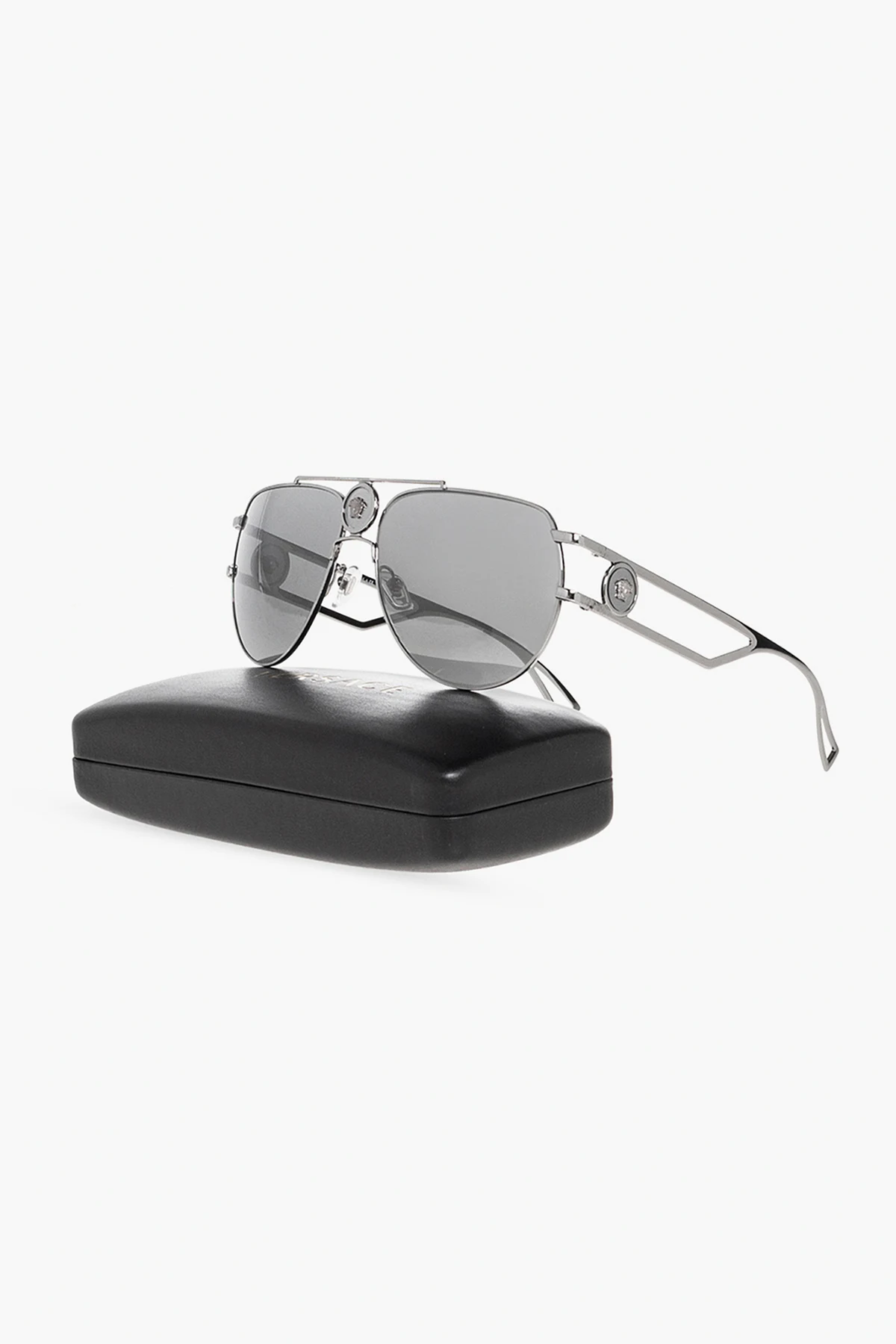 Silver-tone aviator sunglasses from Versace. This pair has temples with decorative cut-outs, the label's signature metal Medusa head appliquse and grey lenses with 100% UV protection. Comes with a case.