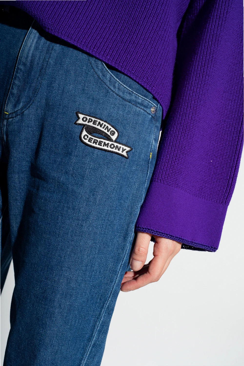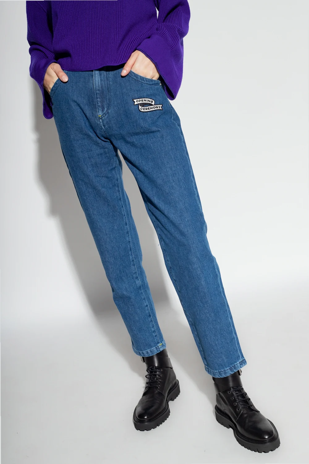 Blue high-waisted jeans from Opening Ceremony. Fastened with a zip and button, this pair is complete with a logo patch, three front pockets and two back pockets.