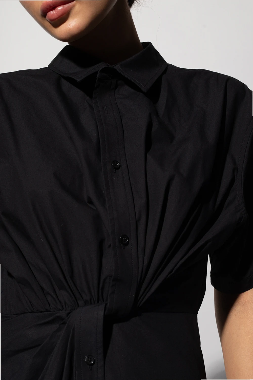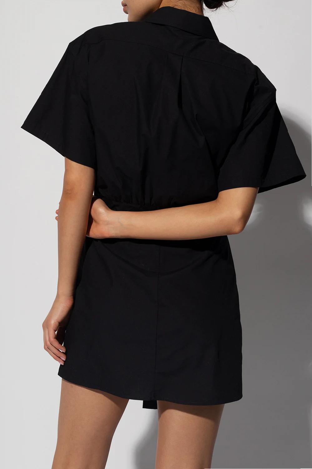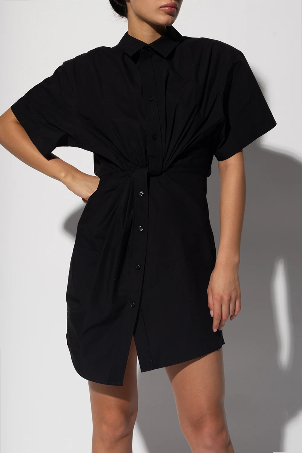 Black mini dress from Alexander Wang. Made of cotton with an asymmetrical hem, this style features a button placket, a side zip fastening, short sleeves and gathered details.
