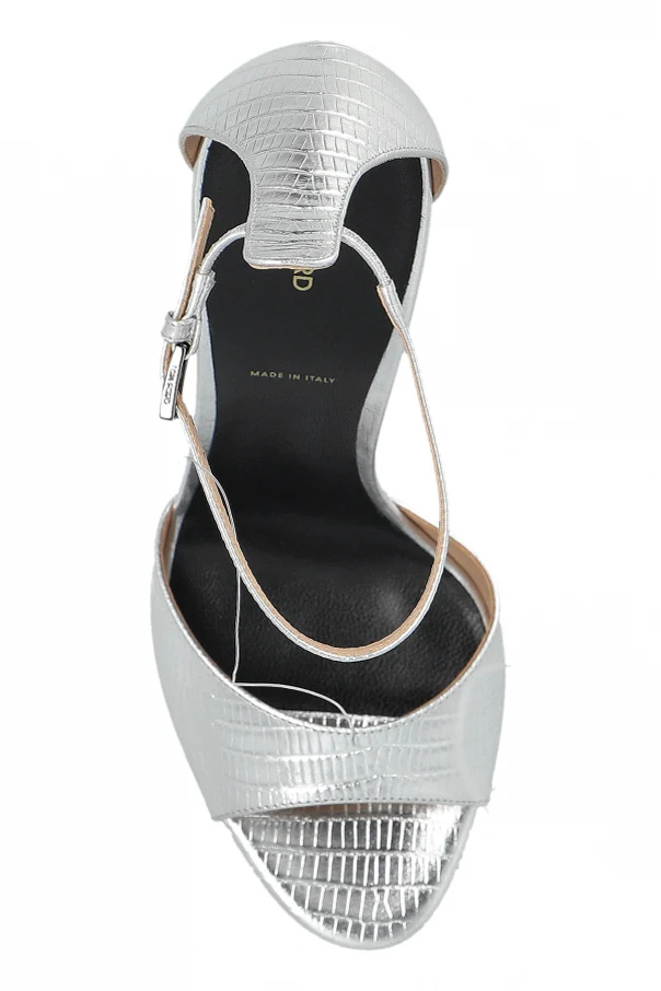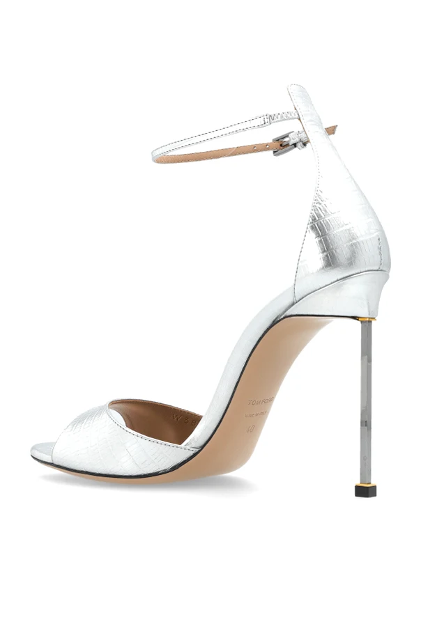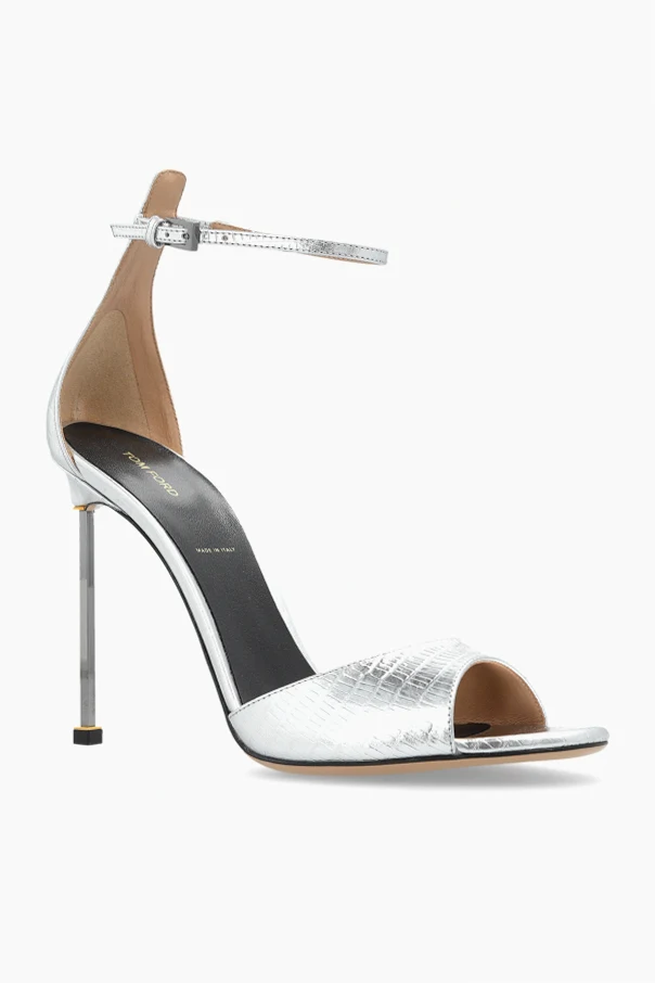 Leder-Sandalen mit Absatz der Marke Tom Ford sind Ausdruck zeitloser Eleganz und raffinierten Geschmacks. Die einzigartige Komposition aus sorgfältig geprägtem, naturbelassenem Leder mit feiner Reptilienstruktur verleiht jedem Schritt einen Hauch von Luxus und Originalität. Die dominante, silberne Farbe glänzt mit einem metallischen Schimmer und unterstreicht den anspruchsvollen Charakter der Sandalen.