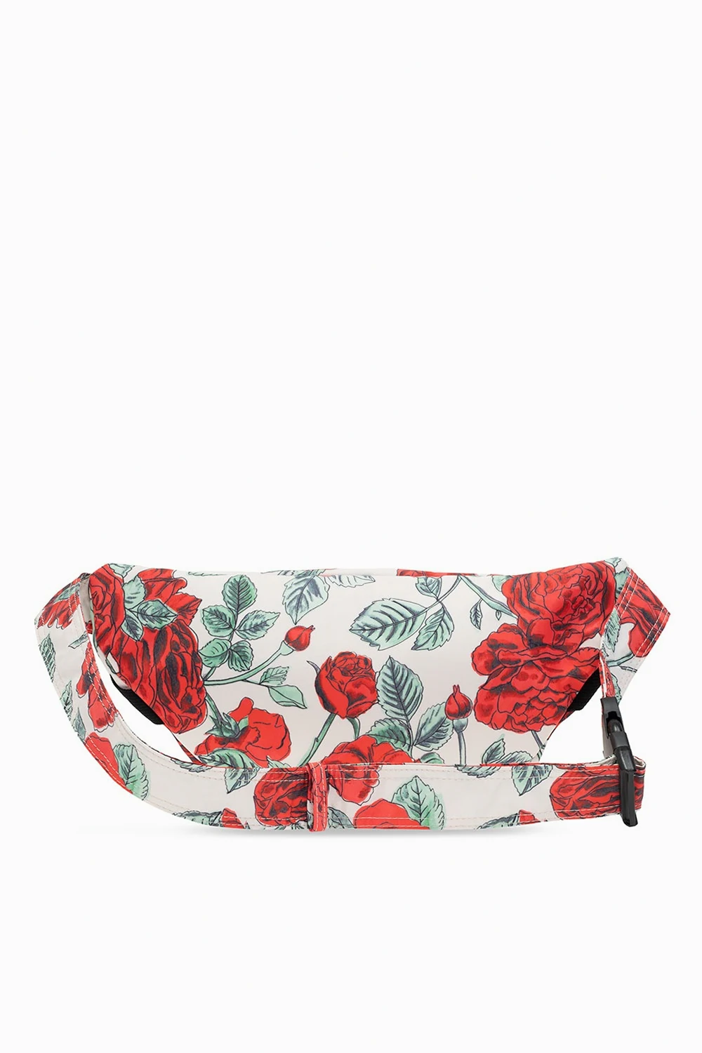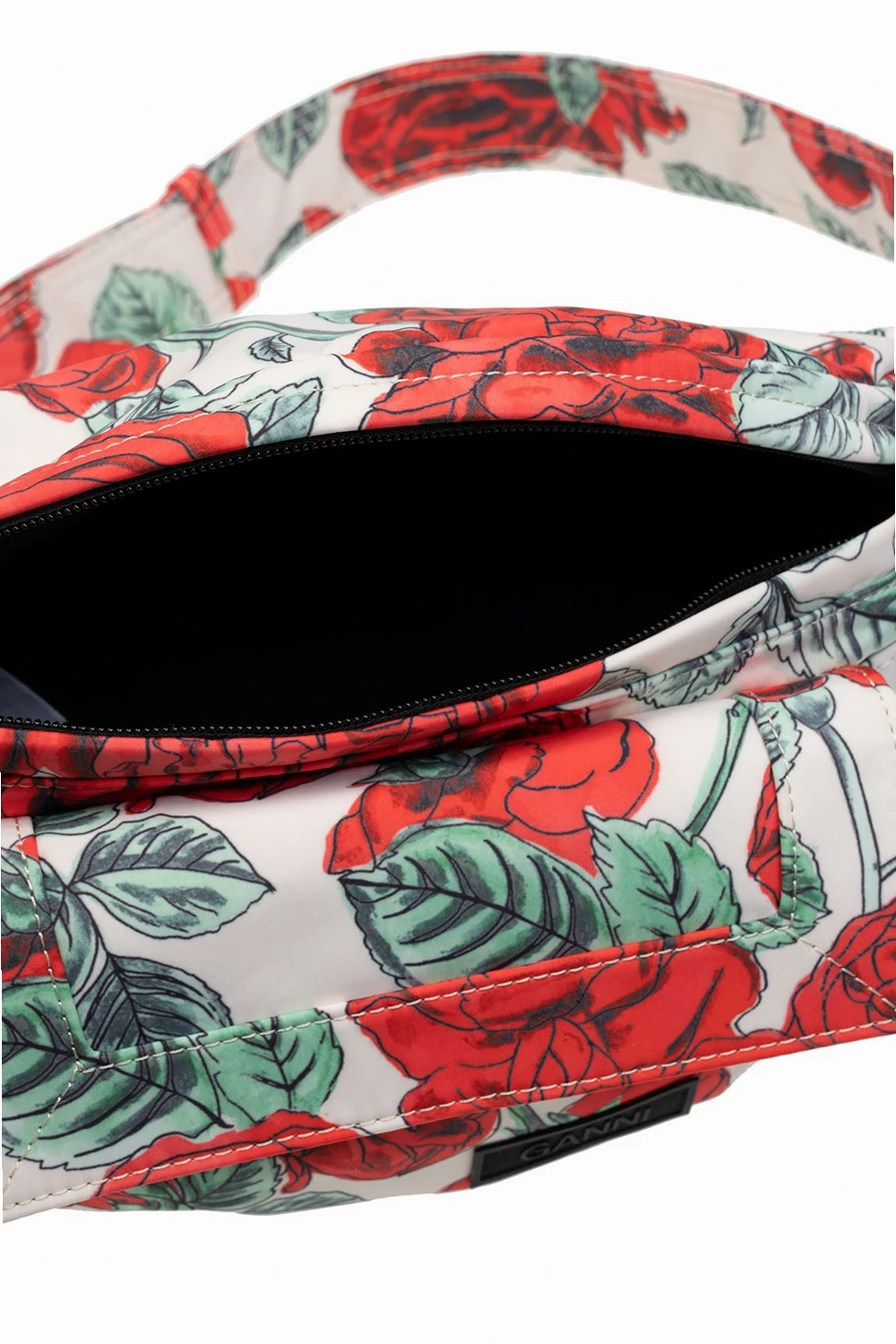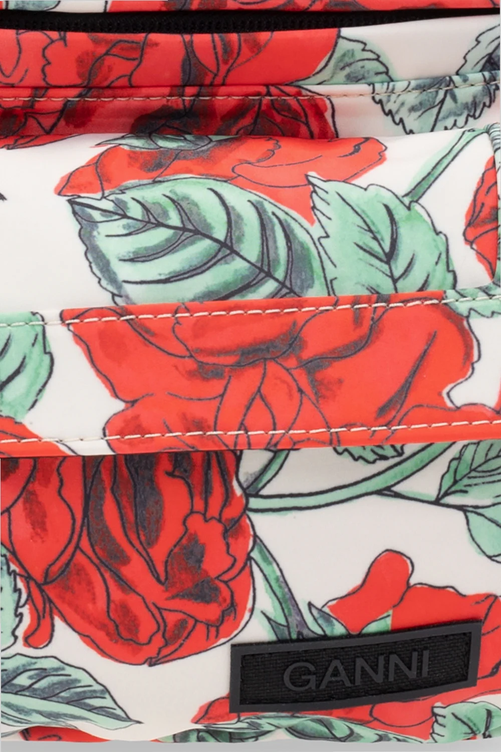 Beige belt bag from Ganni. Crafted from recycled fabric, this design features a two-way zip, red and green leopard print, logo patch, velcro-fastened flap pocket, adjustable buckle belt and one internal compartment.