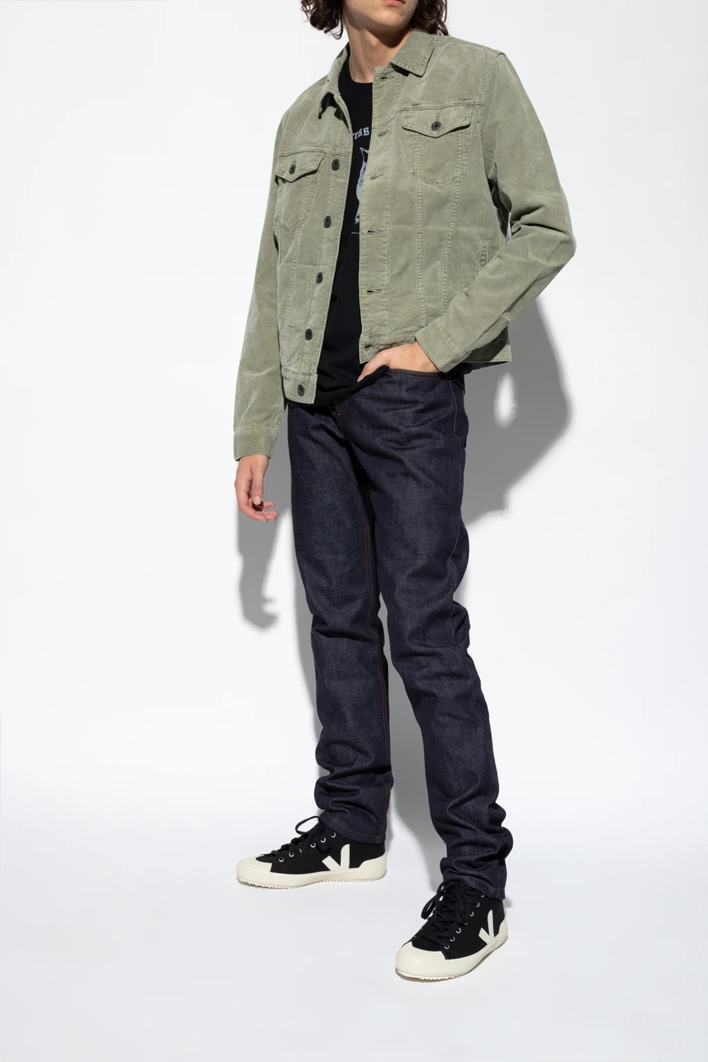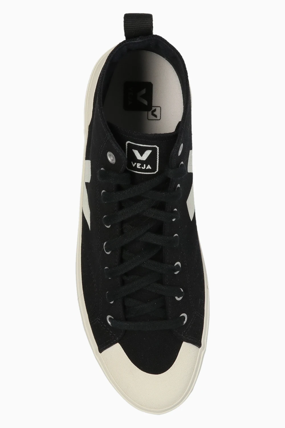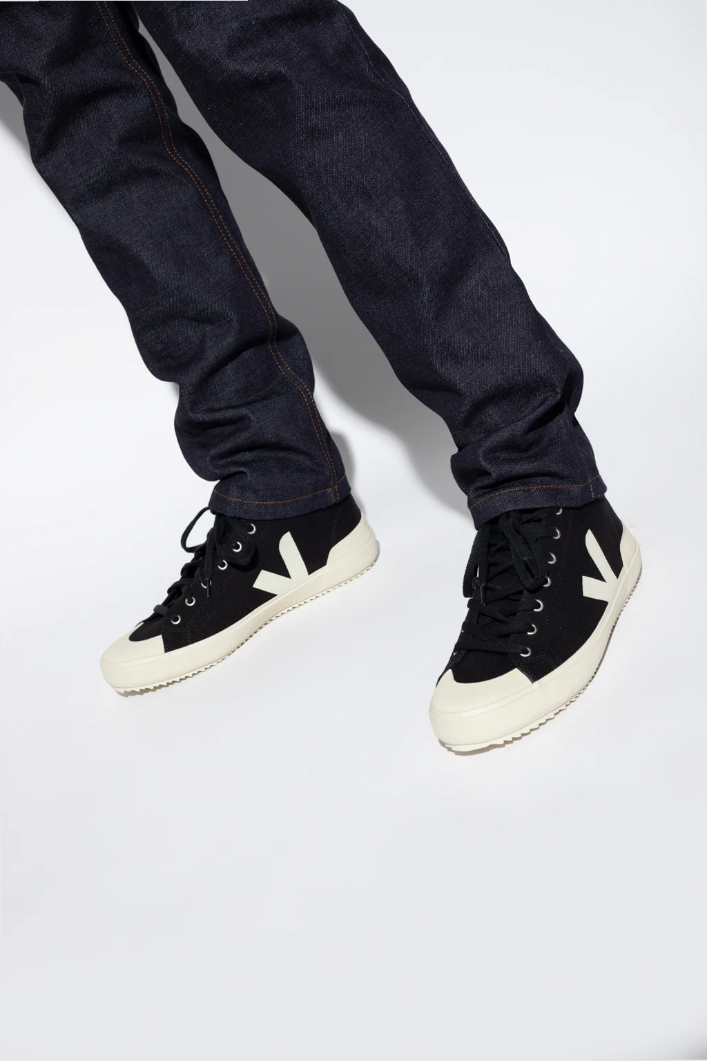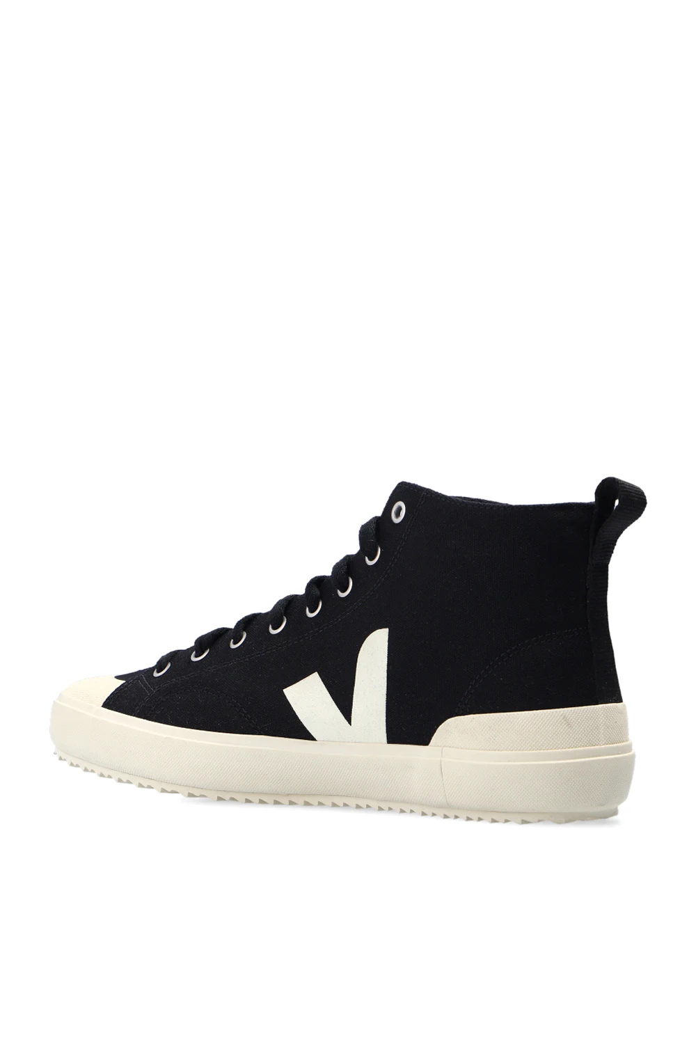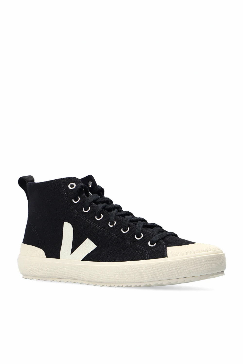 Black ‘Nova HT’ high-top sneakers from Veja. Made of organic cotton, this lace-up pair features a cream V logo and silver-tone metal hardware. The insole is produced from wild rubber, sugar cane, Amazon rubber, organic cotton and recycled EVA. It is set on a cream rubber sole made of organic and recycled materials.