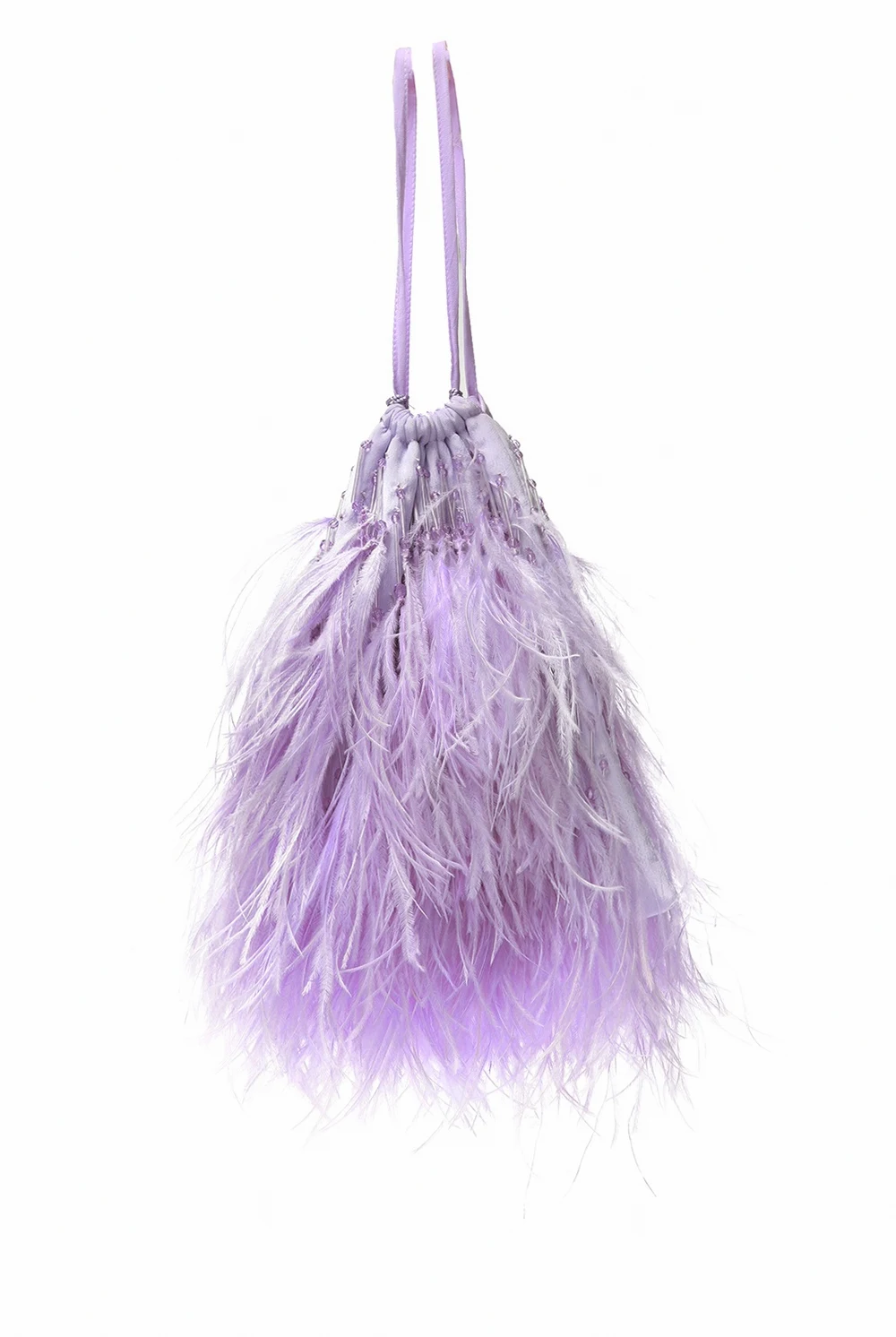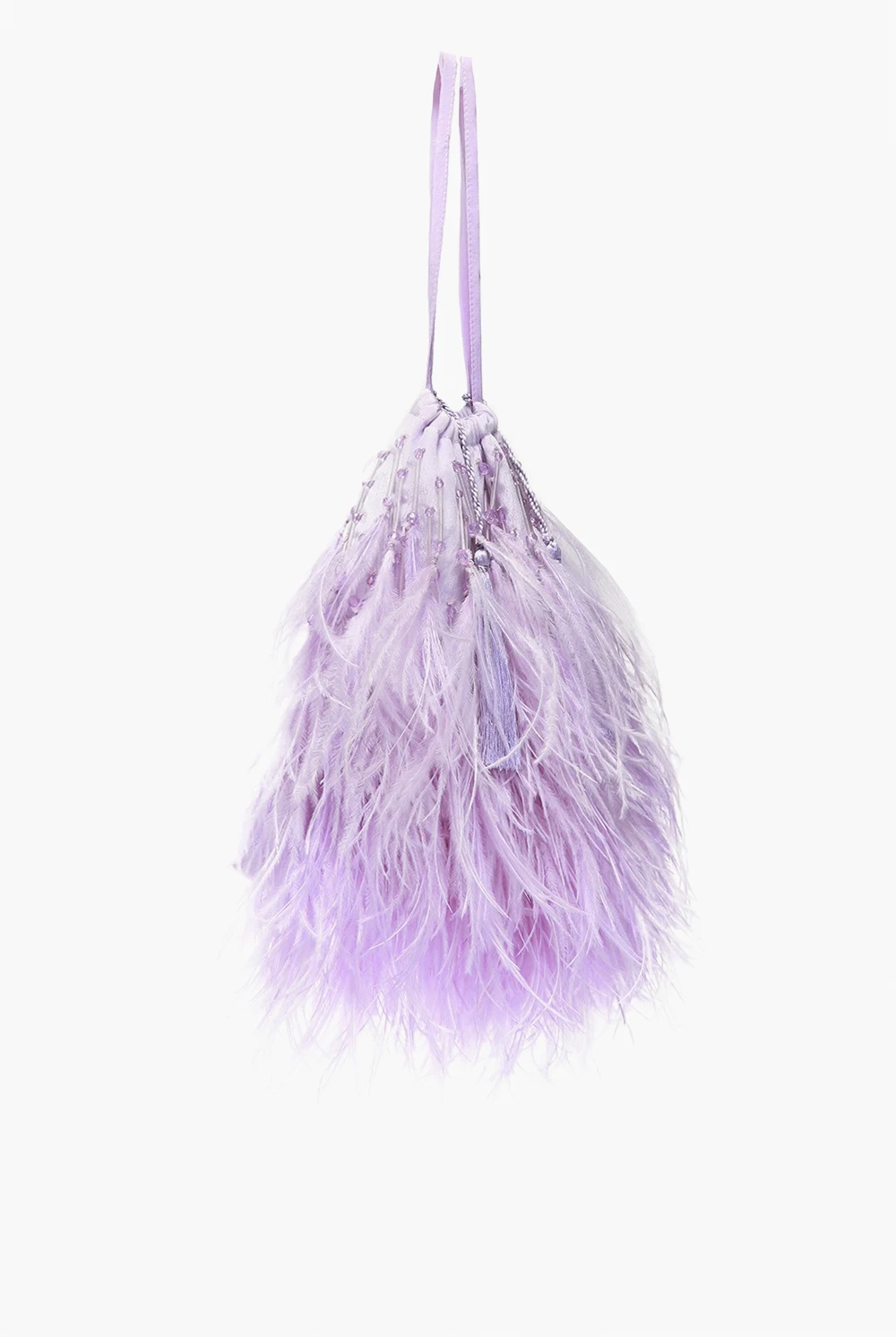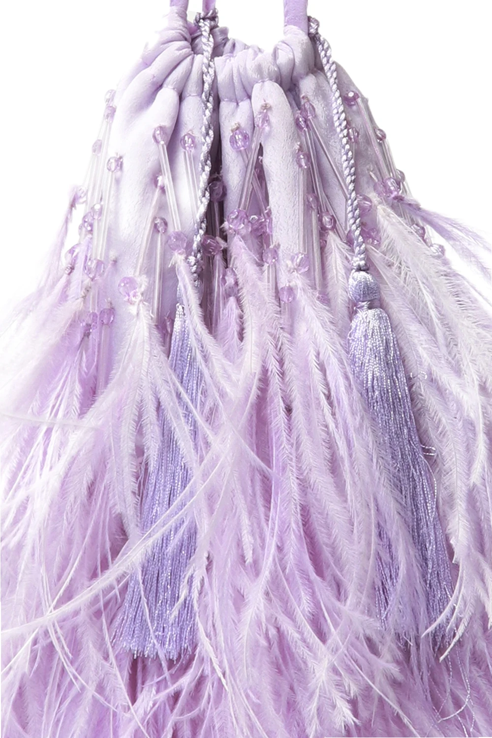 Light purple handbag from The Attico. Trimmed with silk. Drawstring fastening. Decorated with ostrich feathers and fringes. Embellished with decorative elements. One compartment inside.