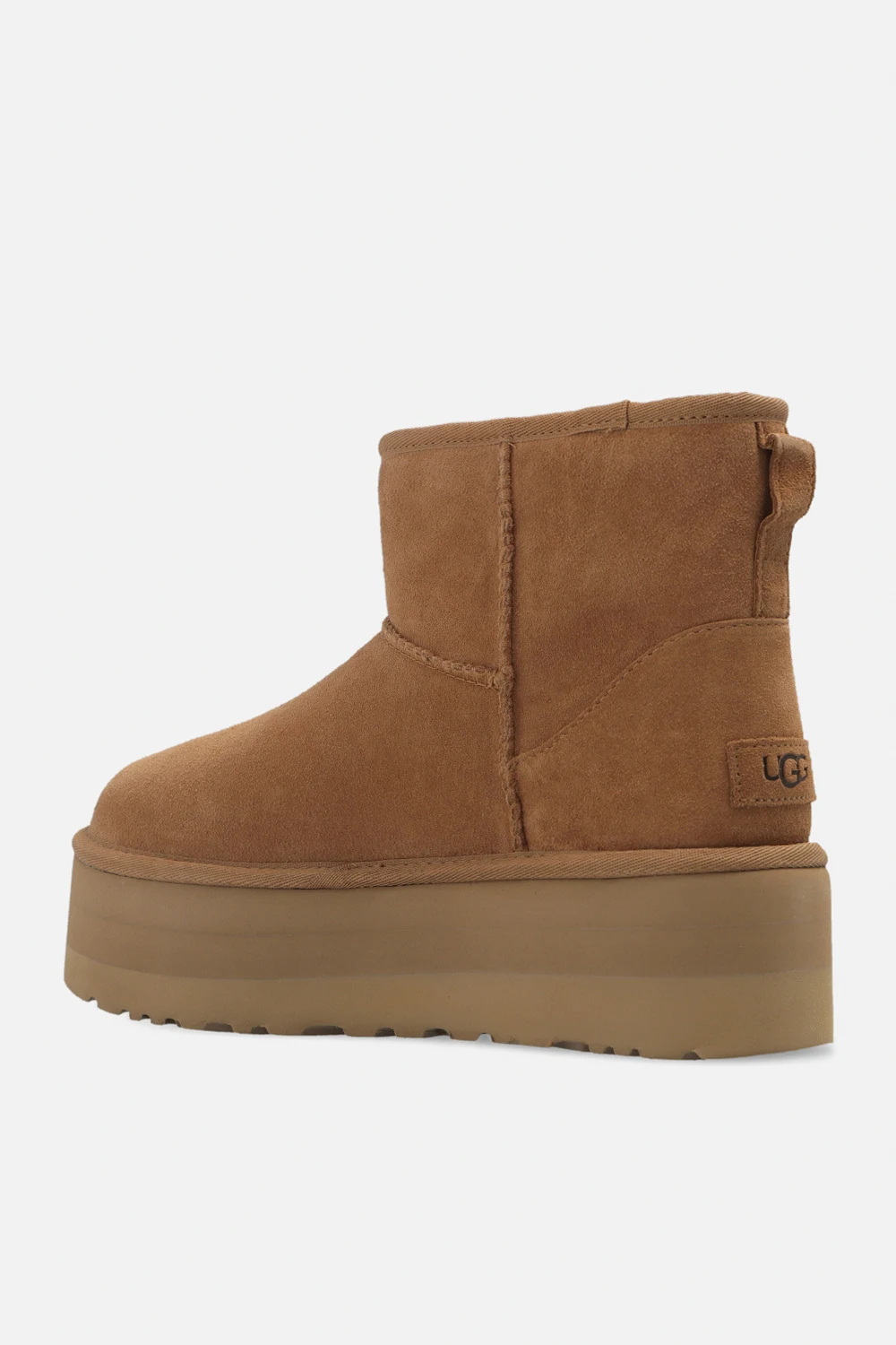 Brown ‘Classic Mini Platform’ snow boots from UGG. Crafted from suede, this model features a back logo patch, a wool-blend UGGplush™ insole and a black Treadlite by UGG™ EVA foam outsole.