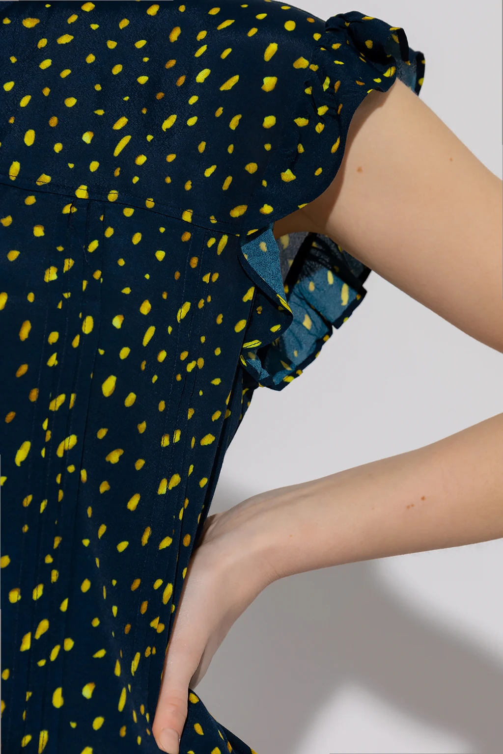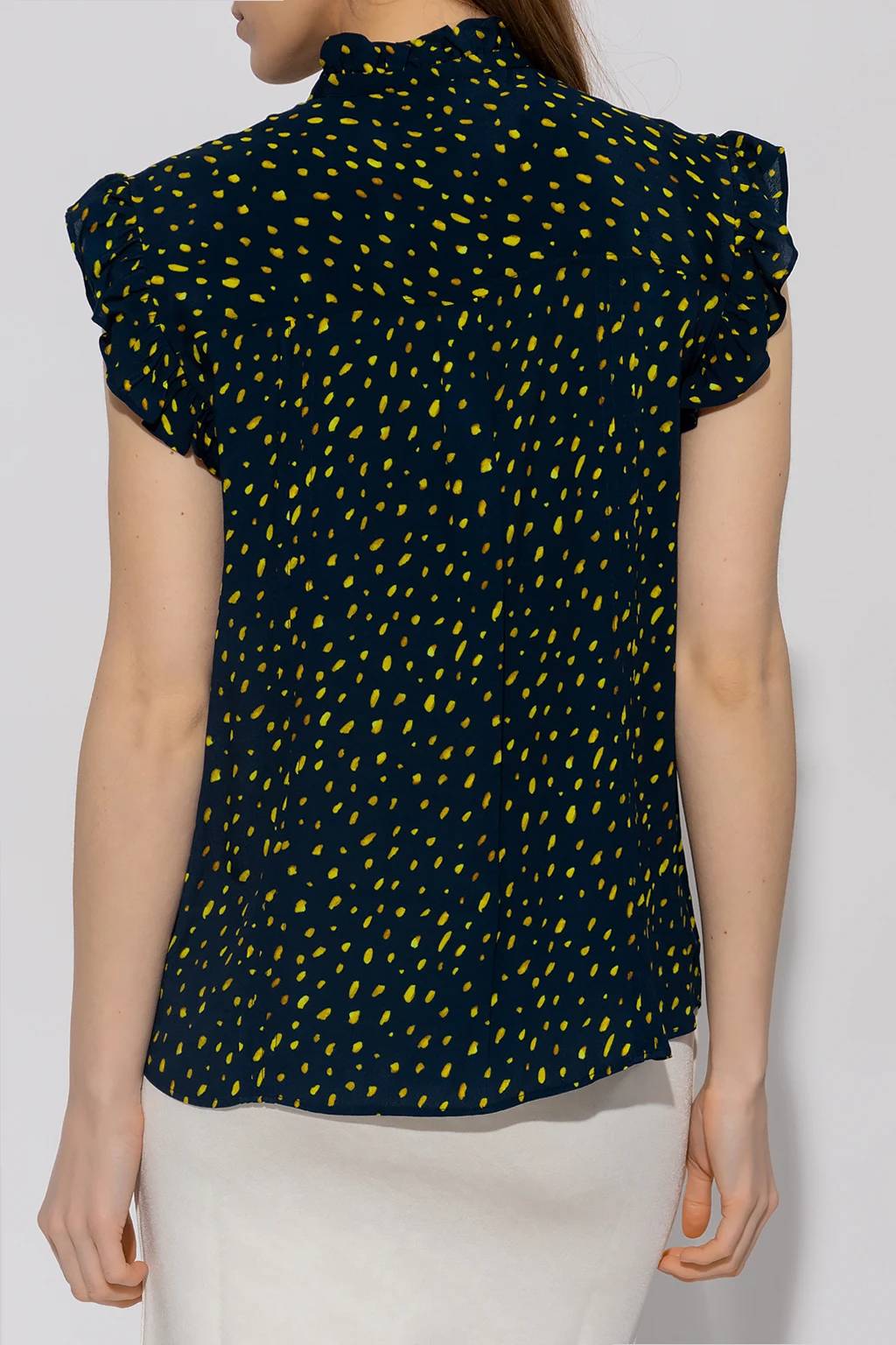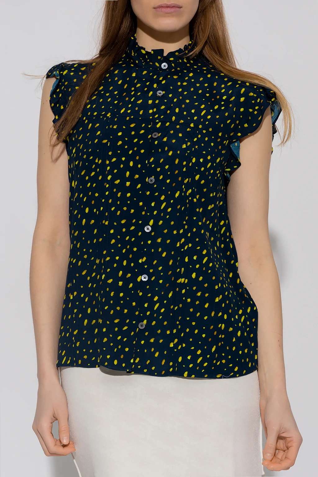 Navy sleeveless top from PS Paul Smith. Fastened with buttons, this garment features a yellow pattern, decorative pleats and ruffles at the neck and cuffs.