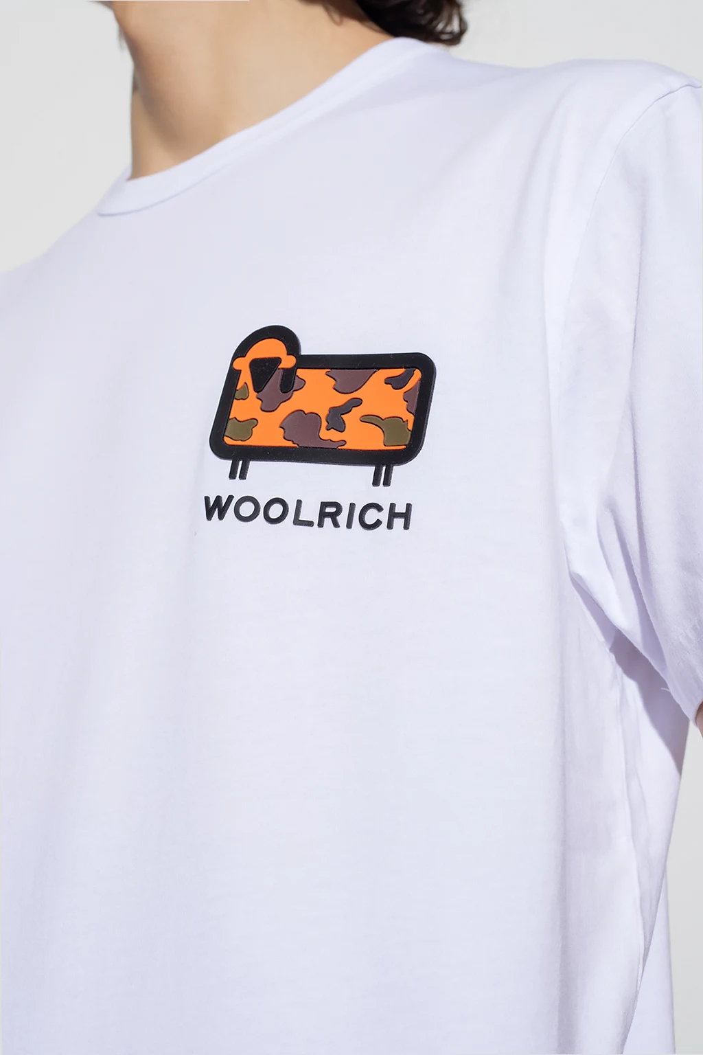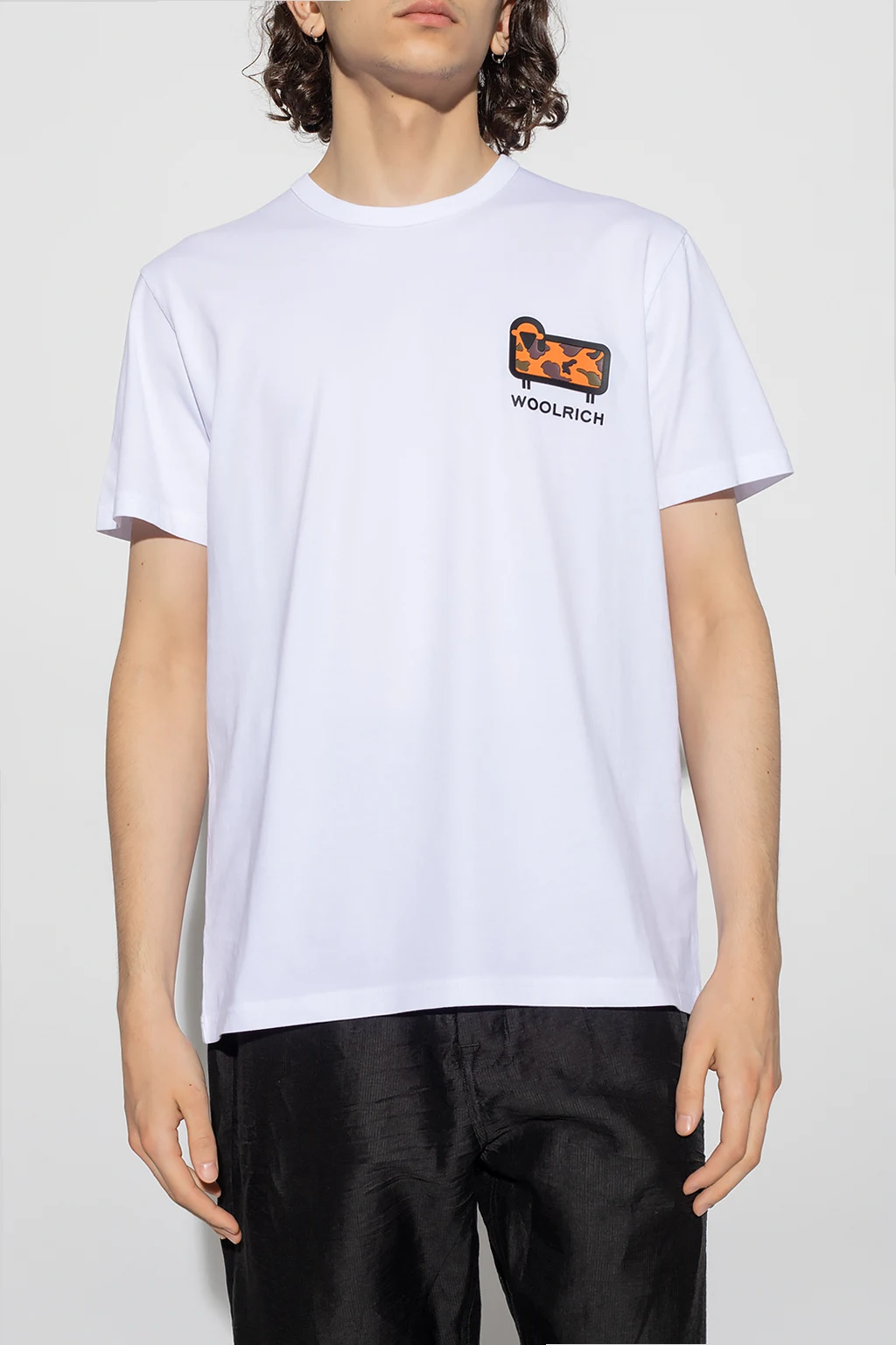 White T-shirt from Woolrich. Made of organic cotton, this short sleeve design features a rubberized logo detail and ribbed crew neck.