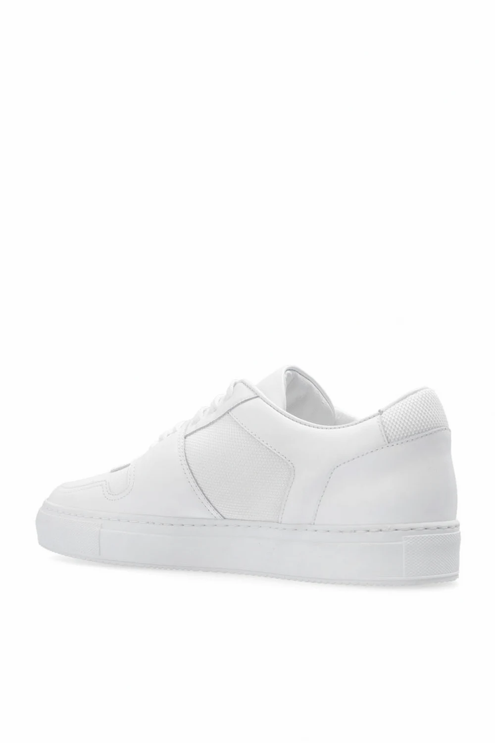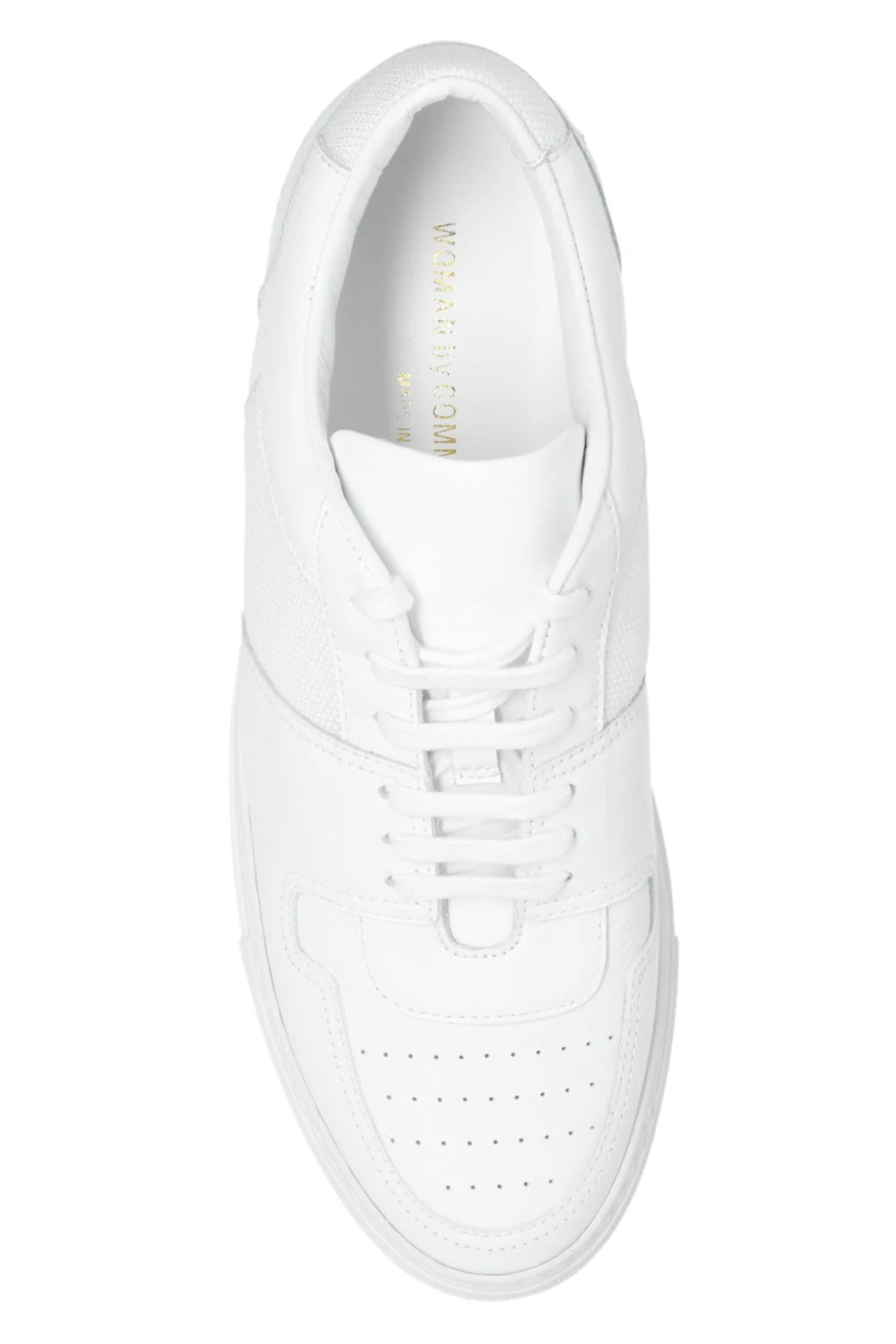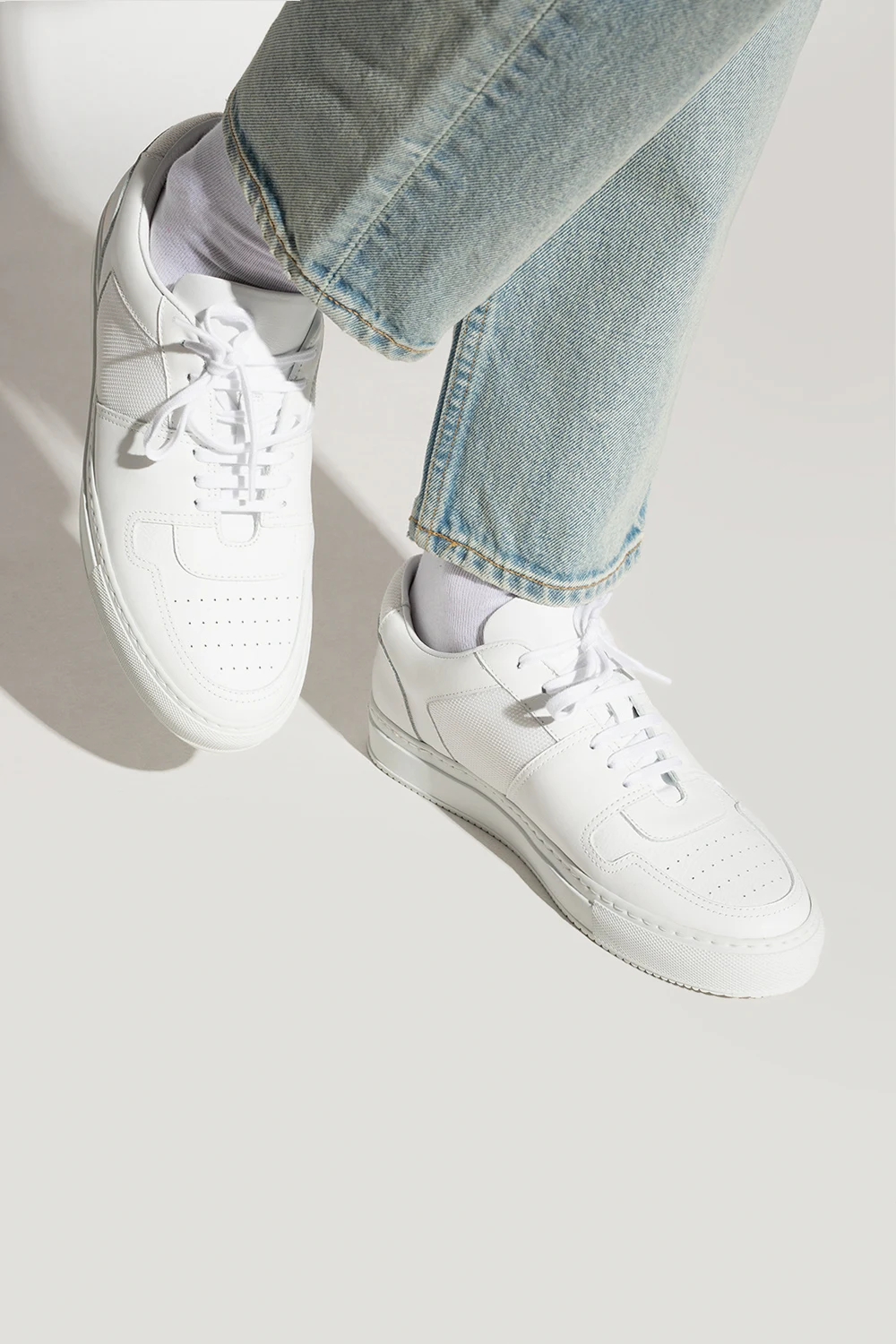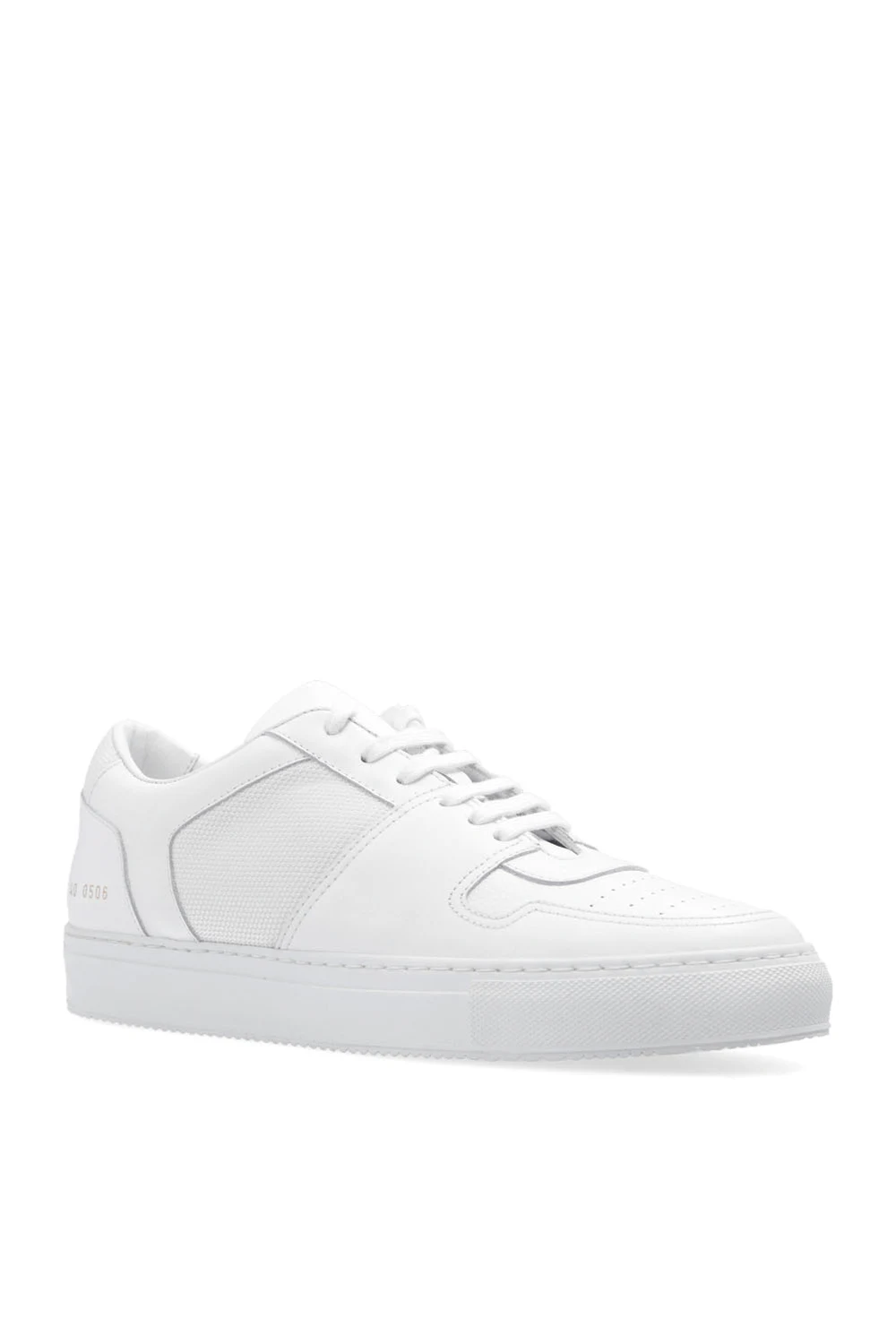White ‘Decades Low’ sneakers from Common Projects. Crafted from leather, this lace-up model features fabric trims, a gold-tone print on the side, a perforated toe and a white rubber sole. Swappable shoelaces included.