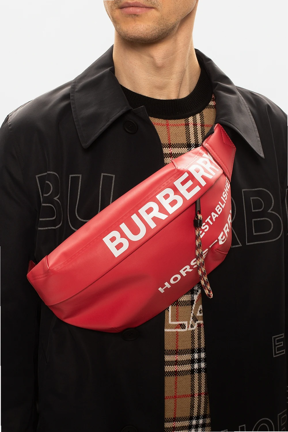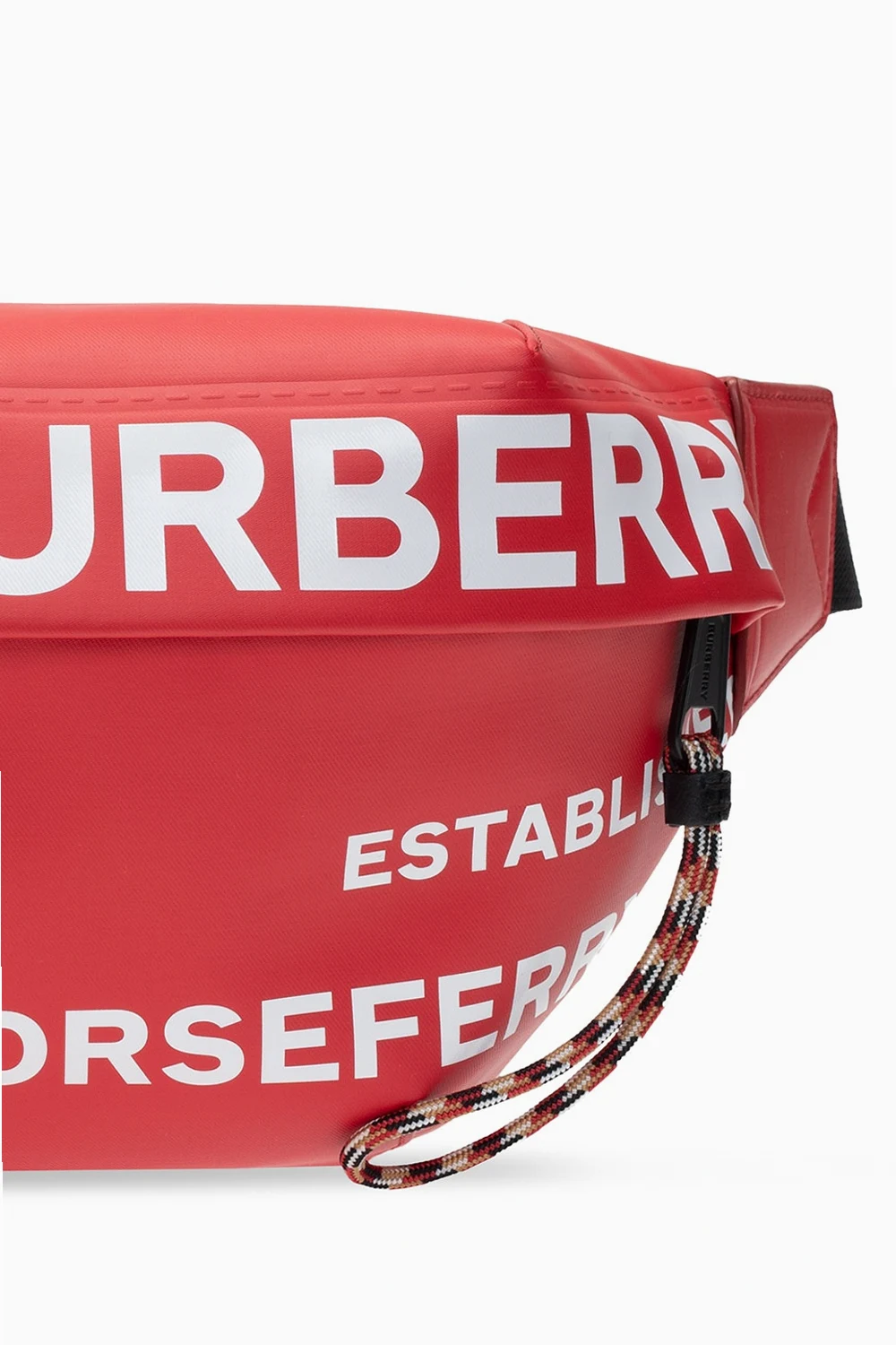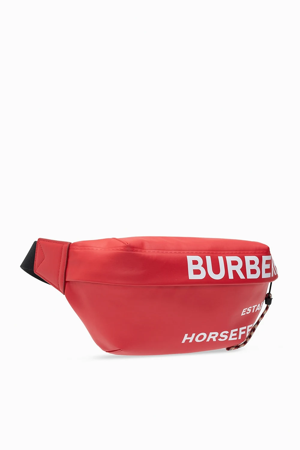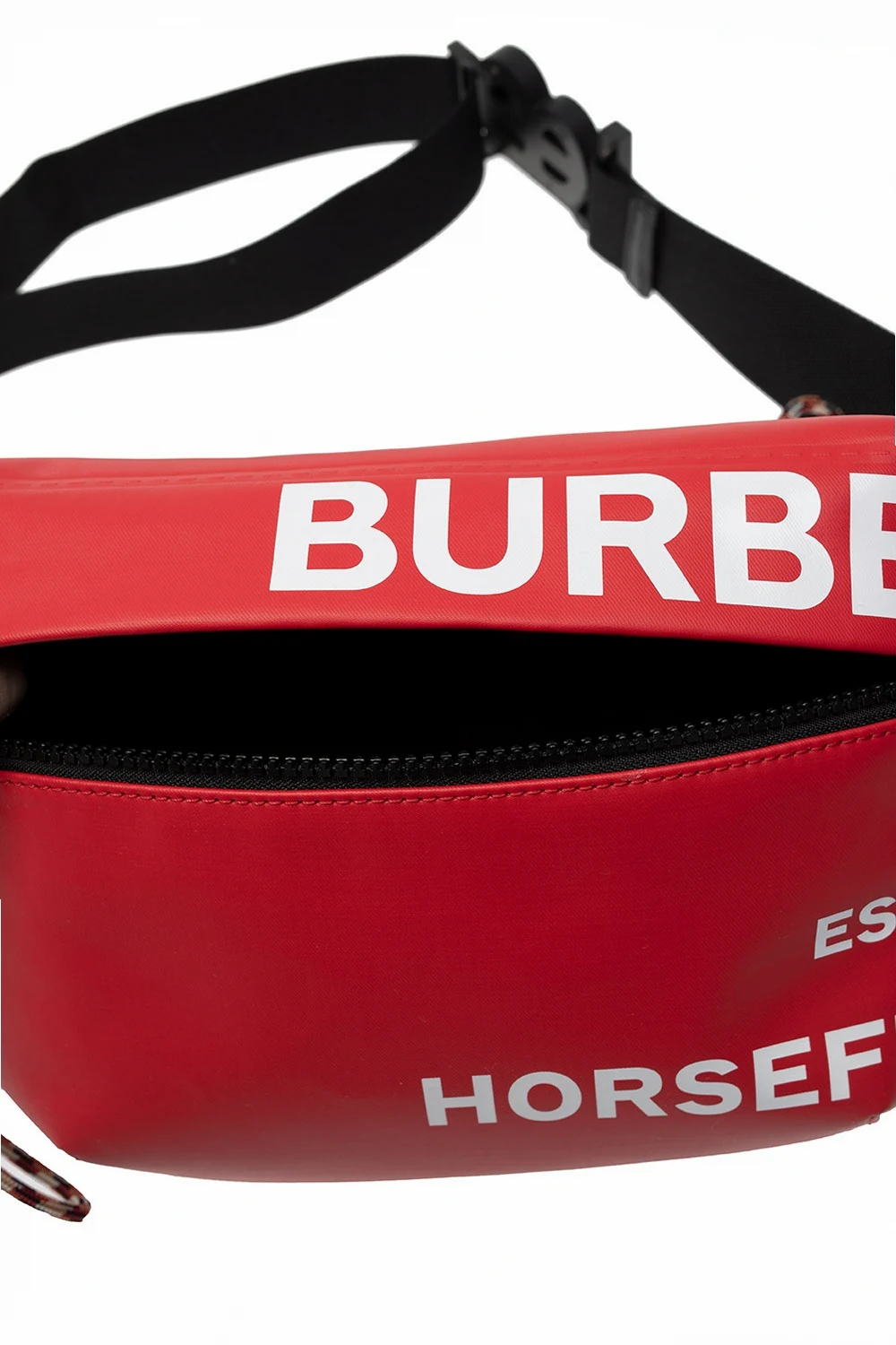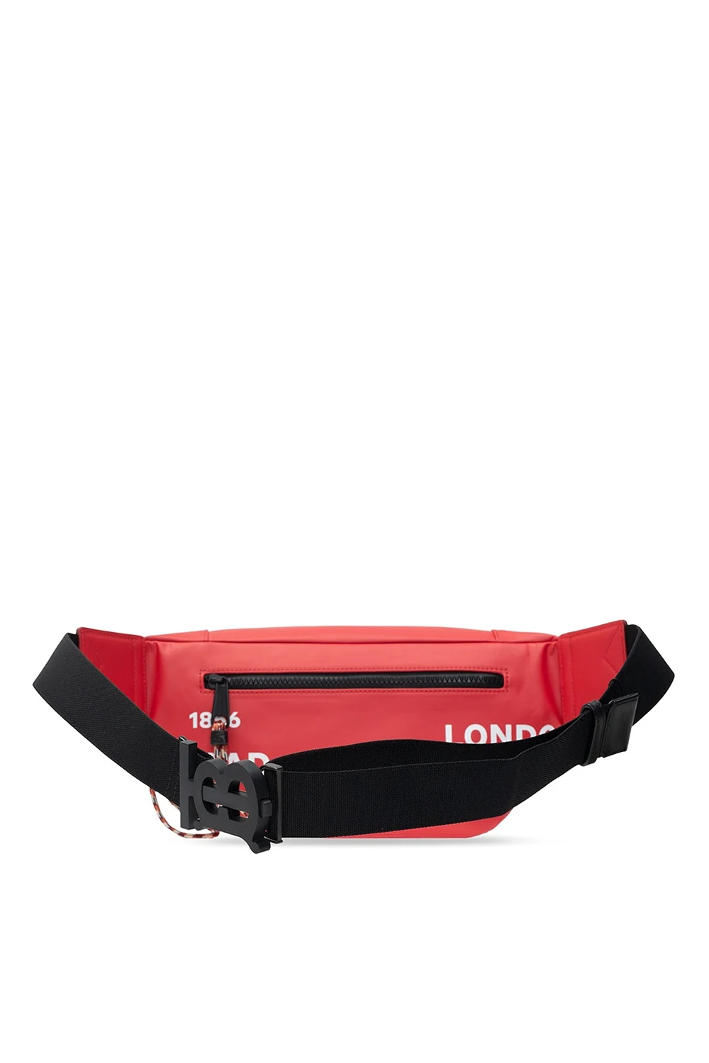 Red and black belt bag from Burberry. Printed with the brand's logo in white, this cotton-crafted design fastens via a zip and employs an external zip pocket on the front, an adjustable strap and interior with one compartment and a card slot.