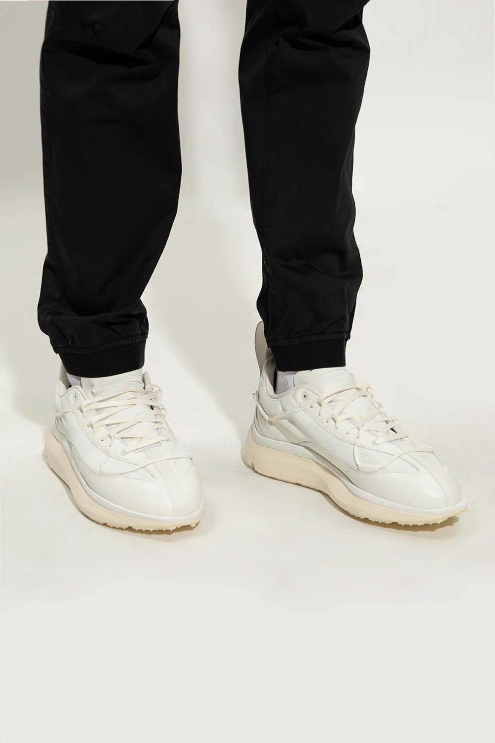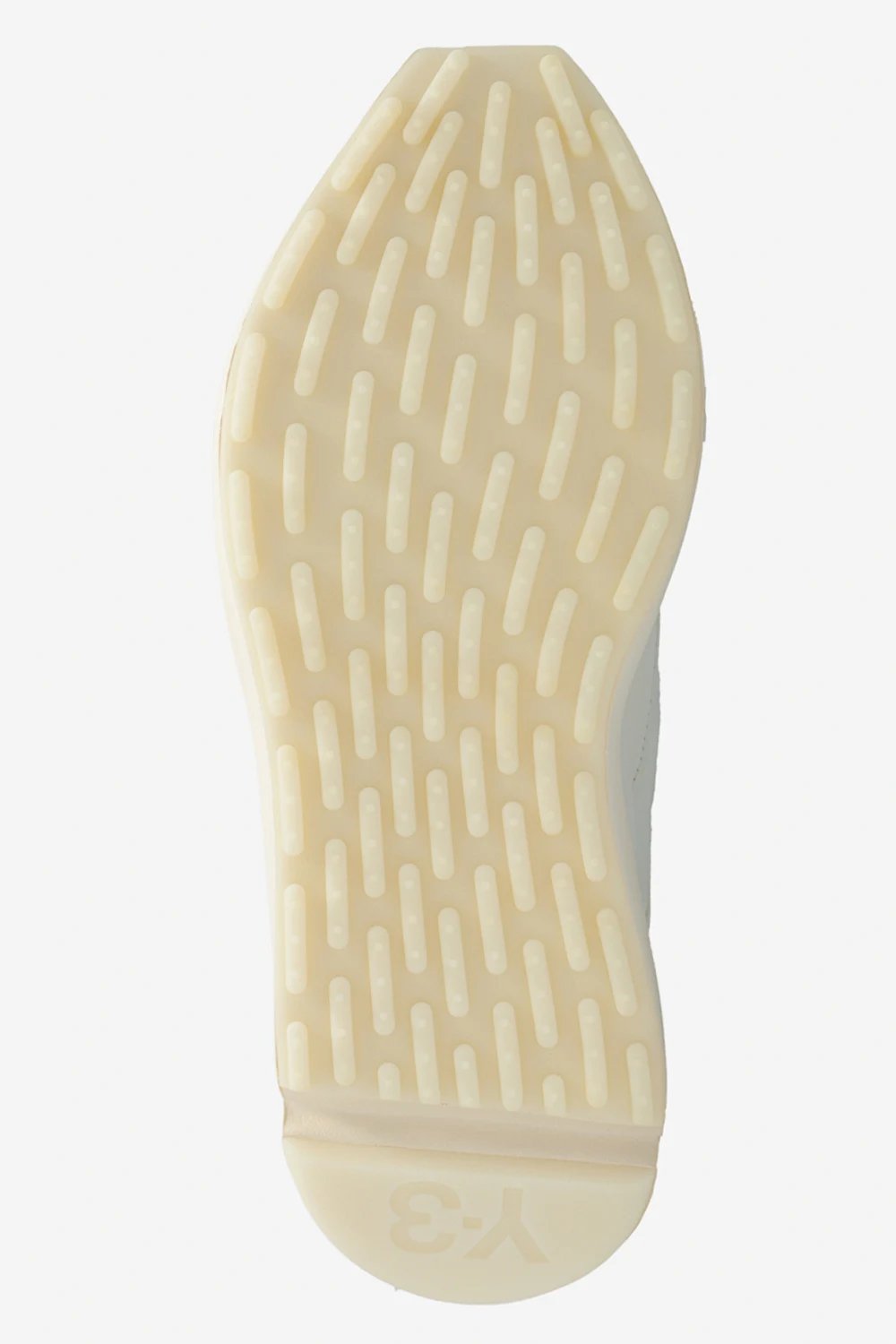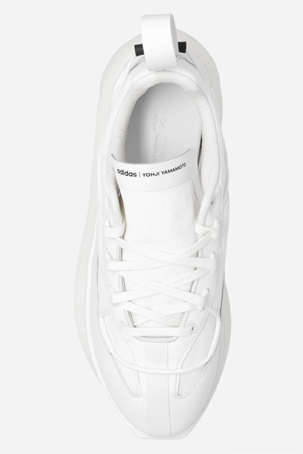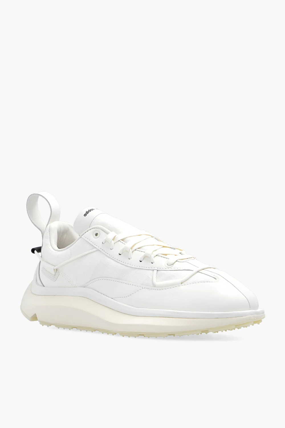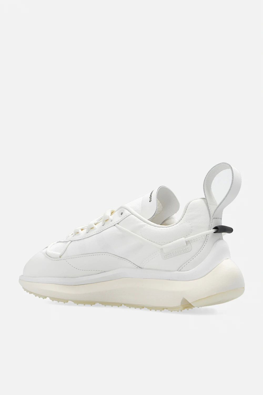 White ‘Shiku’ sneakers from Y-3 Yohji Yamamoto. Crafted from fabric and leather, this lace-up model sits on a white rubber sole and showcases a graphic print with the brand's logo.