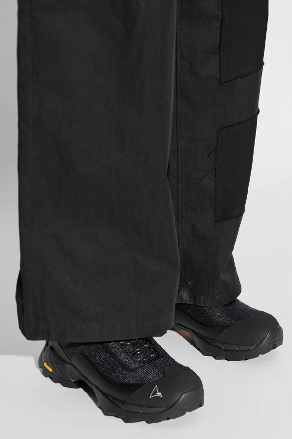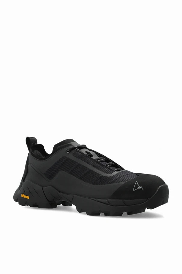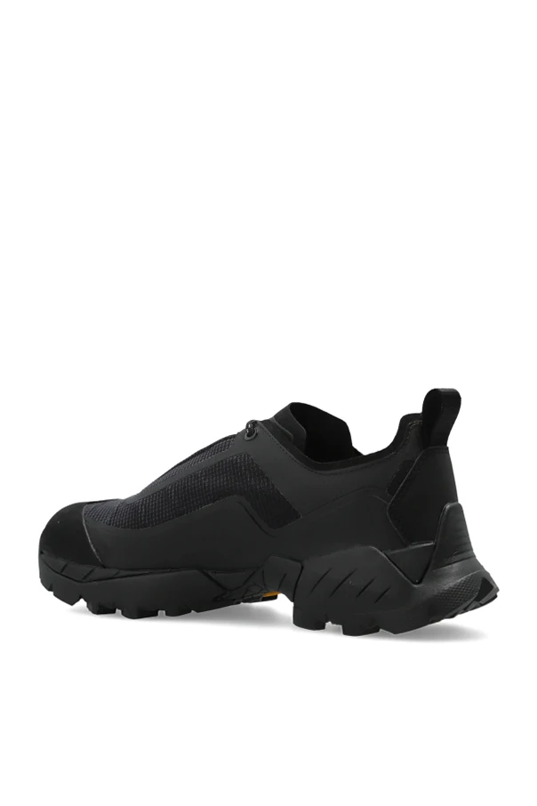 Das Obermaterial aus einer Kombination von Leder, technischem Gewebe und atmungsaktivem Mesh sorgt für ein außergewöhnliches Komfortgefühl und hervorragende Belüftung der Füße. Die verstärkte Sohle aus hochwertigem Gummi – mit dem gelben „Vibram“-Logo versehen – garantiert Haftung und Langlebigkeit selbst unter anspruchsvollen Geländebedingungen. Das geometrische Designer-Emblem, das technische Schnürsystem sowie die praktische Schlaufe an der Ferse heben die Präzision und Einzigartigkeit des Designs hervor.