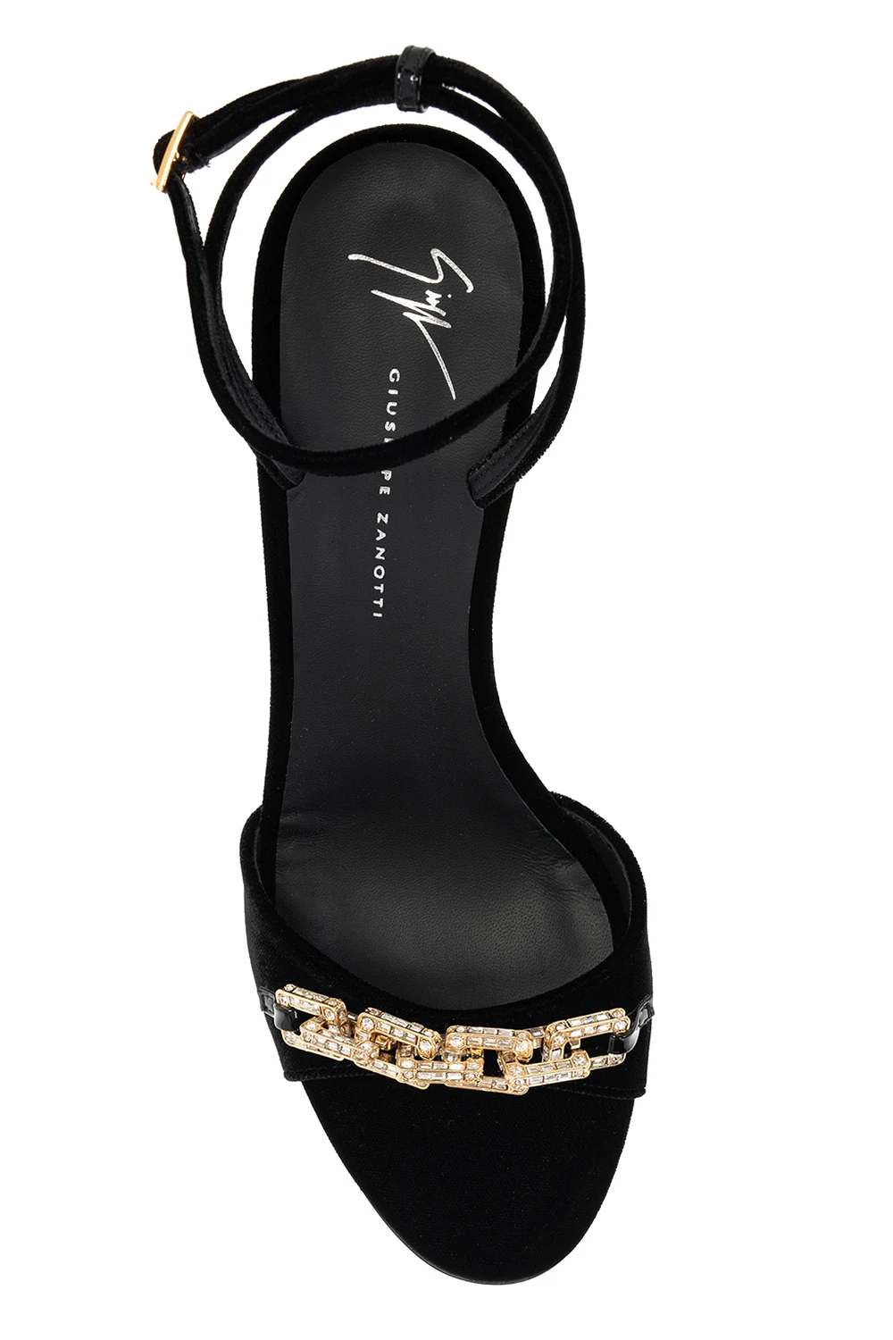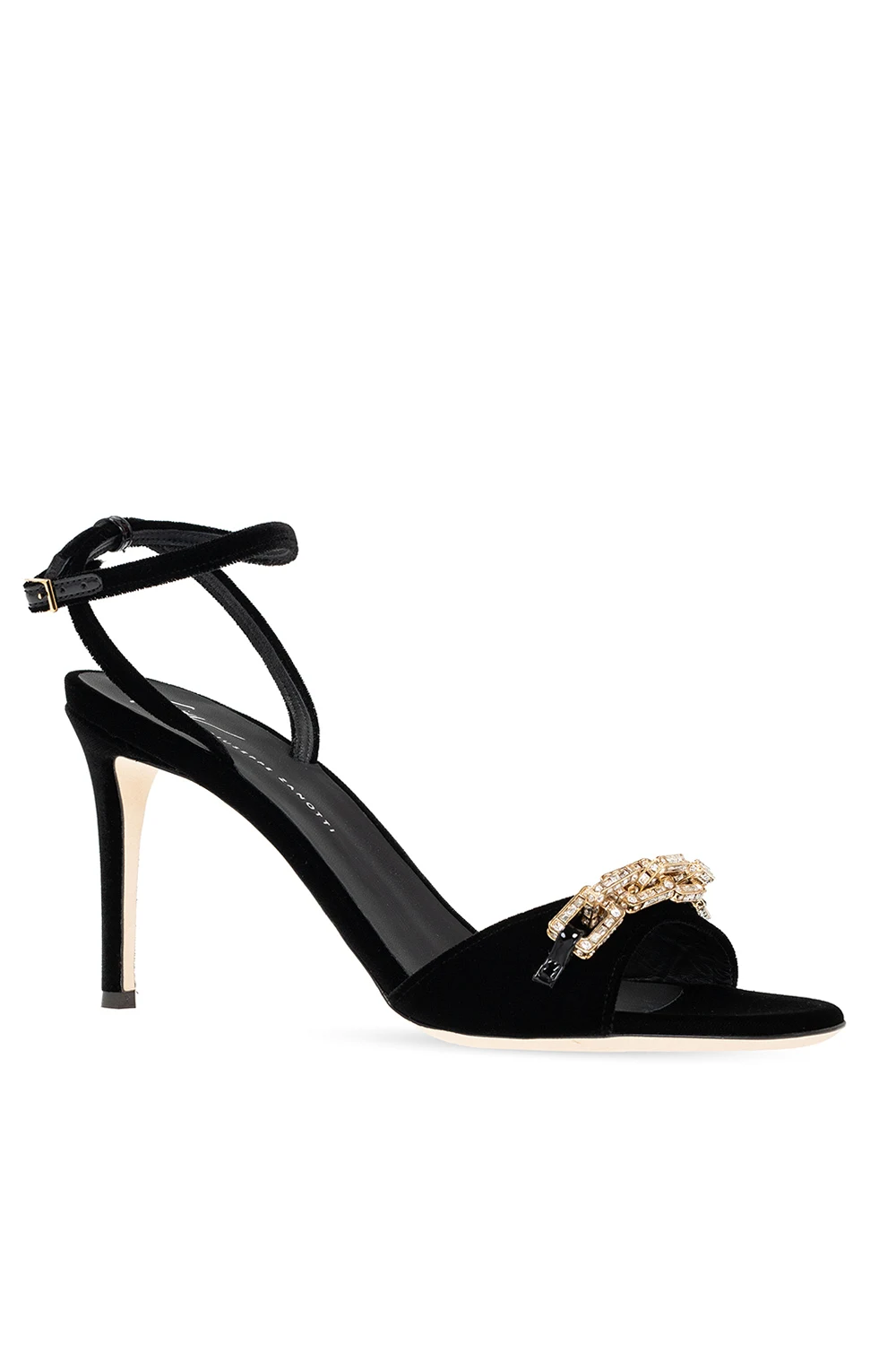 Black heeled sandals from Giuseppe Zanotti. Crafted from velvet fabric, they sit on a beige leather sole and showcase a buckle strap fastening at the ankle and decorative gold-tone chain detailing.
