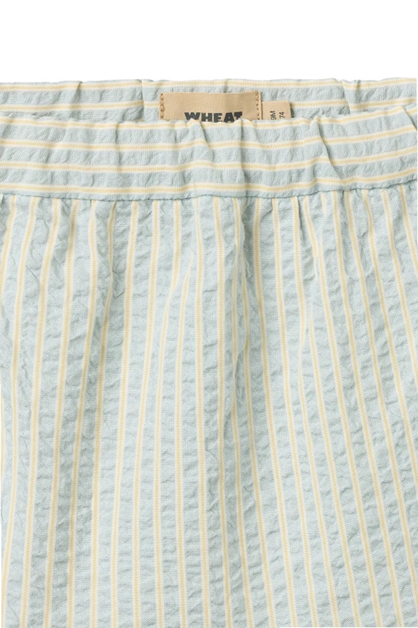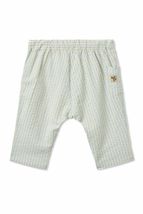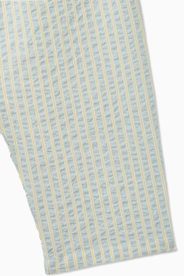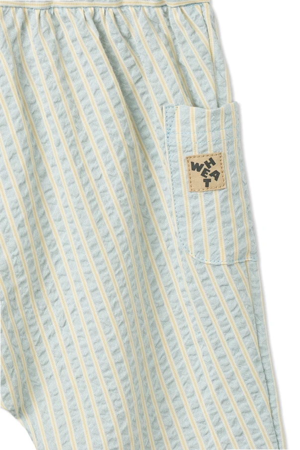 Der Stoff in einem dezenten vertikalen Streifenmuster – pastellgelbe Linien auf hellblauem Hintergrund – setzt einen eleganten visuellen Akzent und betont den exklusiven Charakter des Produkts. Die gerippte Struktur des Materials, kombiniert mit Weichheit und Atmungsaktivität, schützt die empfindliche Haut Ihres Kindes. Praktische Taschen sowie ein diskret aufgenähtes Logo-Label unterstreichen die Liebe zum Detail und die Funktionalität der Hose.