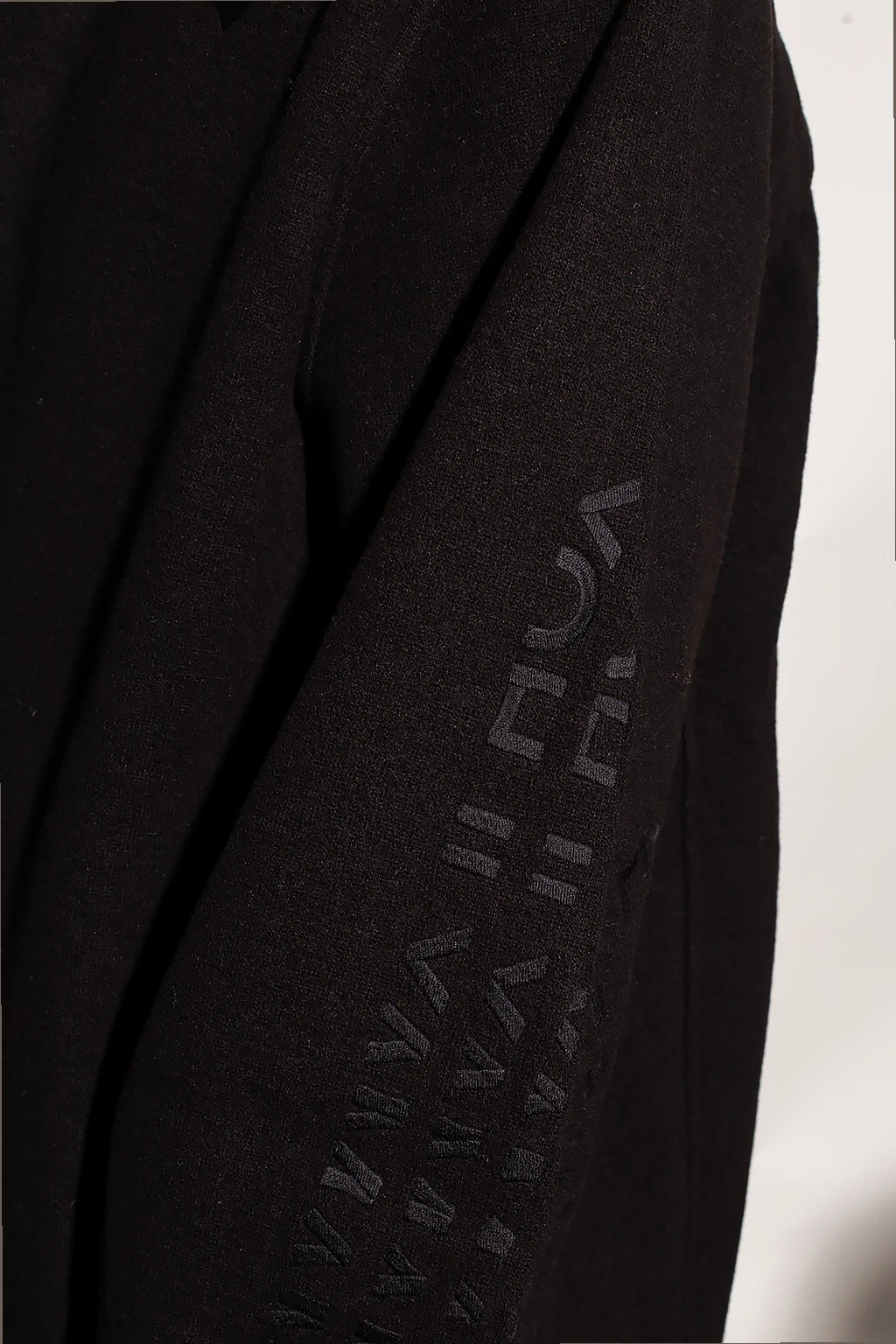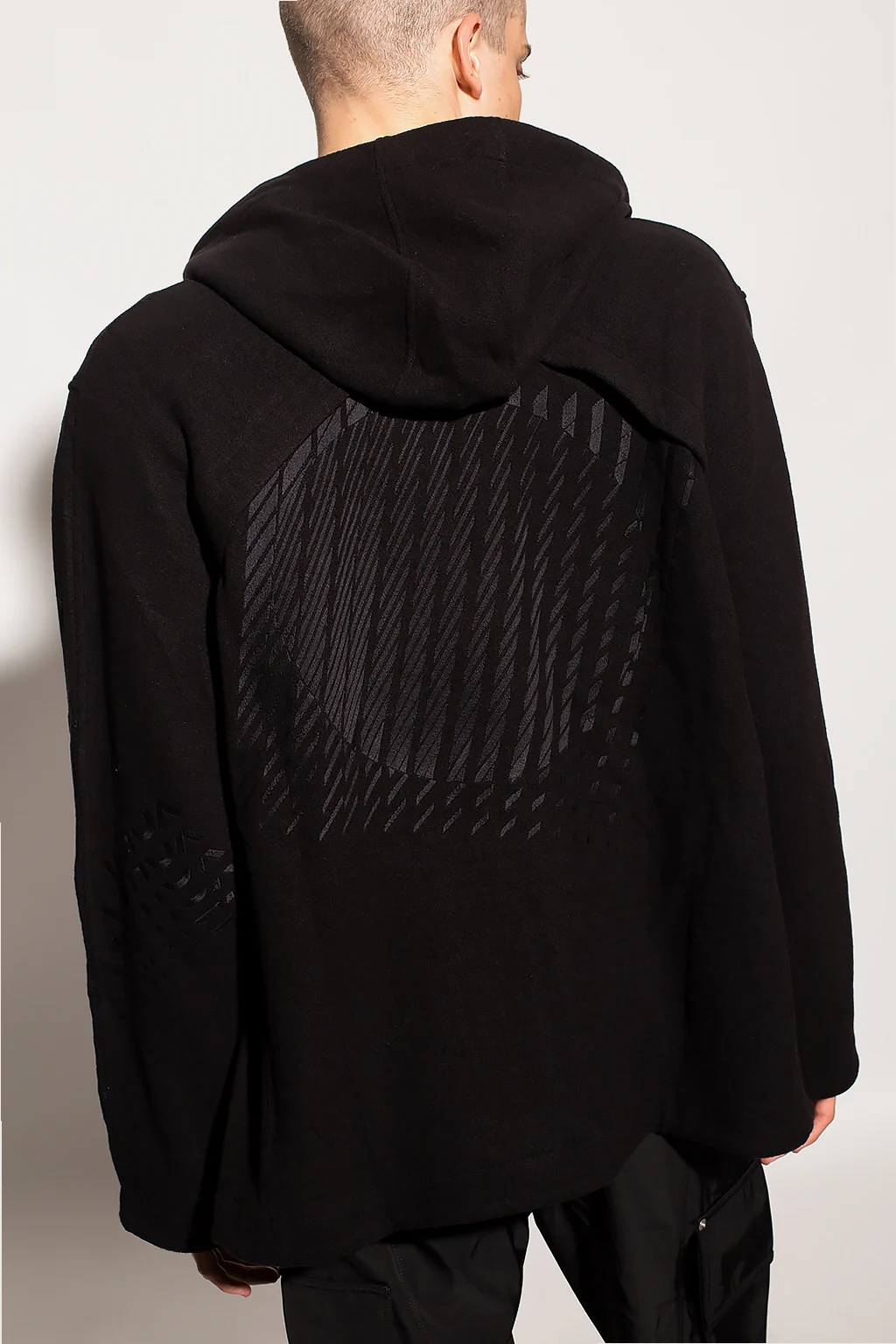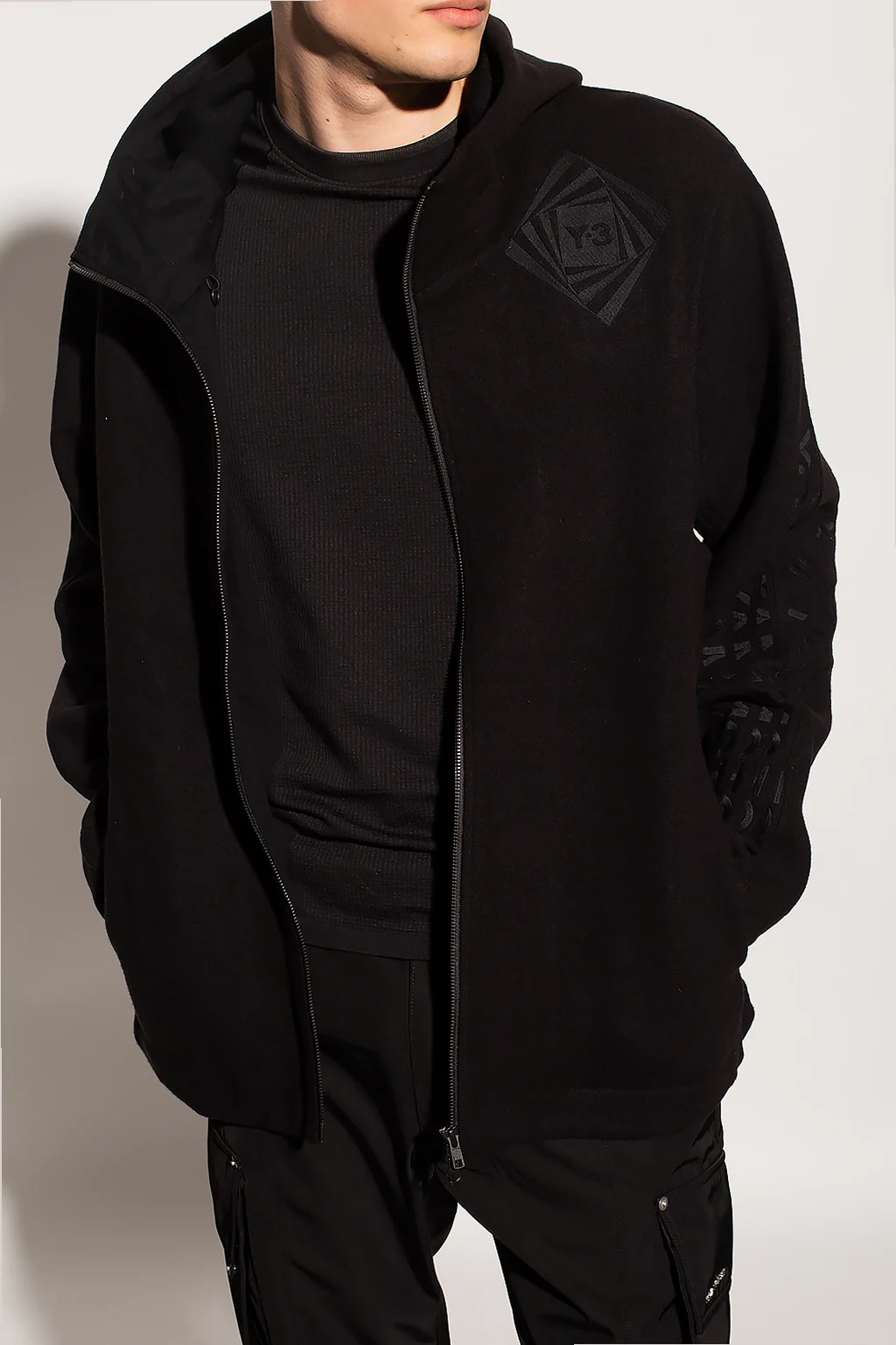 Black hoodie from Y-3 Yohji Yamamoto. Made of wool, this garment fastens with a two-way zip and is complete with multiple embroideries, two front pockets, open vents under the arms and drawstrings at the hem and hood.