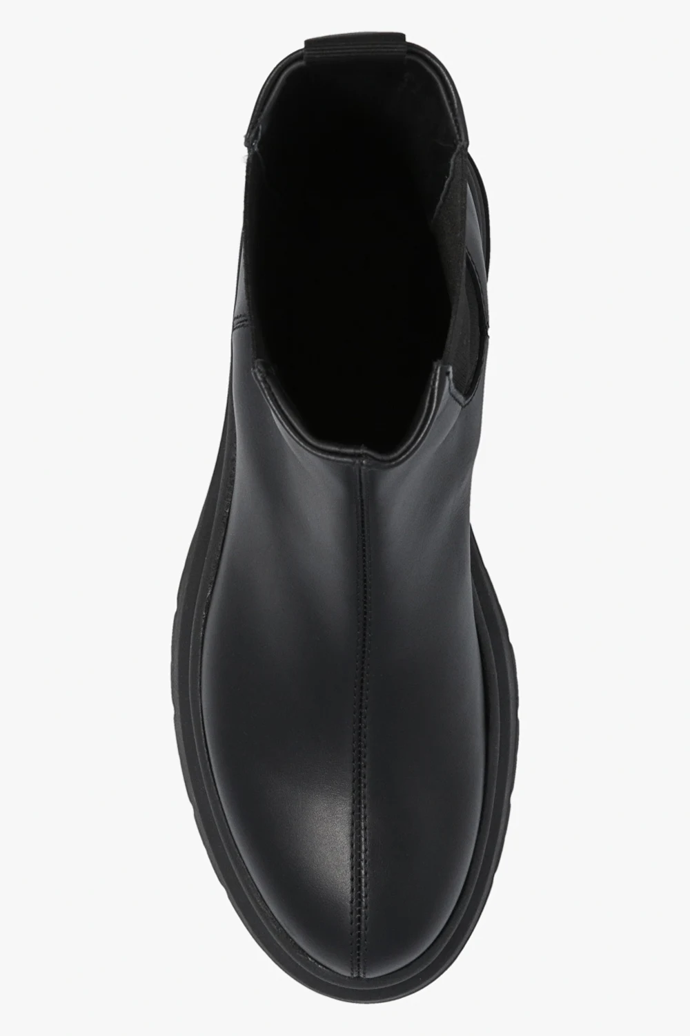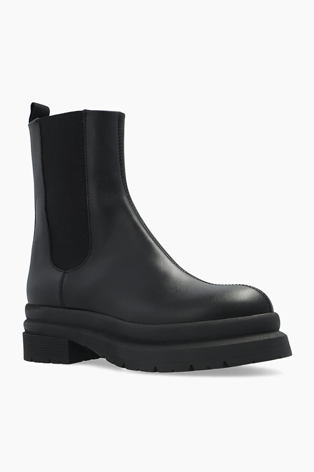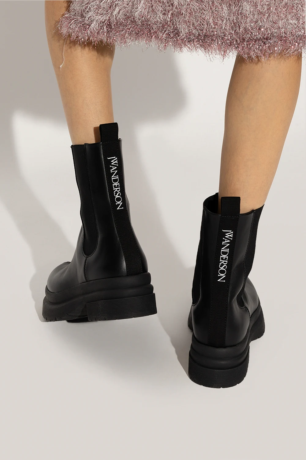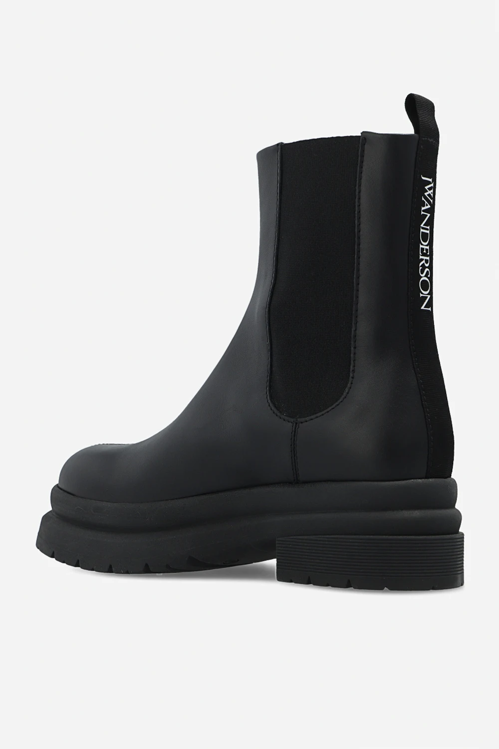 Black ankle boots from JW Anderson. Made of leather, this pair features decorative stitching, elastic side panels, white logo print at the back and black rubber sole.