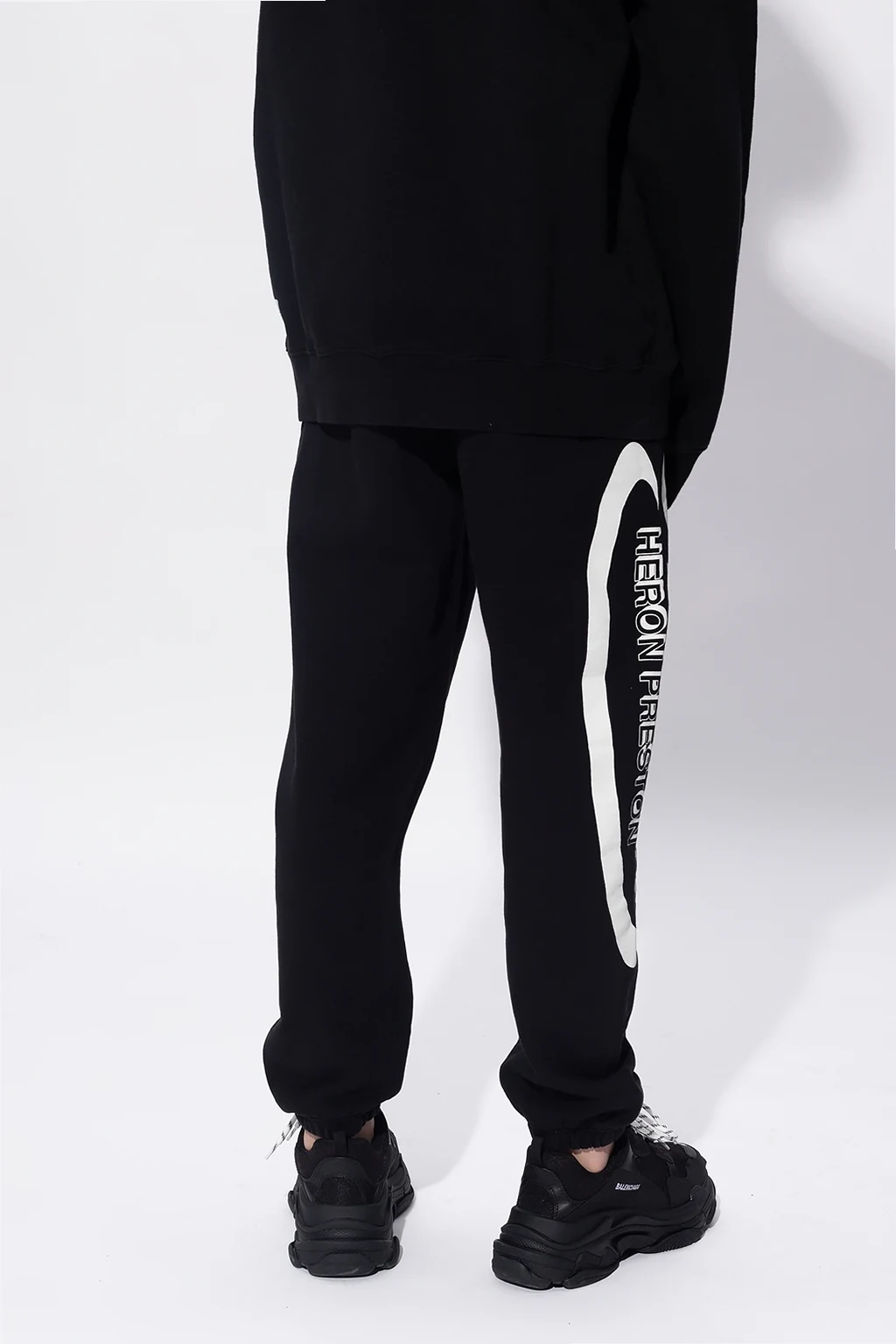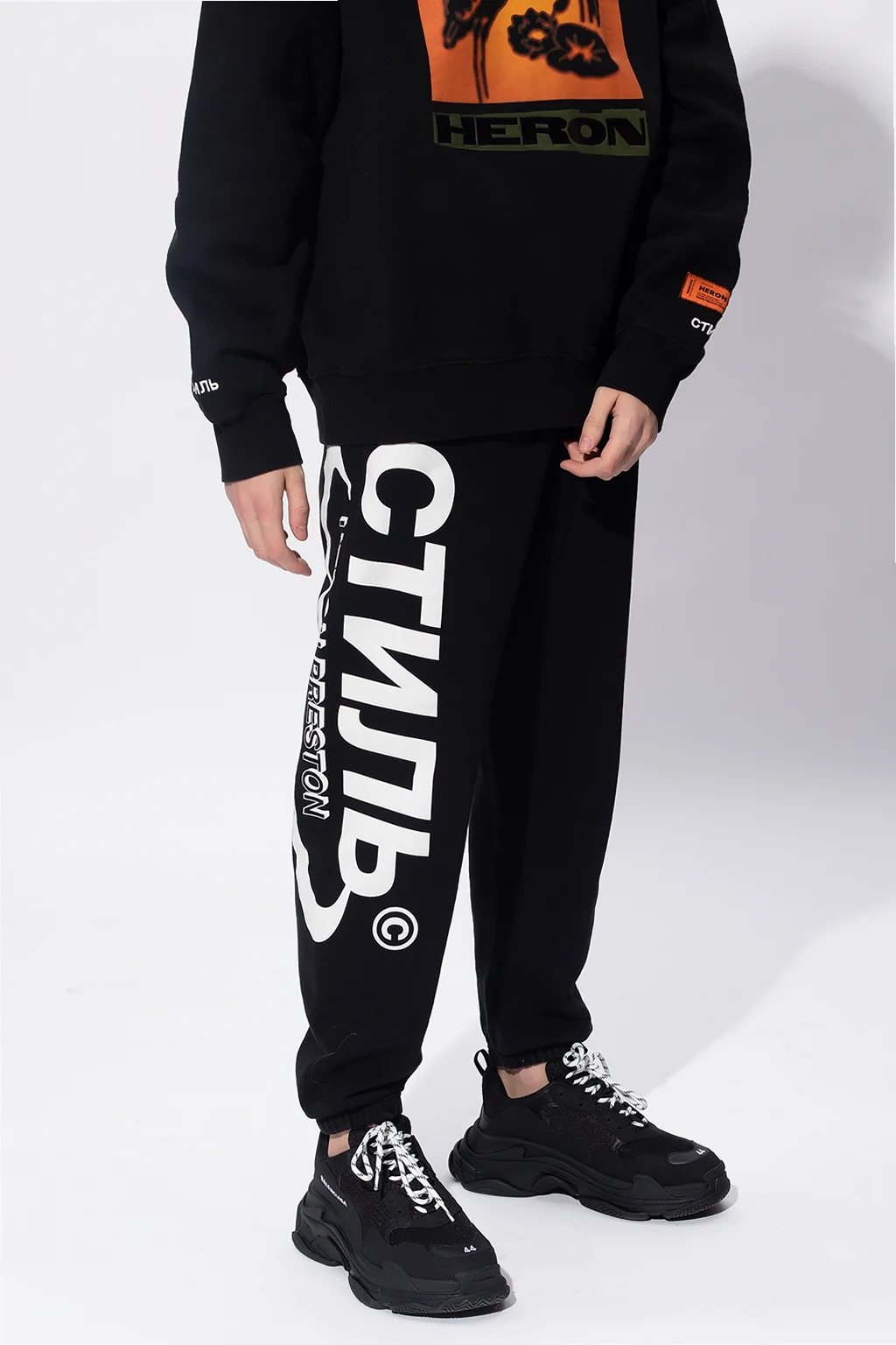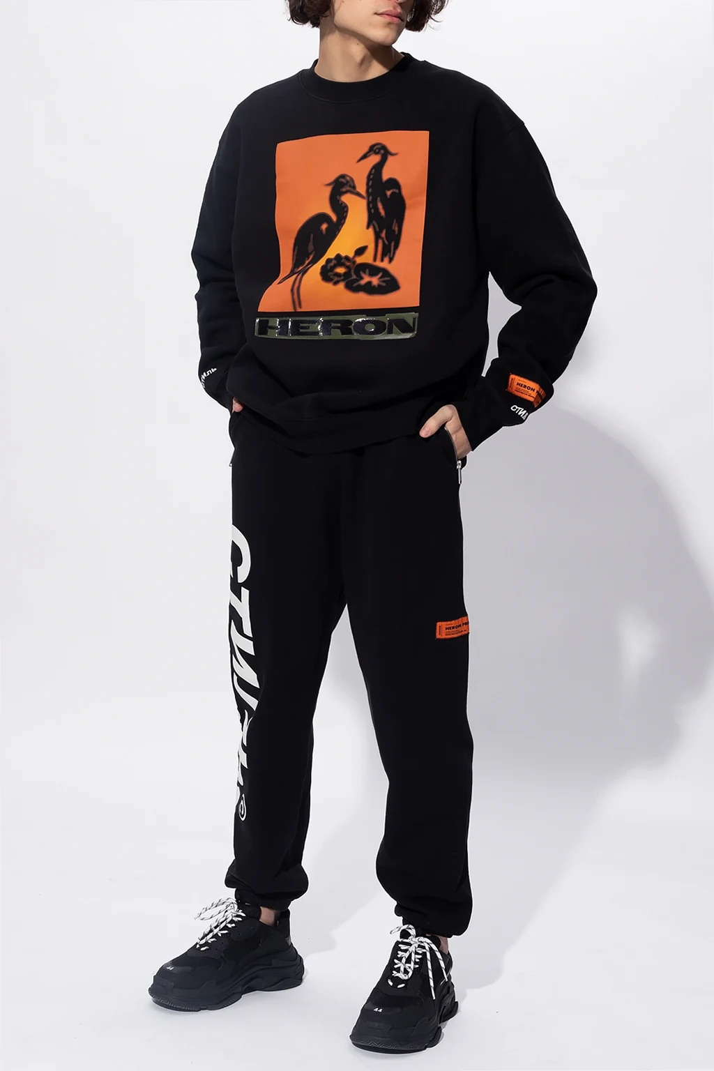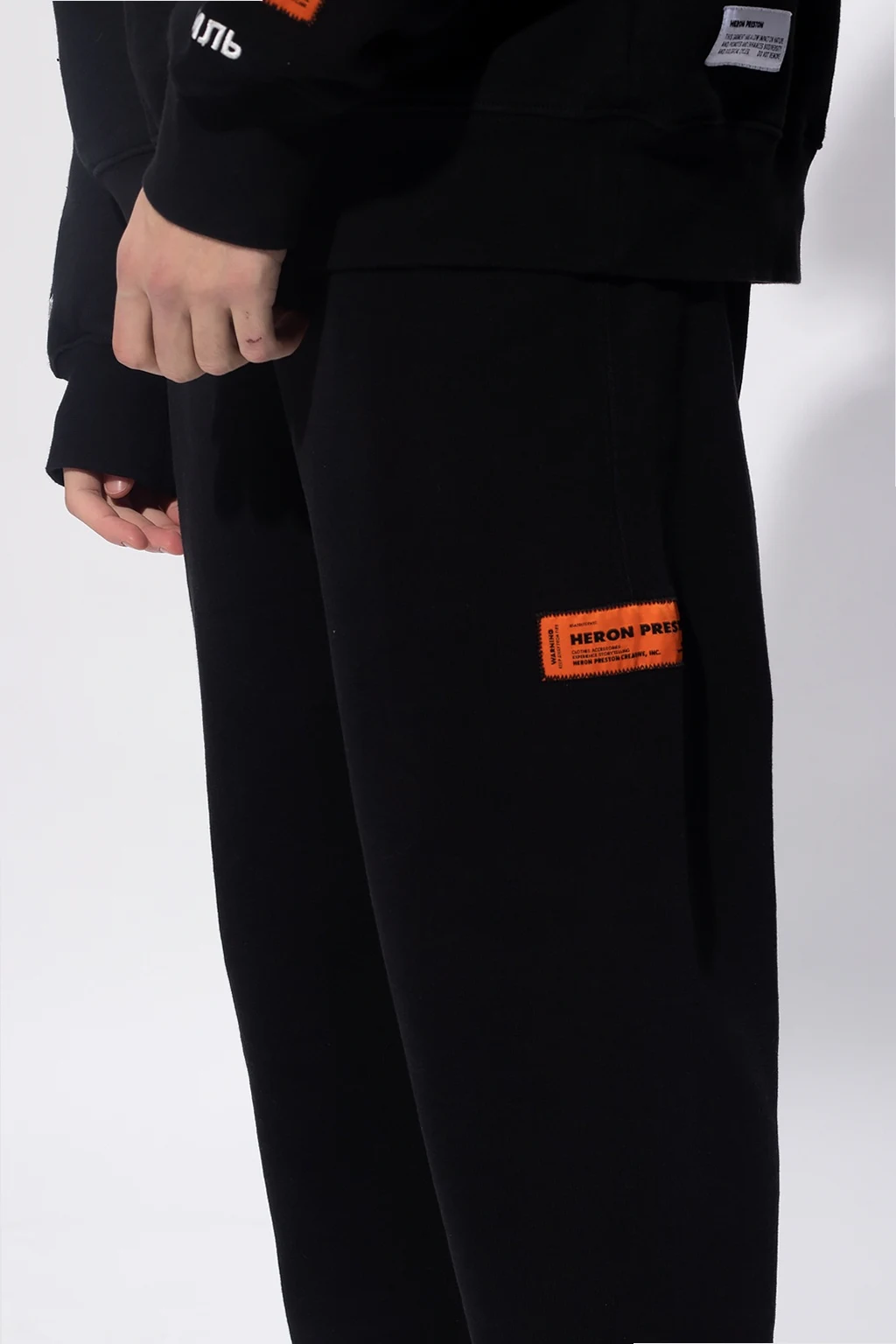 Black sweatpants from Heron Preston. Boasting an orange and black logo patch, this cotton-crafted pair is complete with an elasticated waistband with a drawstring fastening, two zipped pockets on the front and one snap-fastened pocket on the back.