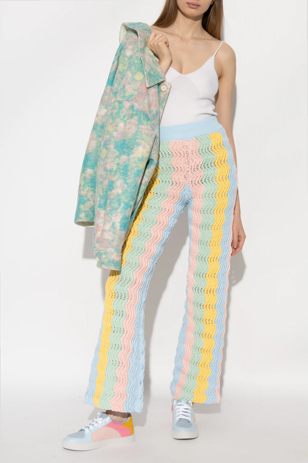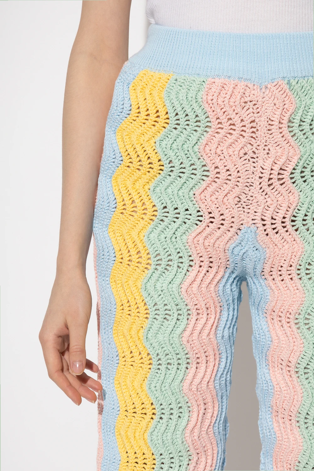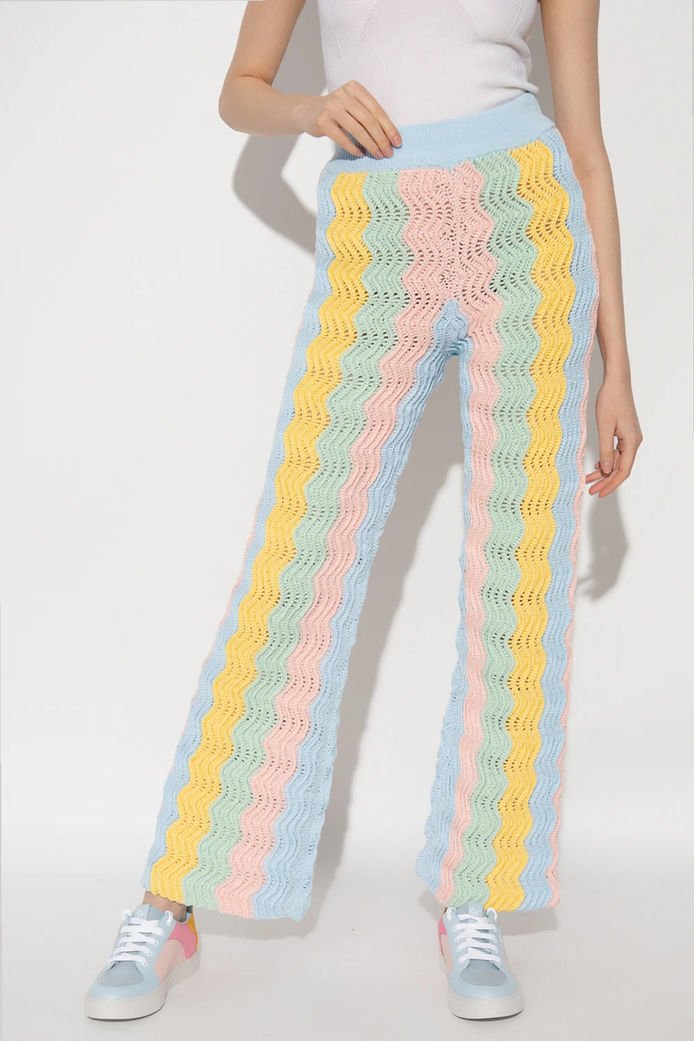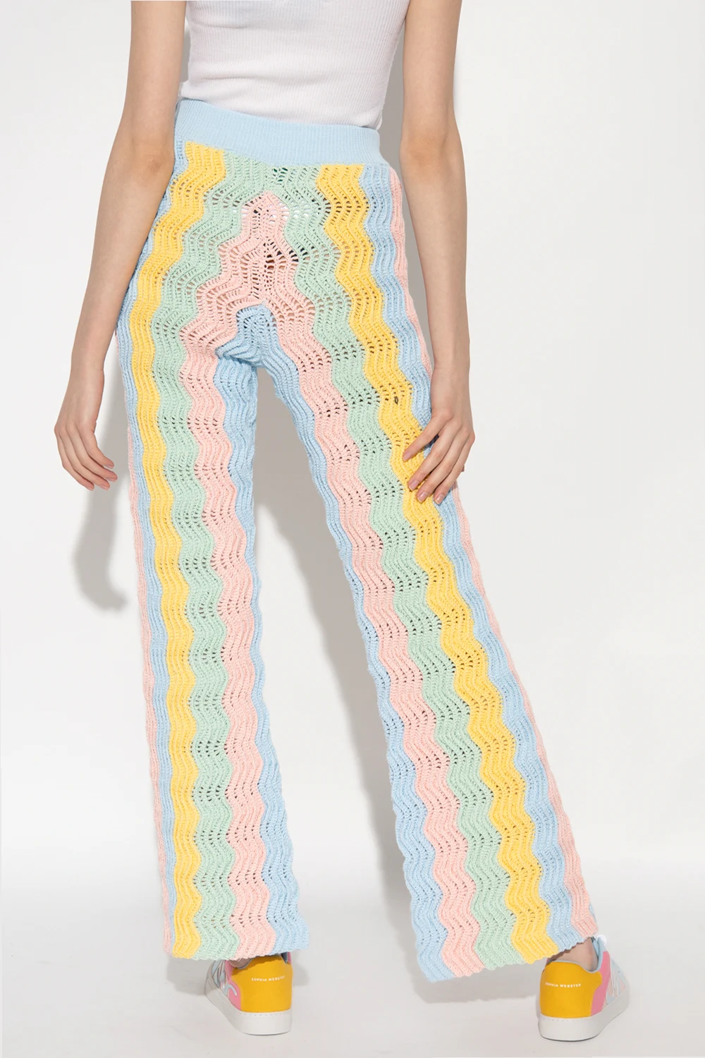 Multicolored flared trousers from Casablanca. Crafted cotton with a crochet knit, this pair features an elastic waistband and pastel wavy stripes inspired by the postmodern Memphis movement, which emerged in Milan in the 1980s.
