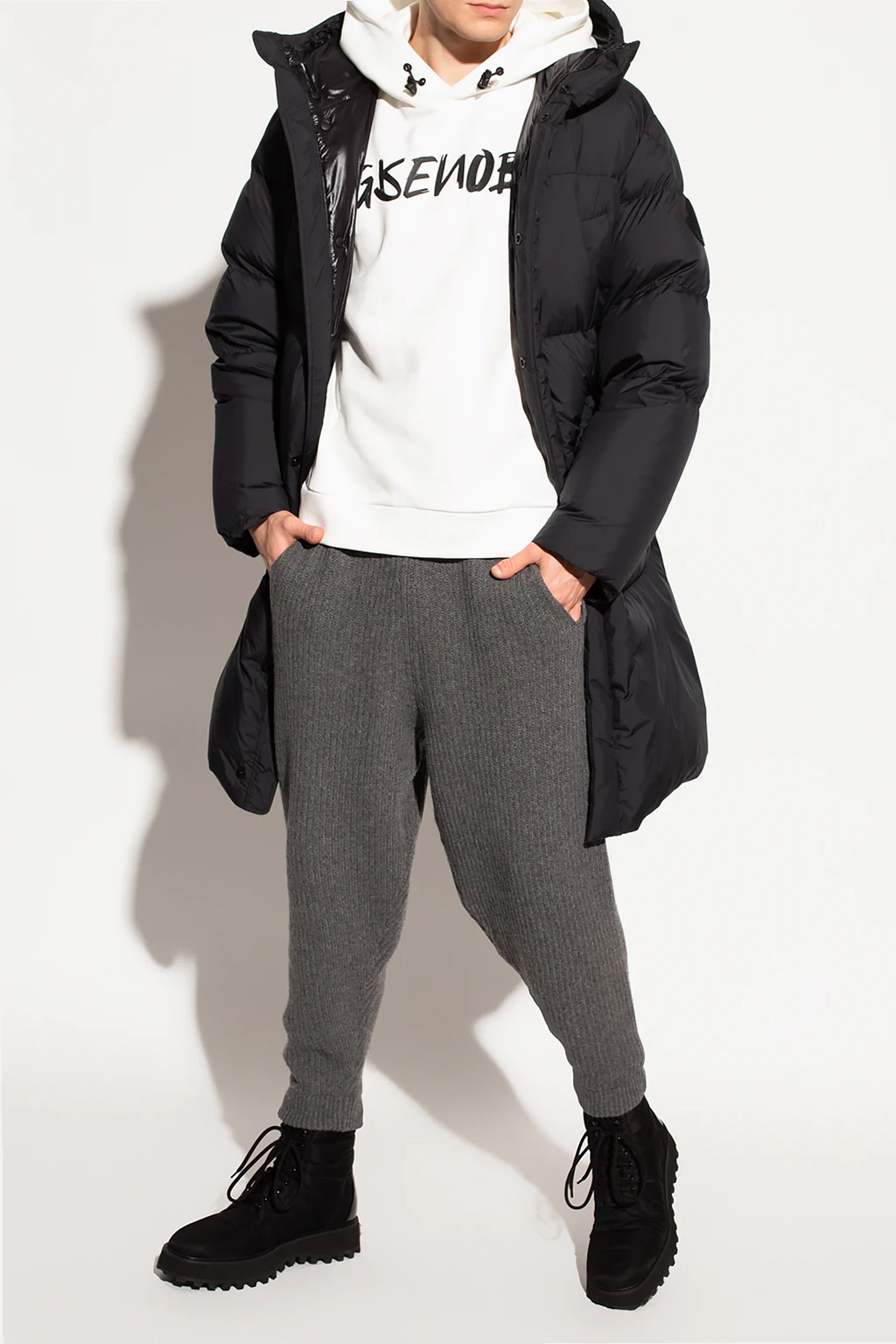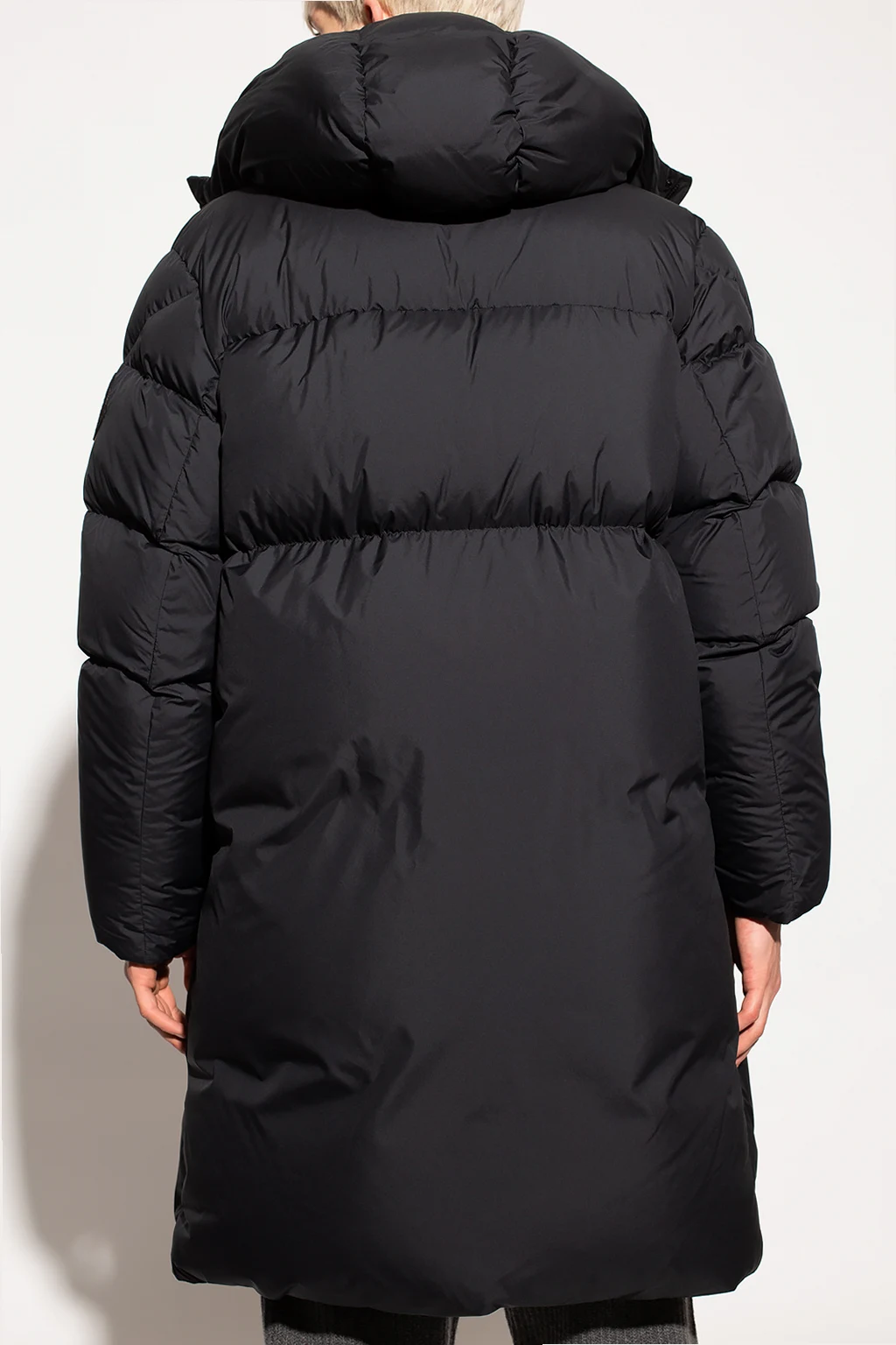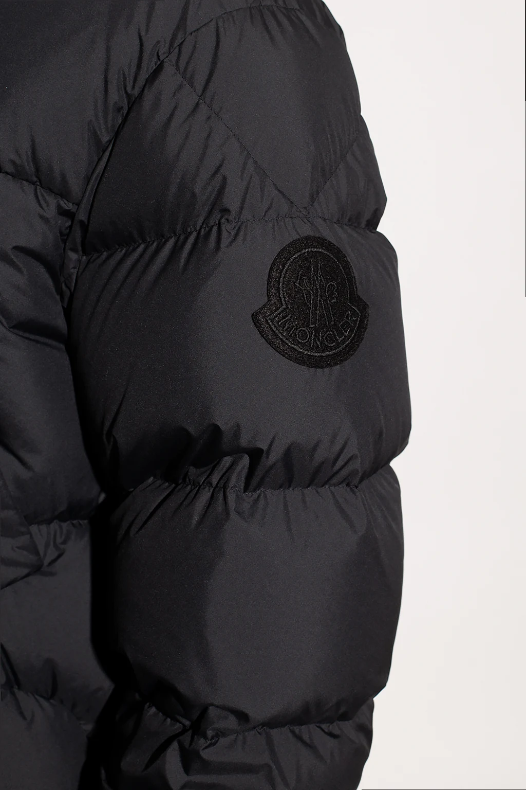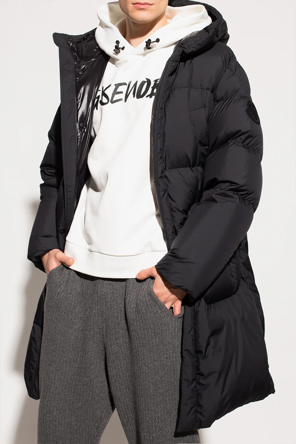 Black ‘Fussa’ quilted jacket from Moncler Genius, the ‘1952 no. 2’ collection. Fastened with a zip and snaps, this long sleeve design features a logo patch, two snap-fastened pockets as well as drawstrings at the hood and hem.