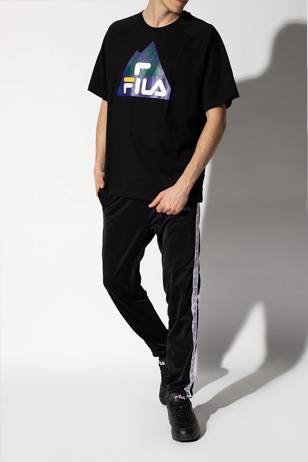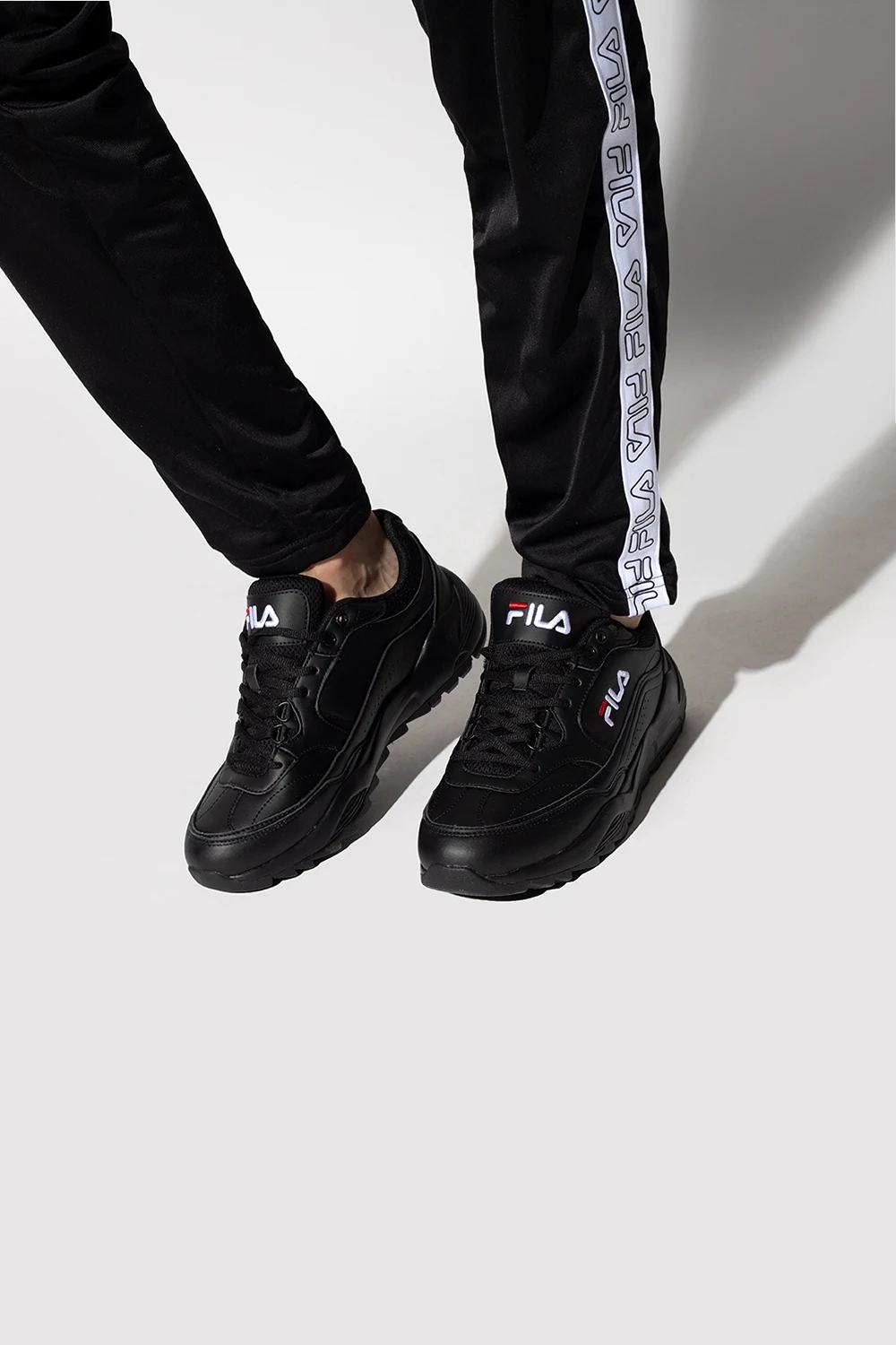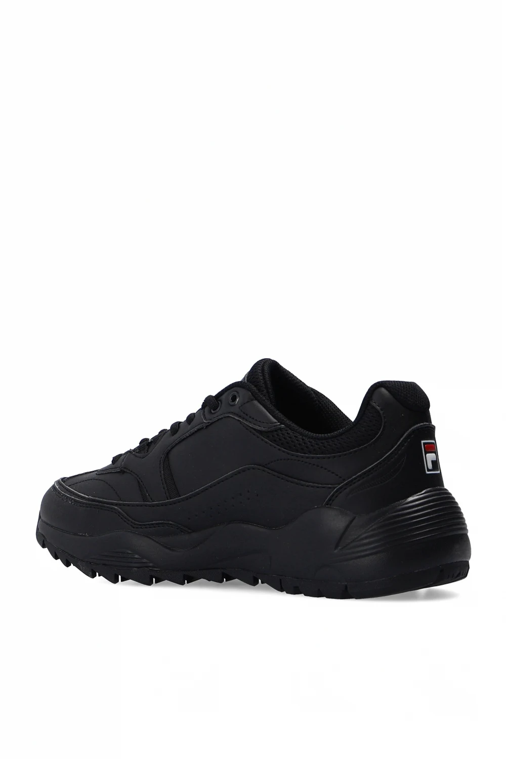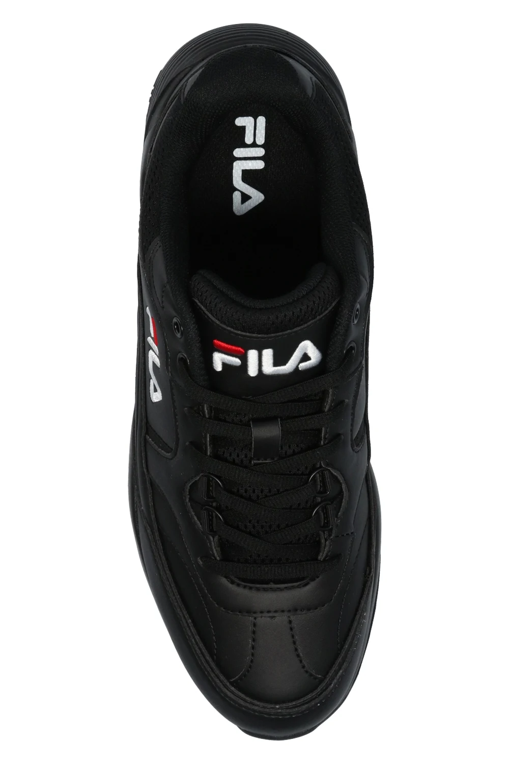 Black ‘Overtake’ sneakers from Fila. Embroidered with the brand's logo in white and red, this lace-up pair sits on a black rubber sole.