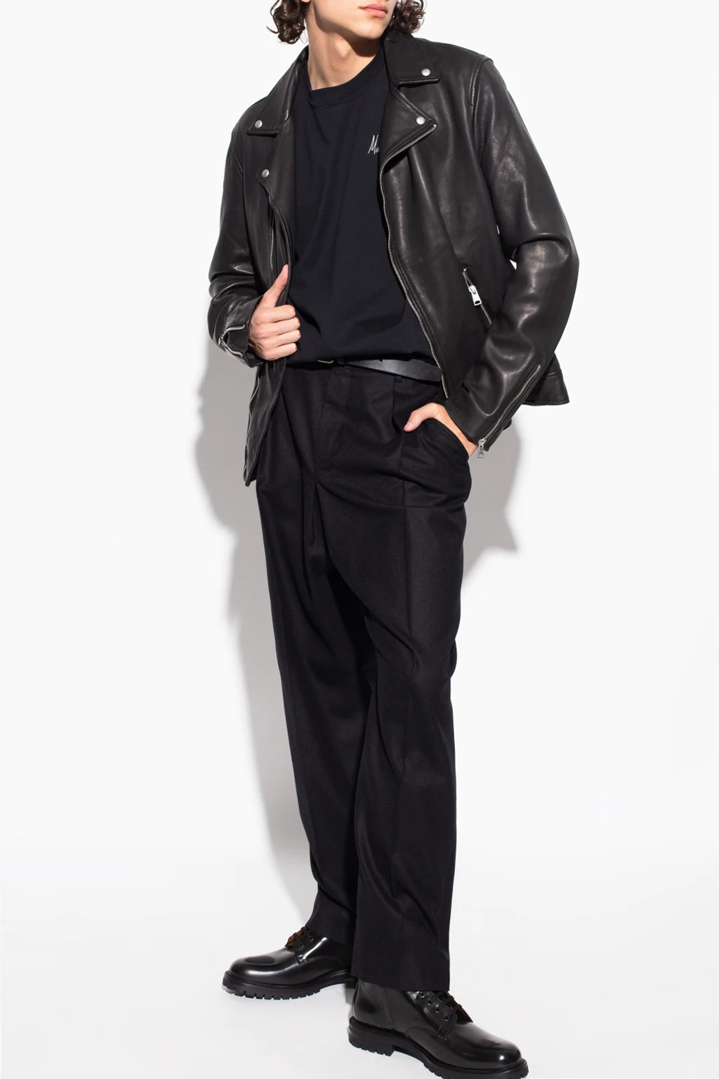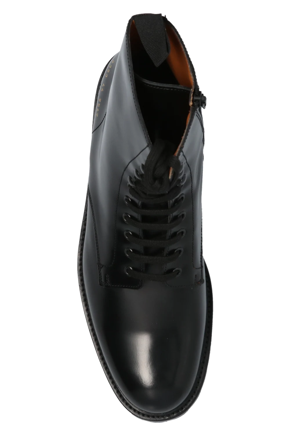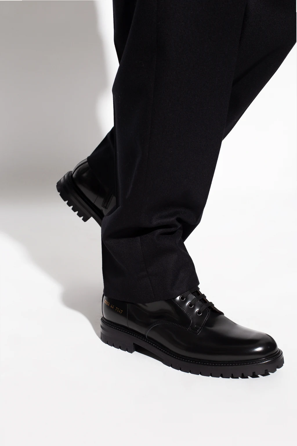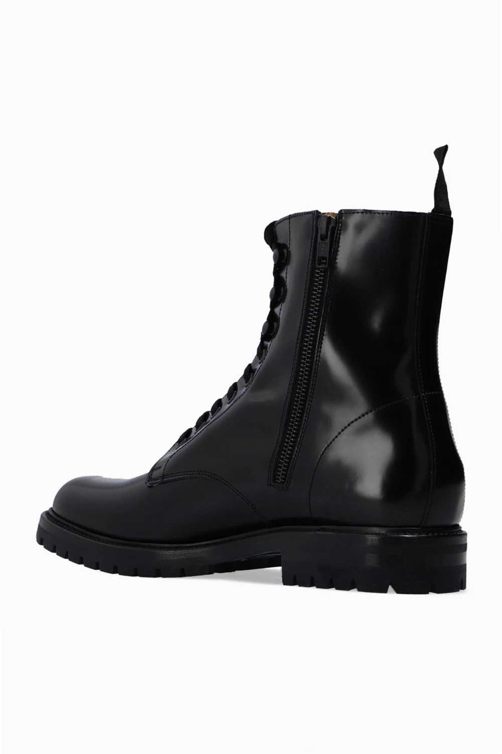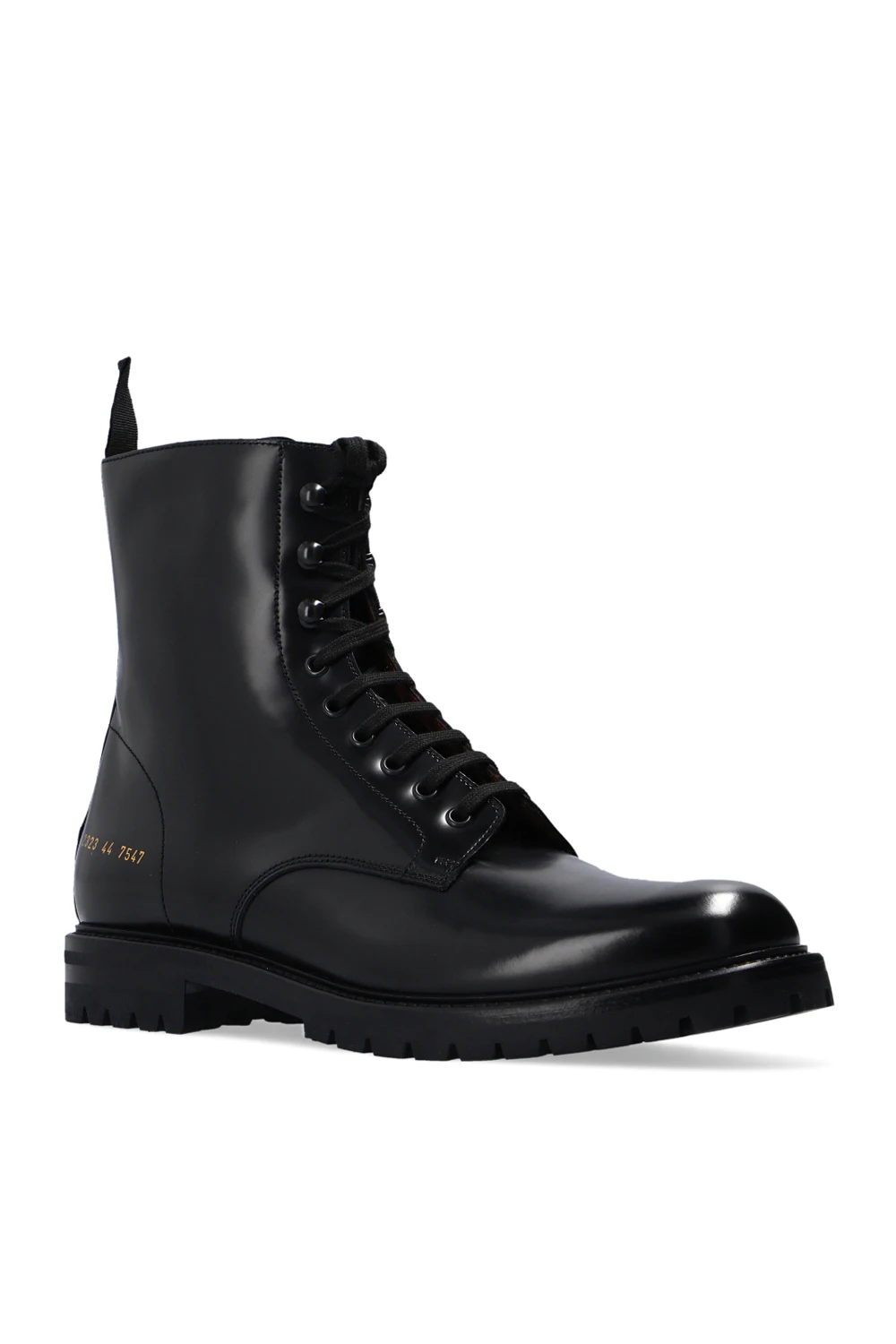 Black ‘Combat’ ankle boots from Common Projects. Crafted from leather, this lace-up model sits on a black lug rubber sole and features a side zip closure, a gold-tone graphic print on the side and swappable shoelaces.