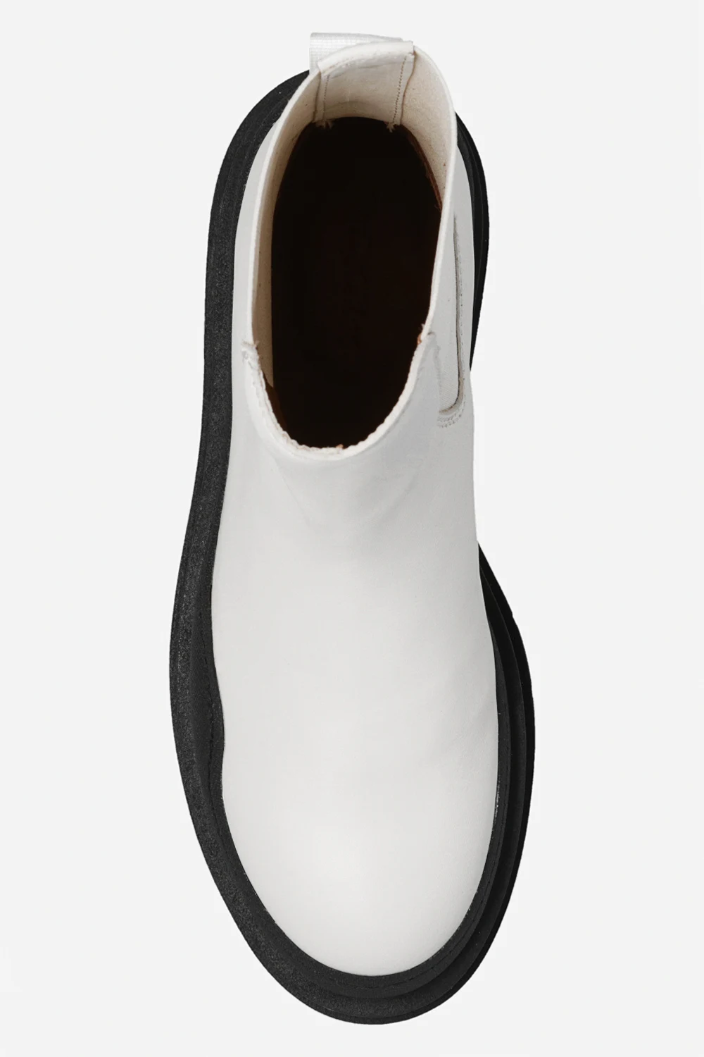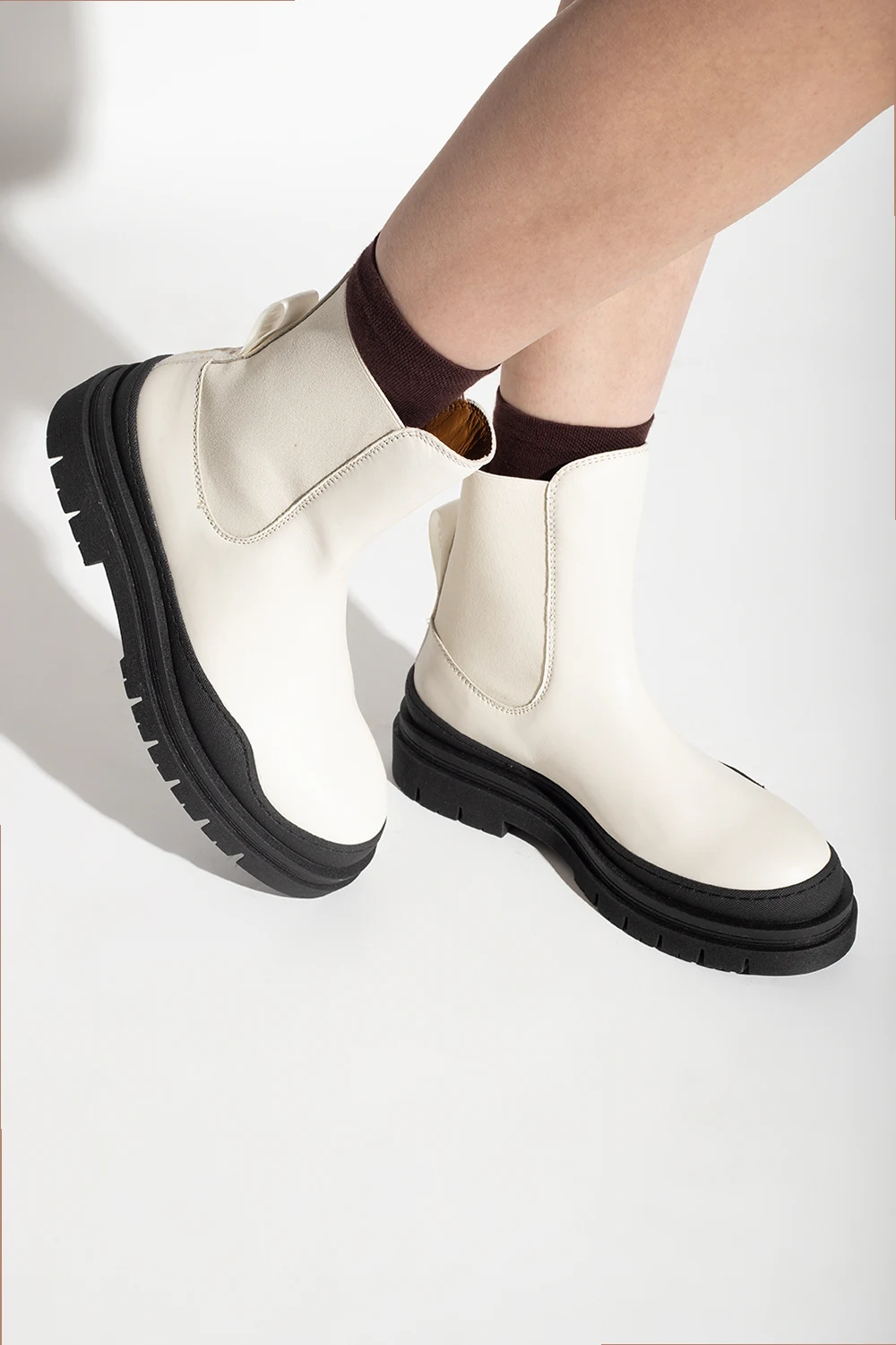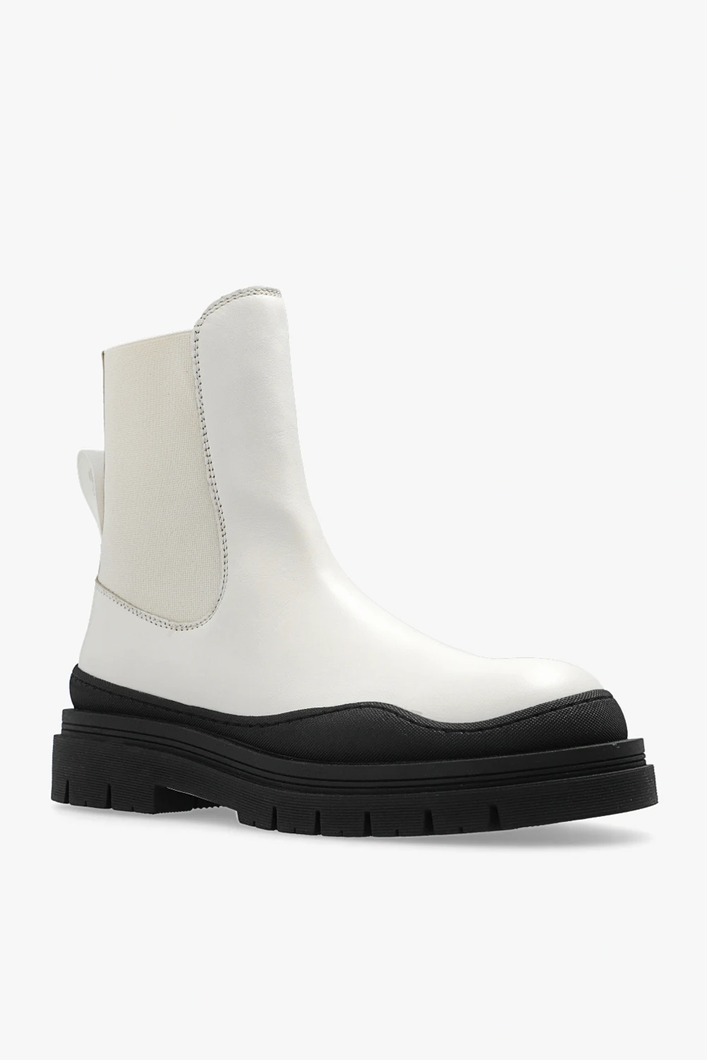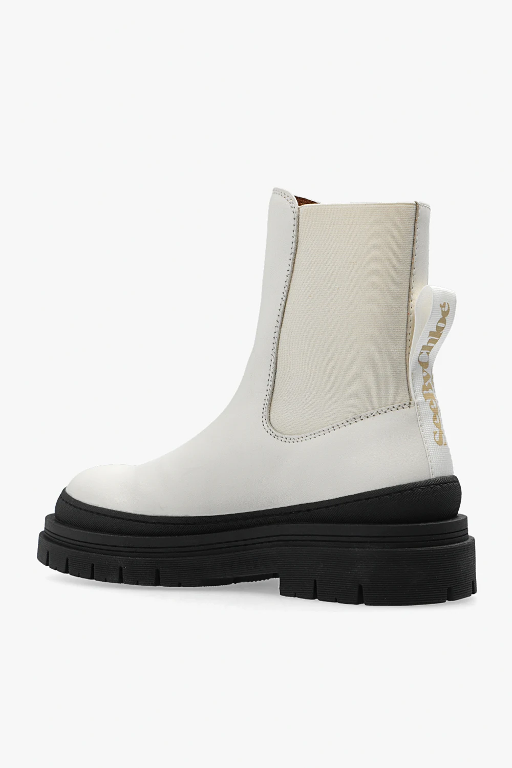Cream ‘Alli’ Chelsea boots from See By Chloe. Crafted from leather, this model sits on a black rubber sole and features elastic panels on the sides and a fabric insert with a printed logo at the back.