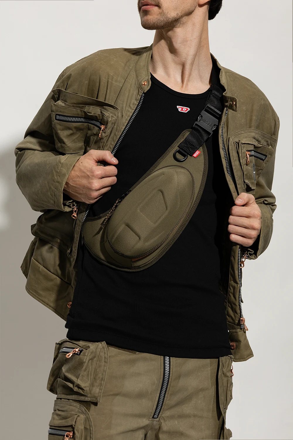 Green ‘1DR-POD’ belt bag from Diesel. Fastened with a two-way zip, this item features a raised logo pattern, adjustable belt and one internal compartment with one slip pocket and one zip pocket.