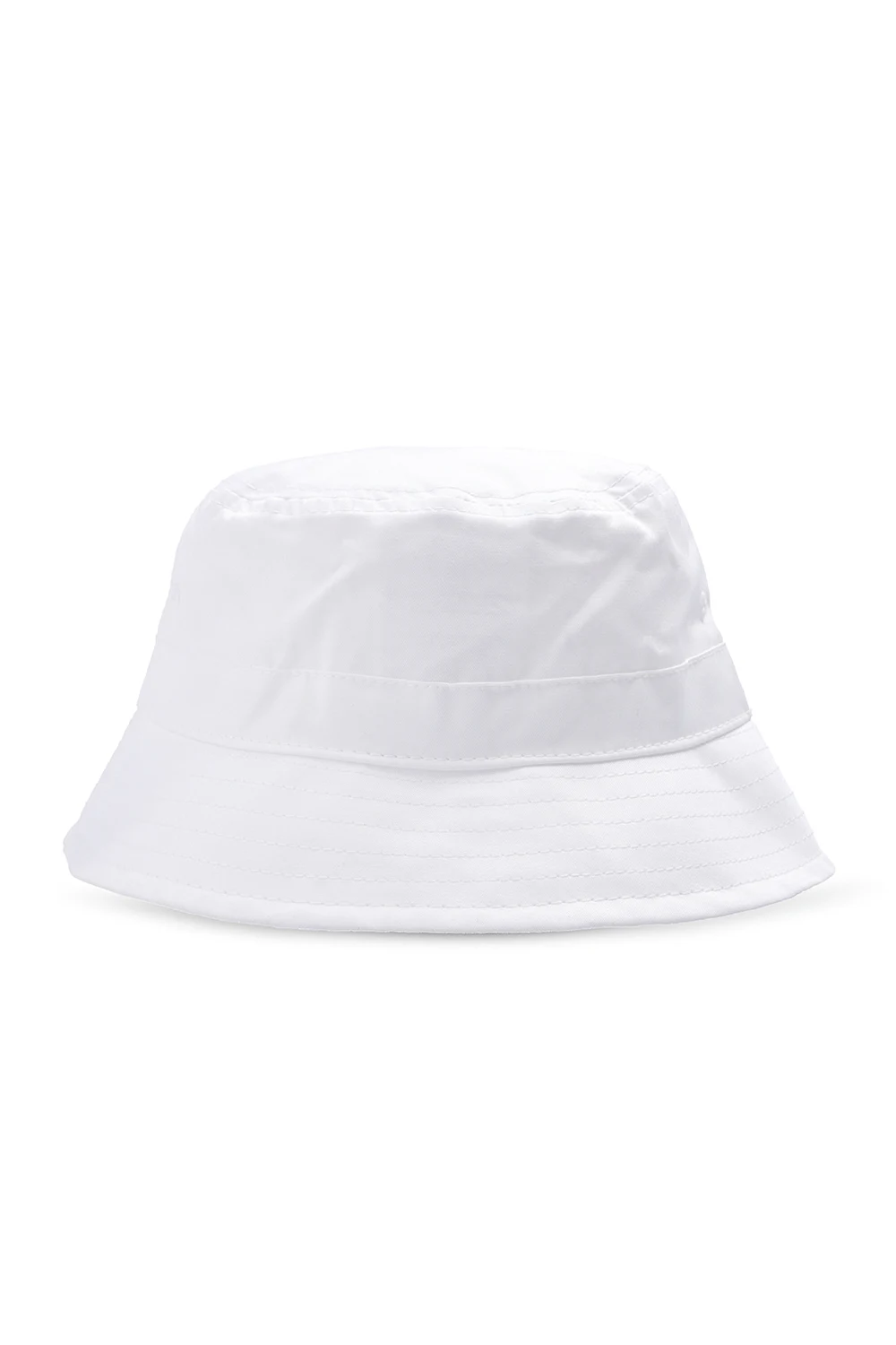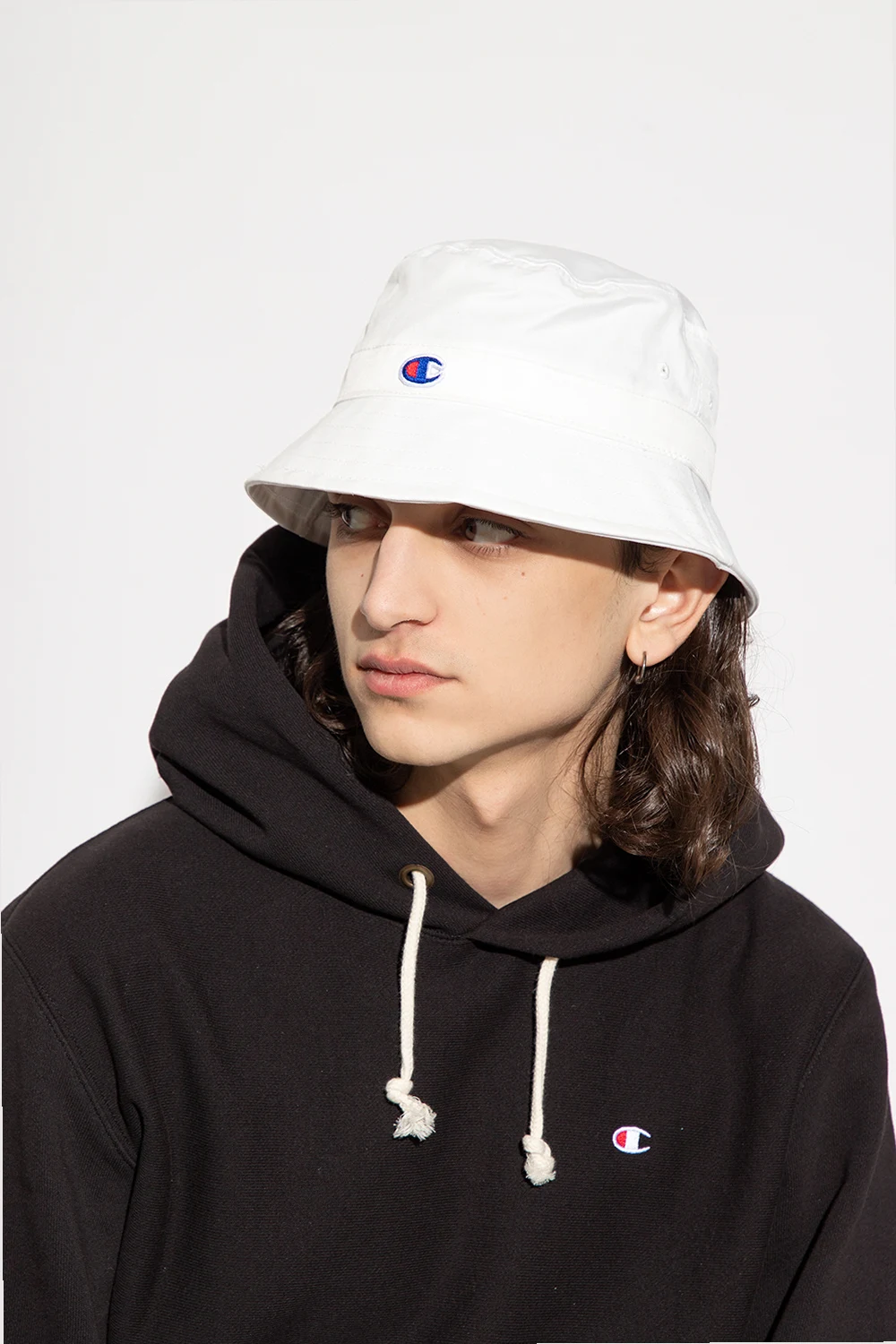 White bucket hat with a logo patch in white, blue and red from Champion.