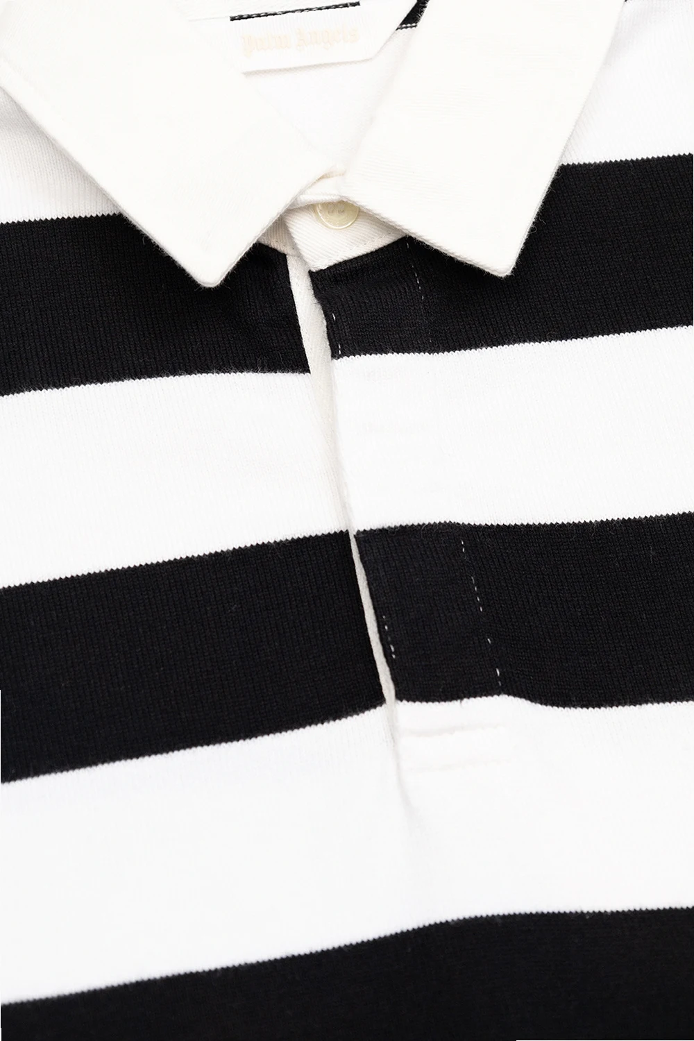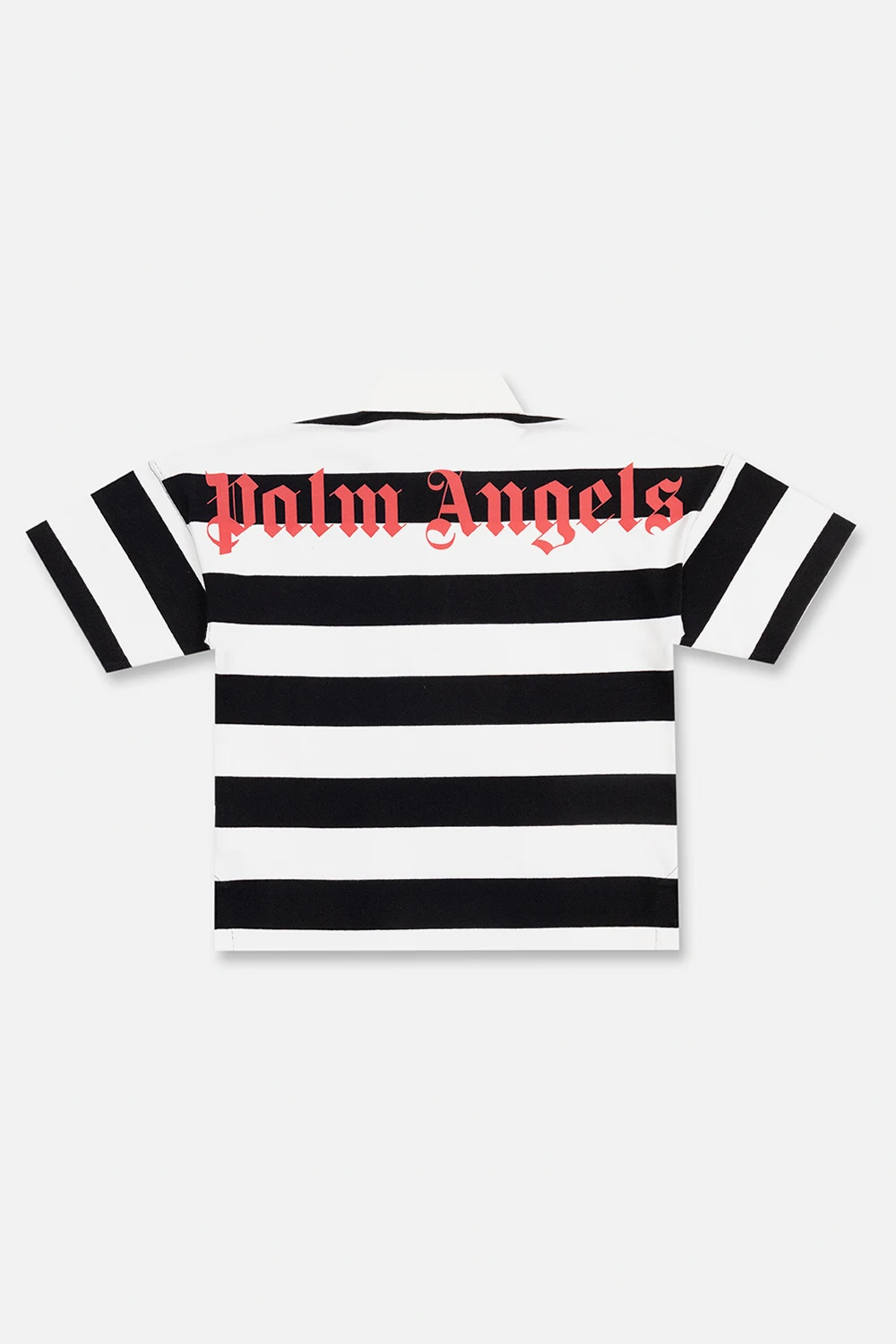 Black and white polo shirt from Palm Angels Kids. Crafted from cotton, this style showcases a stripe pattern, a concealed button placket, short sleeves and a printed red logo at the back.