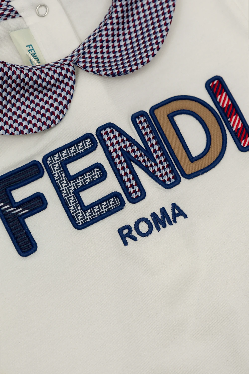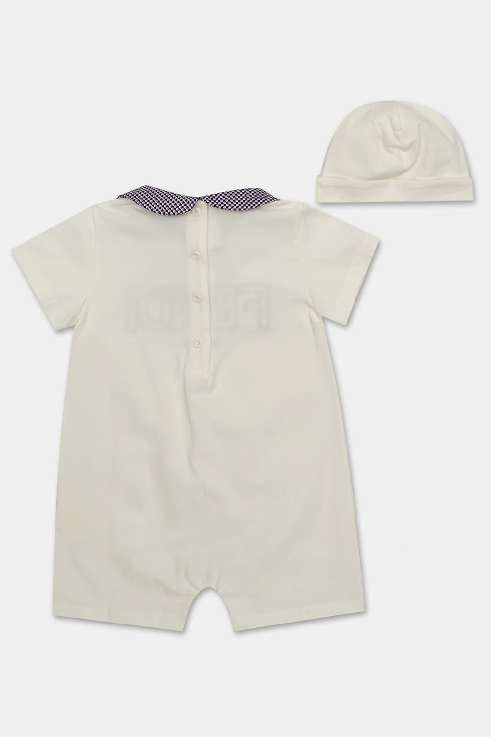 White romper suit & beanie set from Fendi Kids. Made from cotton. The romper suit features a round neck with a colourful collar, short sleeves and snap closures on the back and crotch. The beanie has a turn-up hem with navy blue logo embroidery.