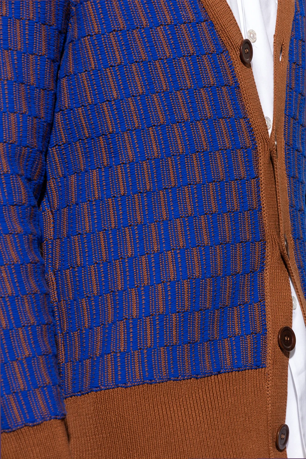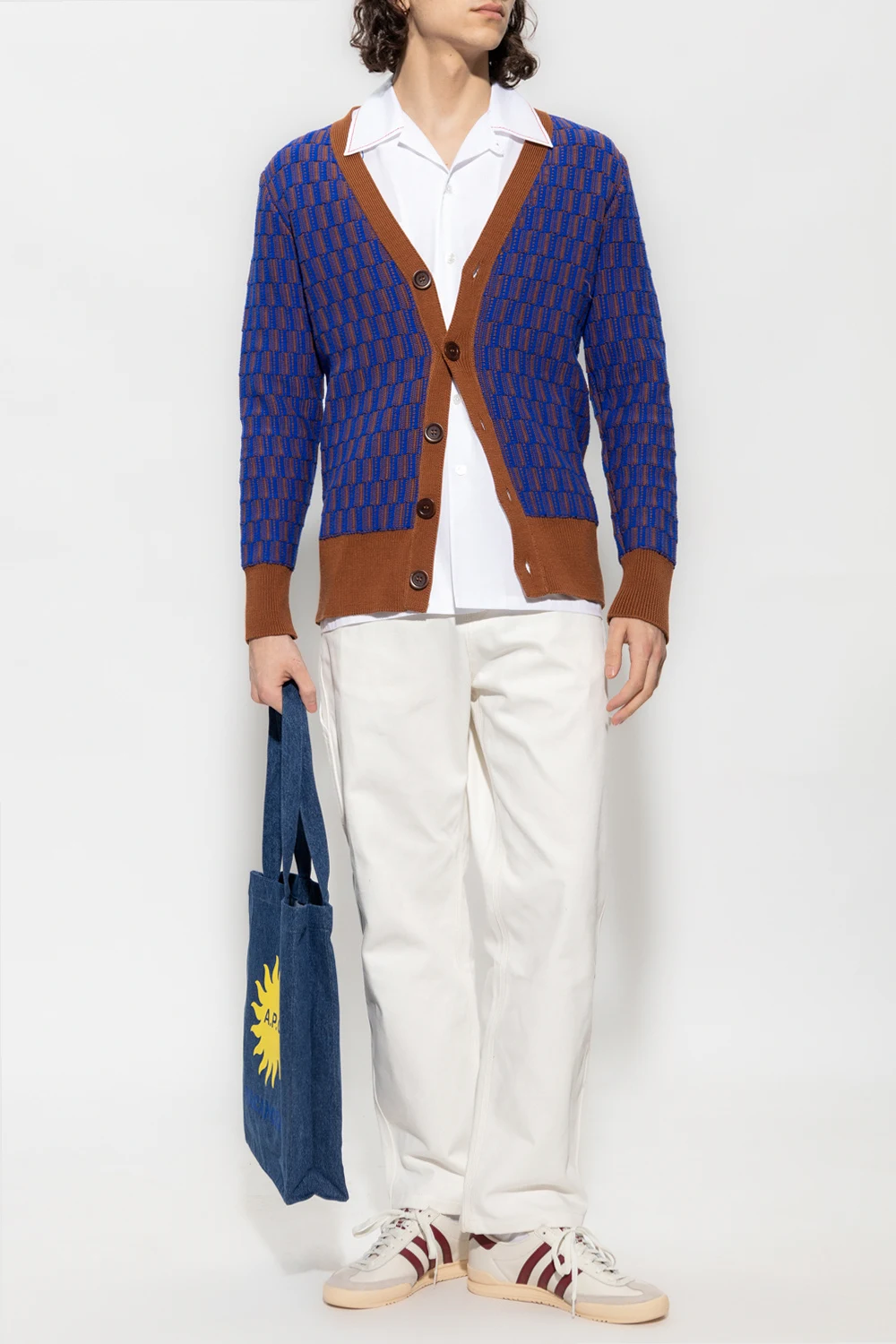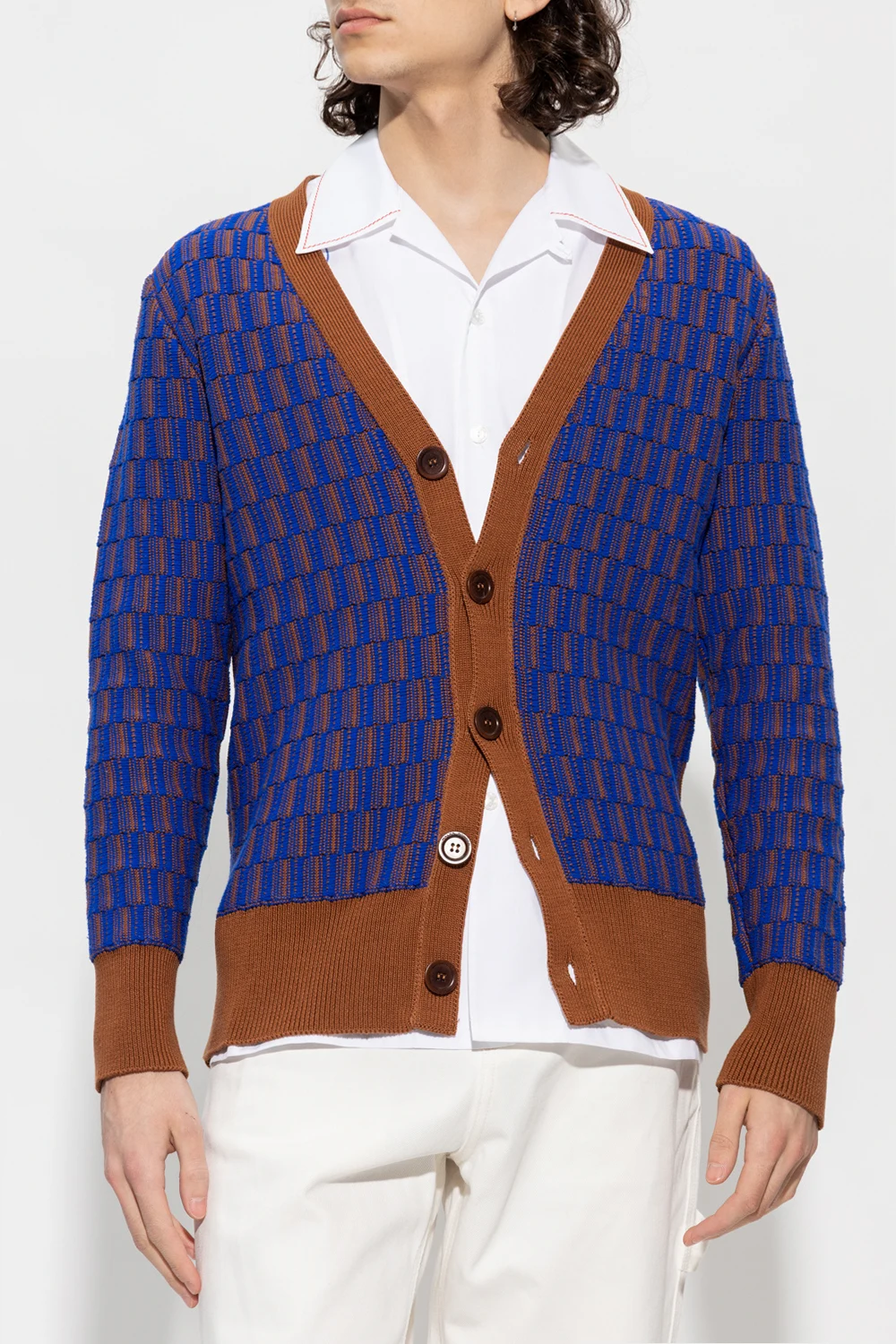 Brown and blue ‘Prince’ cardigan from Wales Bonner. Made of cotton, this V-neck design features button fastenings, decorative woven check pattern and ribbed trims at the neck, hem and cuffs.
