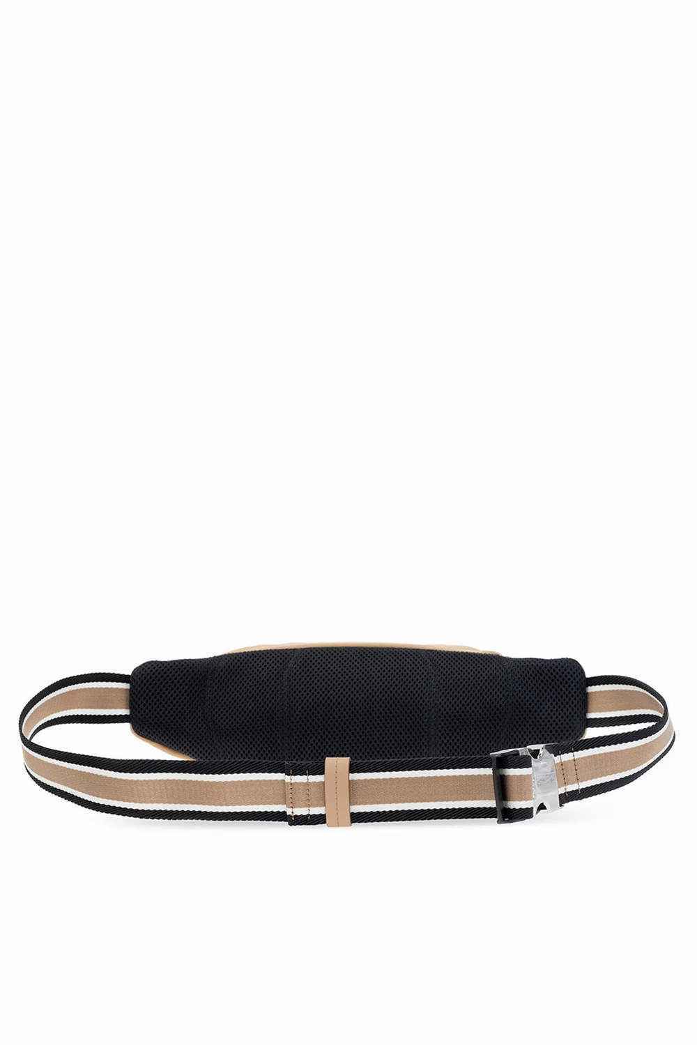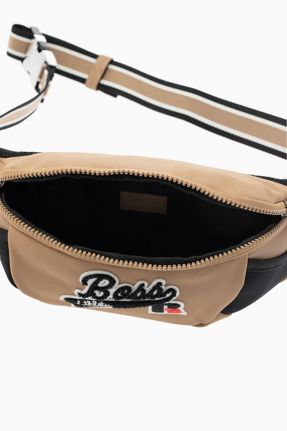 Beige and black belt bag from BOSS x Russell Athletic. Crafted from structural nylon made of recycled fibers, this item features a zip fastening and is complete with a white and black logo patch, adjustable belt, silver-tone metal hardware and one internal compartment with one zip pocket.