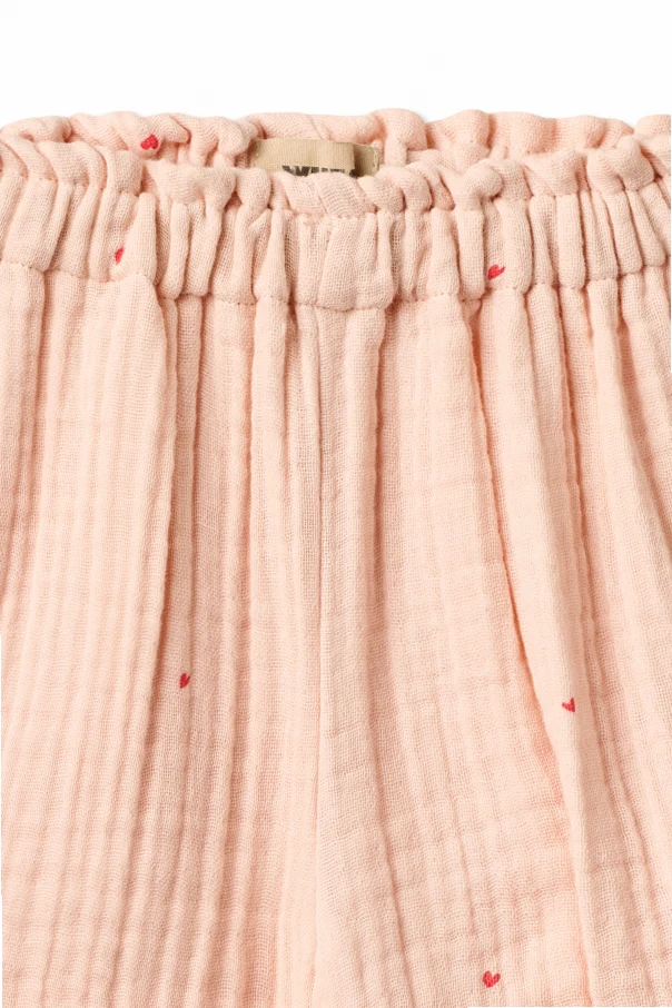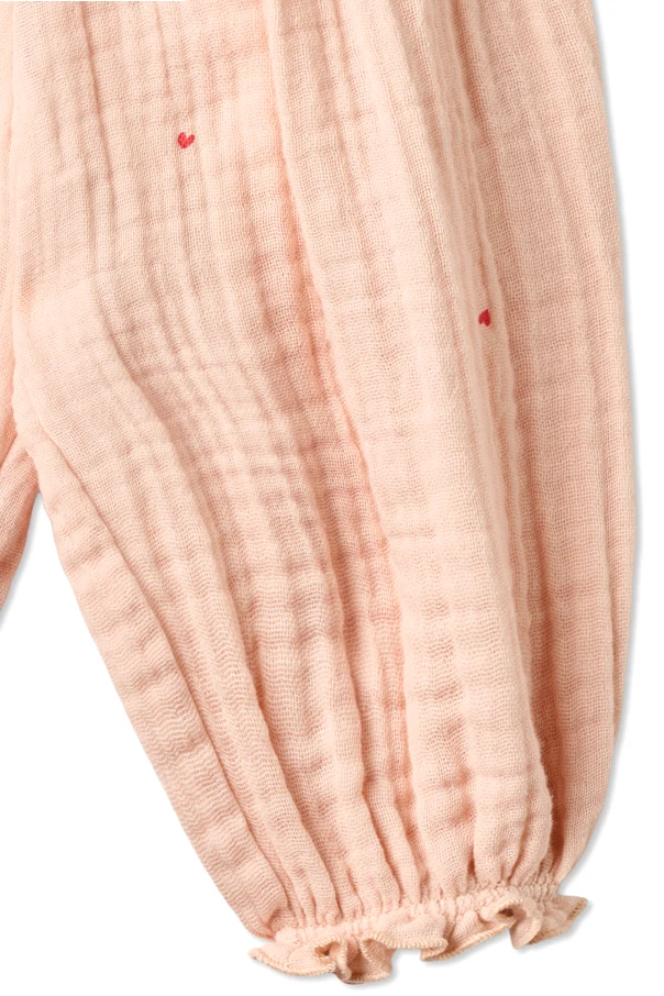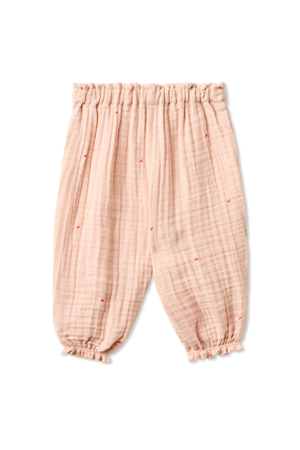 Die Hose „Petrine” von Wheat ist die Verkörperung raffinierter Schlichtheit, die für die Jüngsten entworfen wurde. Aus äußerst weichem Musselin-Baumwollstoff gefertigt, begeistert sie durch ihre Zartheit und Luftigkeit und bietet der empfindlichen Kinderhaut unvergleichlichen Komfort. Der einheitliche, rosafarbene Ton in Kombination mit einem dezenten Muster aus roten Herzchen verleiht dem Ganzen eine bezaubernde Subtilität.