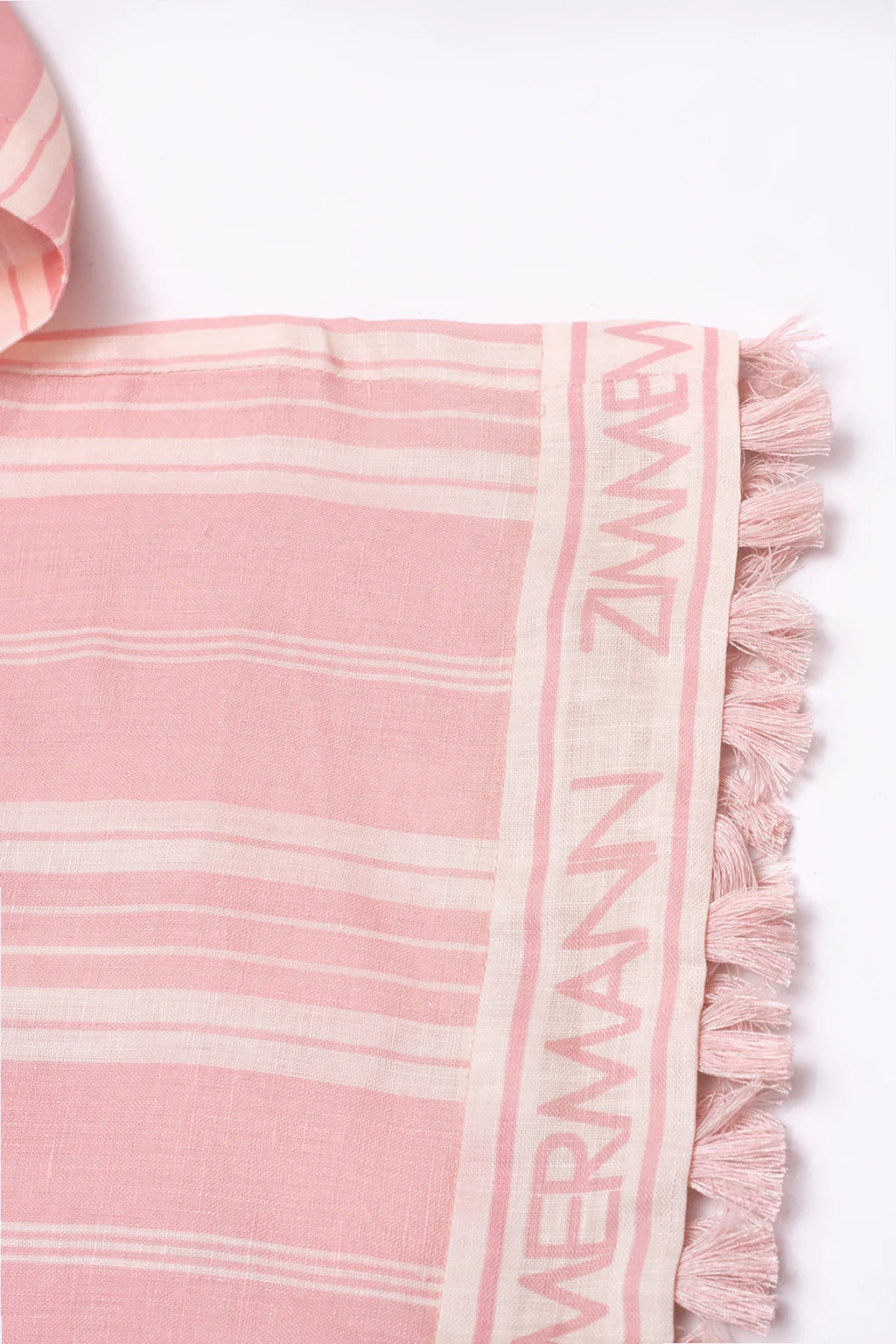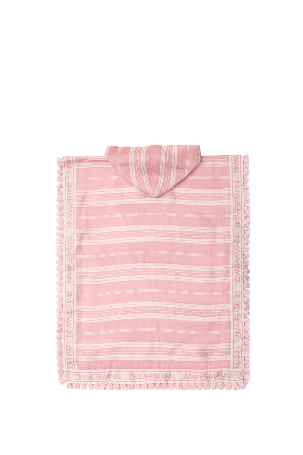 Light pink and cream hooded poncho from Zimmermann Kids. Made of linen, this garment features a stripe pattern, drawstrings on the sides, V-neck with drawstrings and edges with logo details and fringes.
