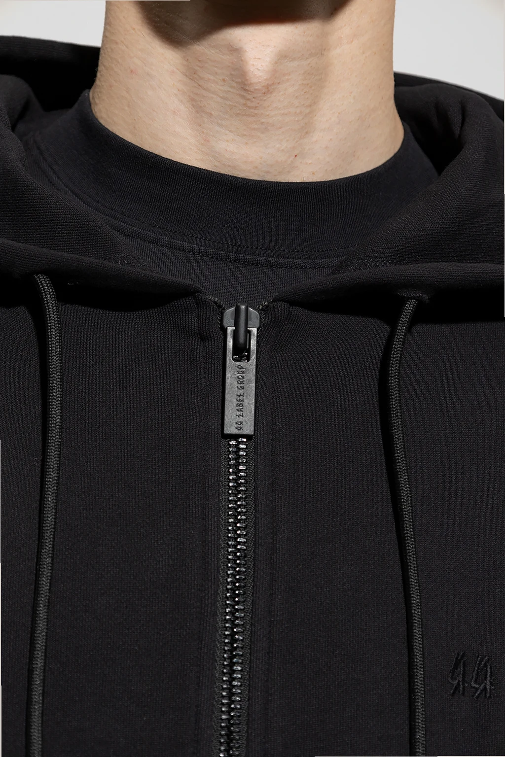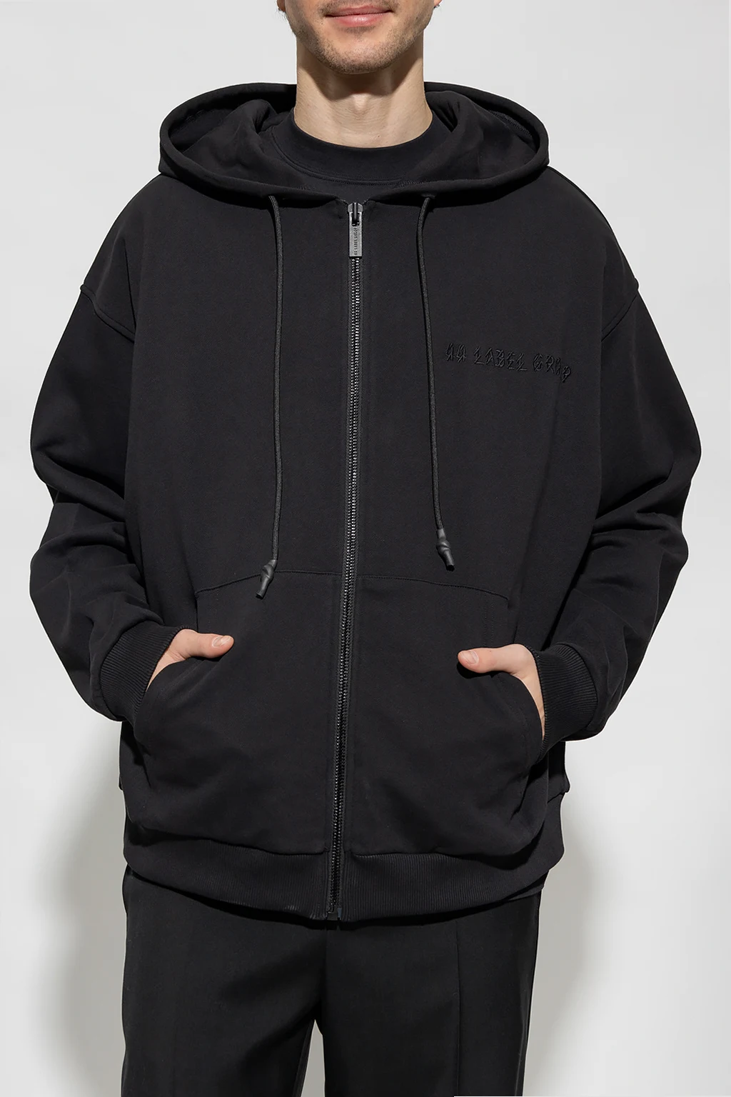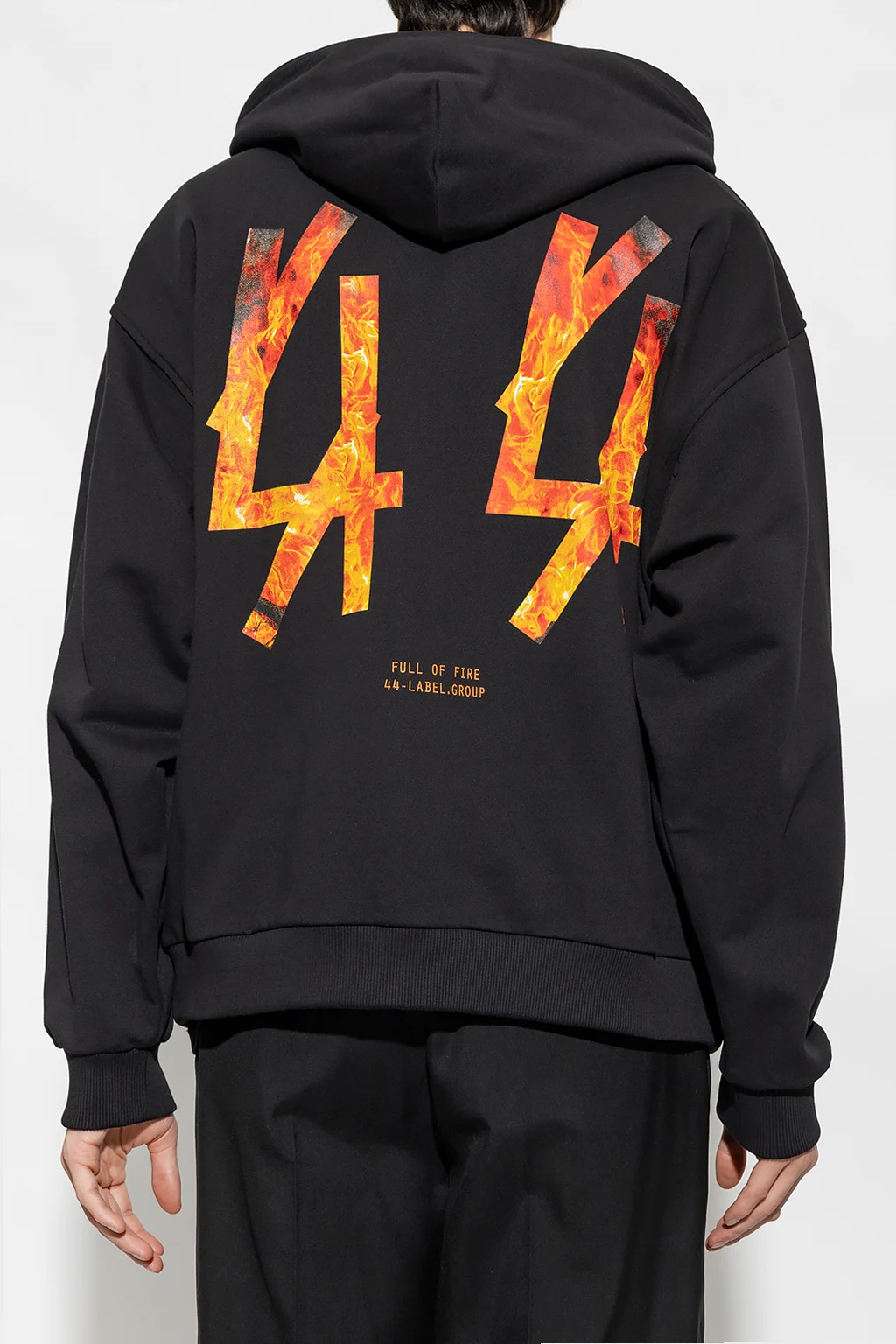 Black sweatshirt with a drawstring hood from 44 Label Group. Crafted from cotton jersey, this style features logo embroidery on the front, two slip pockets, long sleeves, an orange, yellow and black flame logo graphic at the back and elasticized trims on the bottom hem and cuffs.