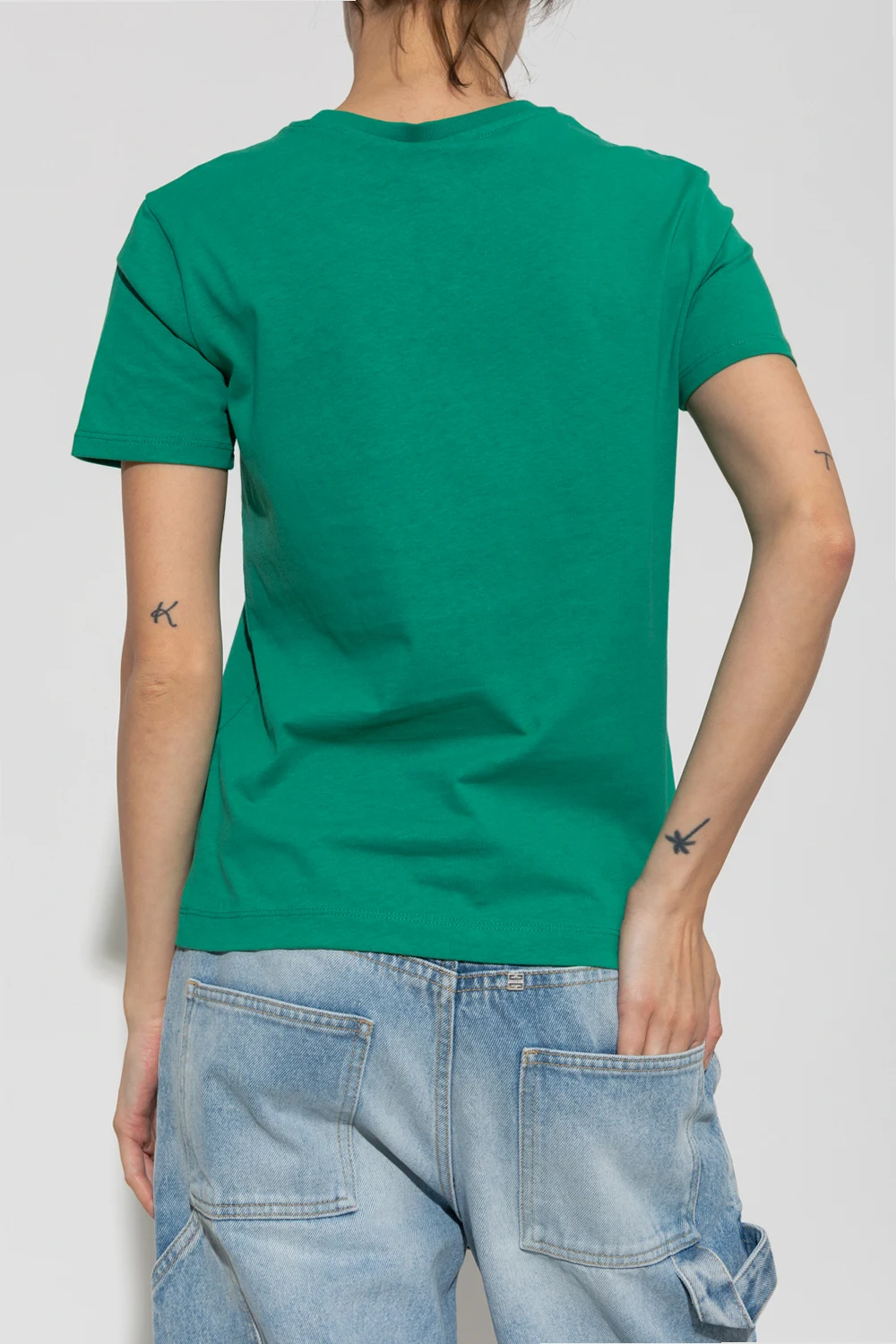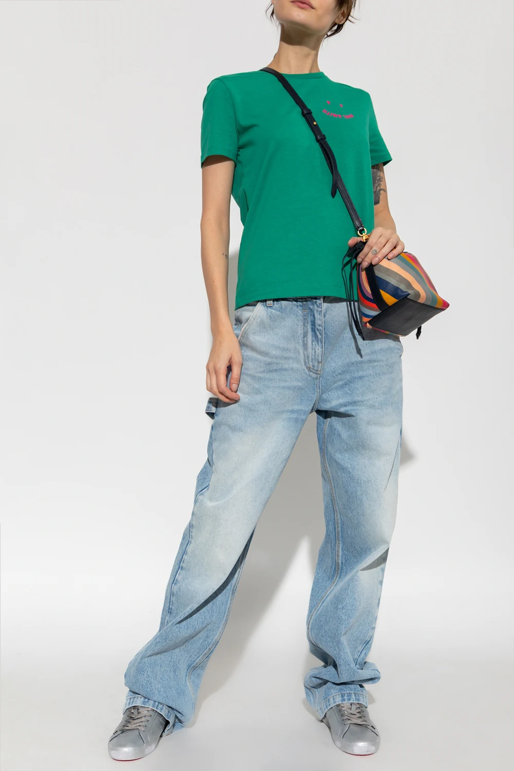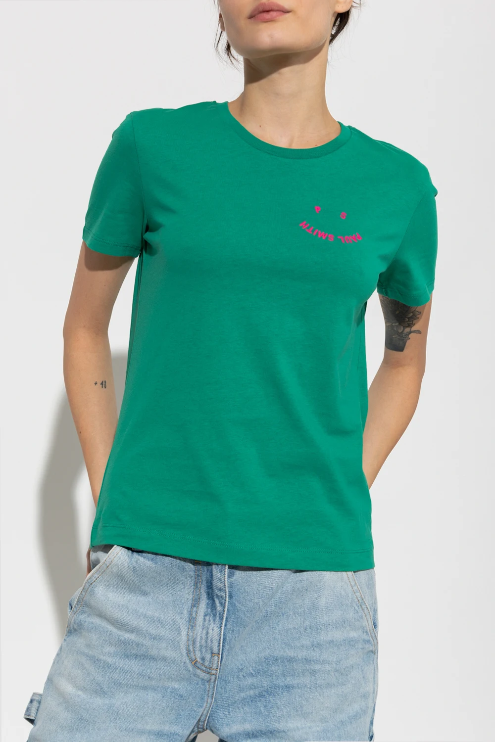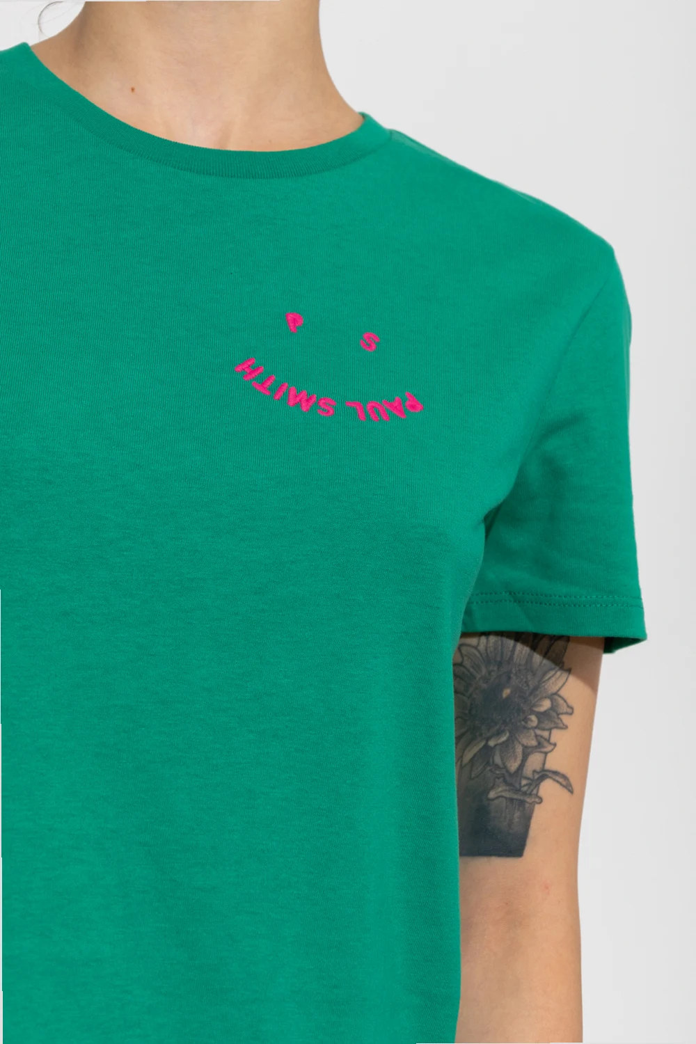 Green crewneck T-shirt from PS Paul Smith. Crafted from organic cotton, this style features short sleeves, an elasticated collar and an embroidered pink logo on the front.