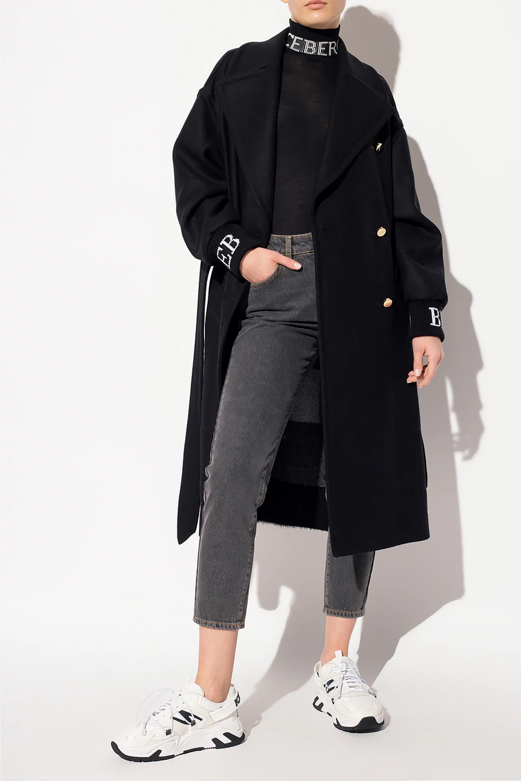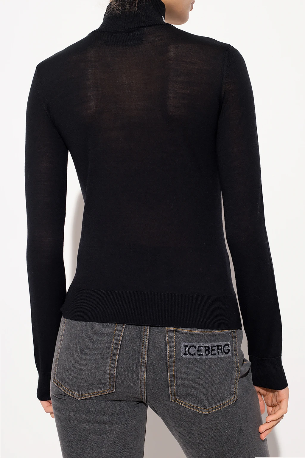 Black turtleneck sweater from Iceberg. Crafted from a sheep and alpaca wool blend, this garment features white logo embroideries on the sleeves and ribbed trims.