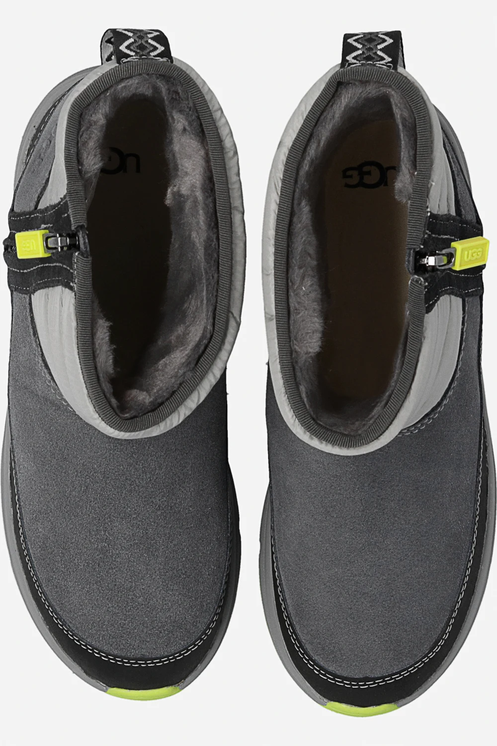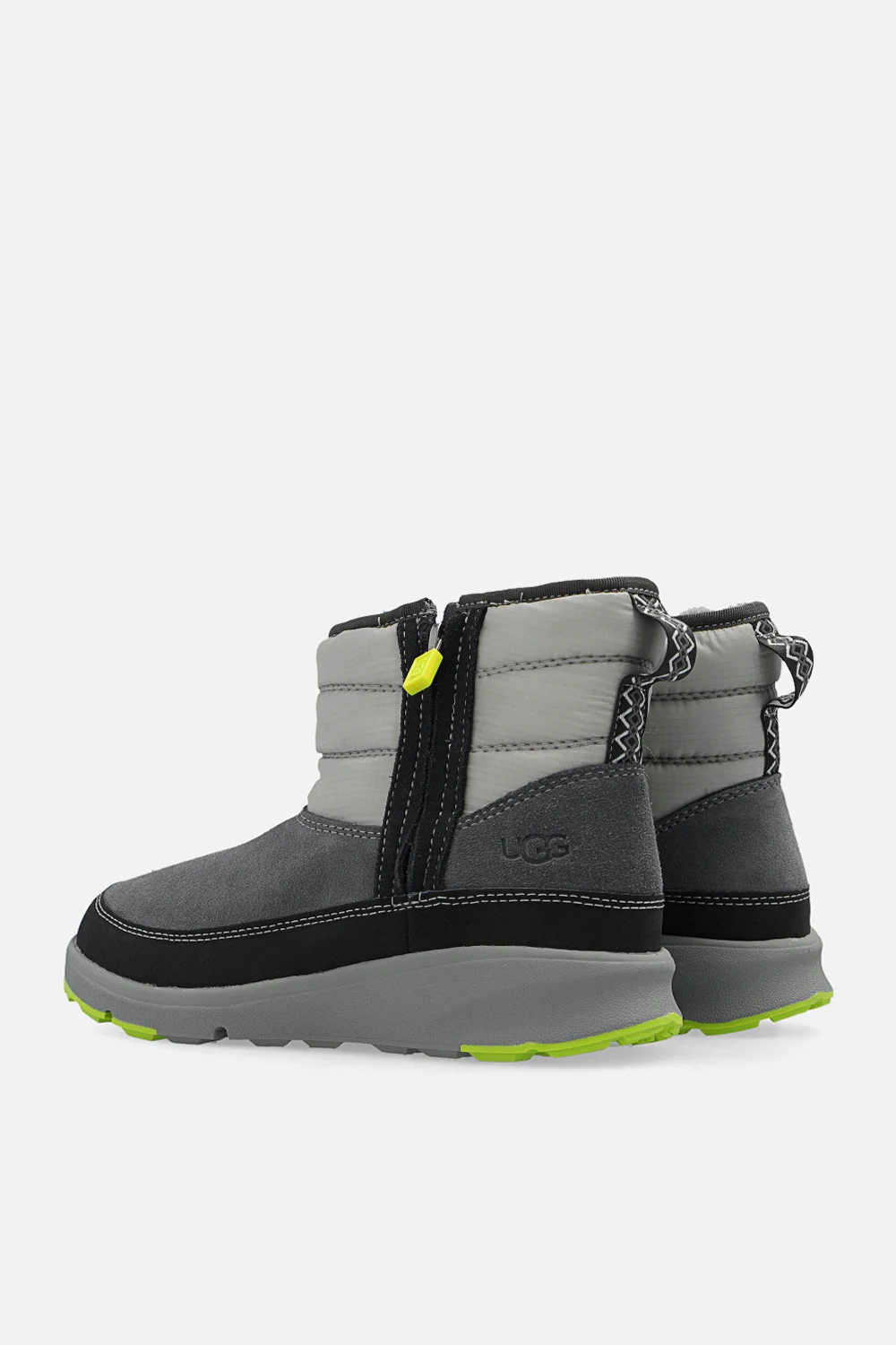 Grey and navy blue ‘Truckee Weather’ waterproof snow boots from UGG Kids. Emblazoned with a logo, this model features a faux fur insole and a grey and green rubber outsole. Temperature range: up to -20°C.