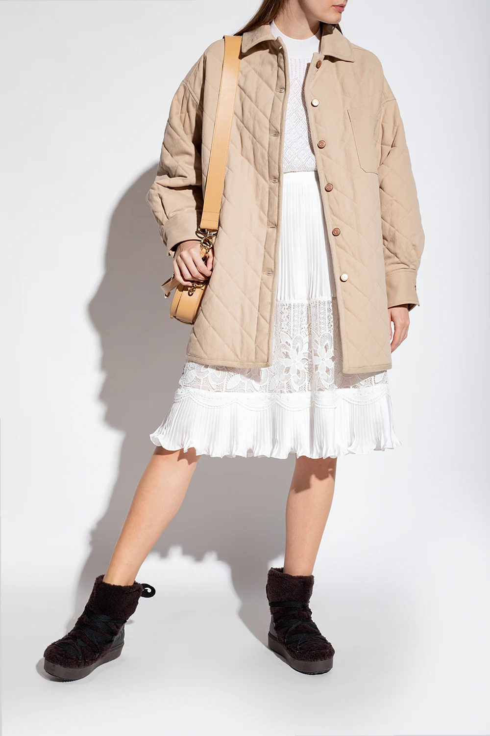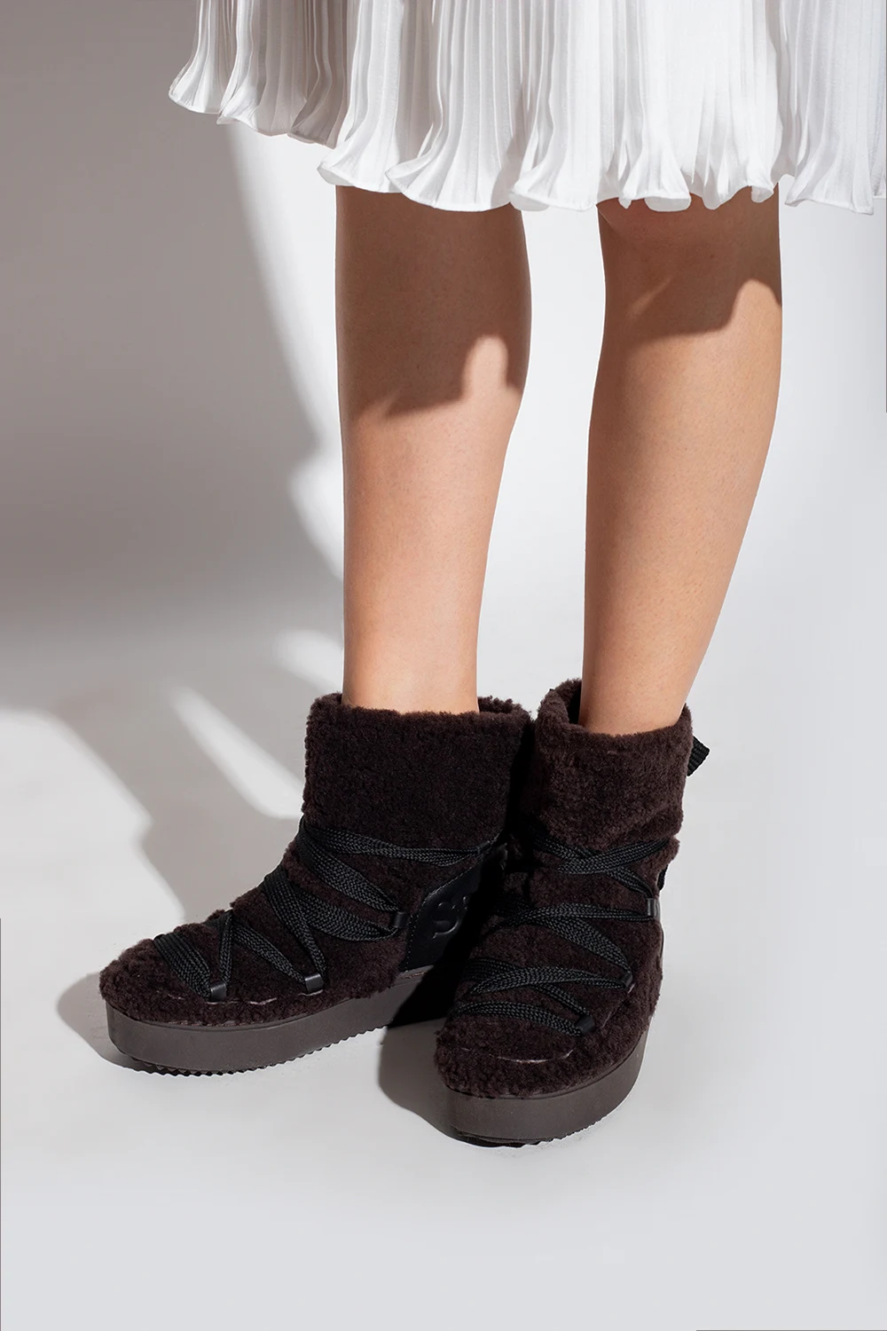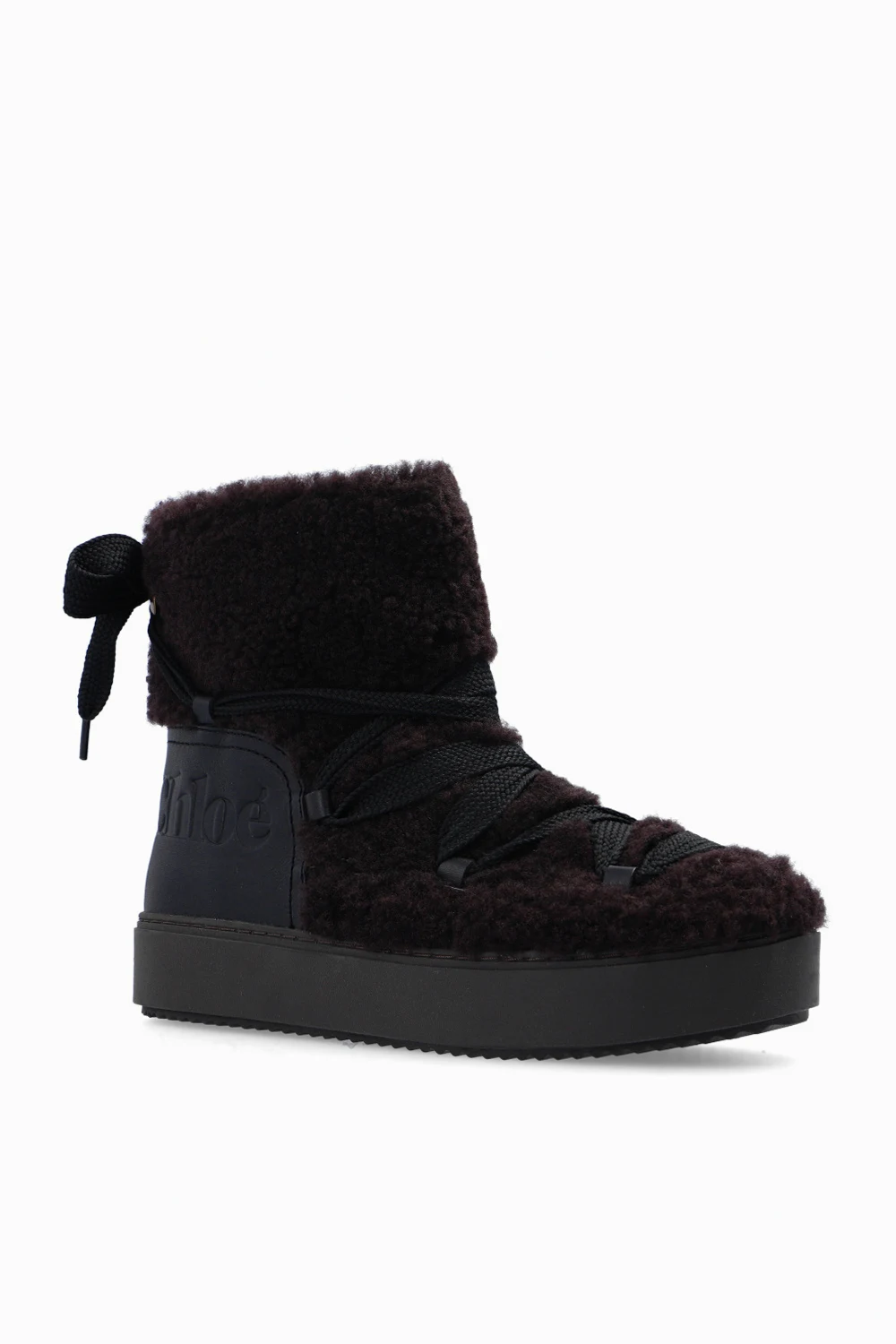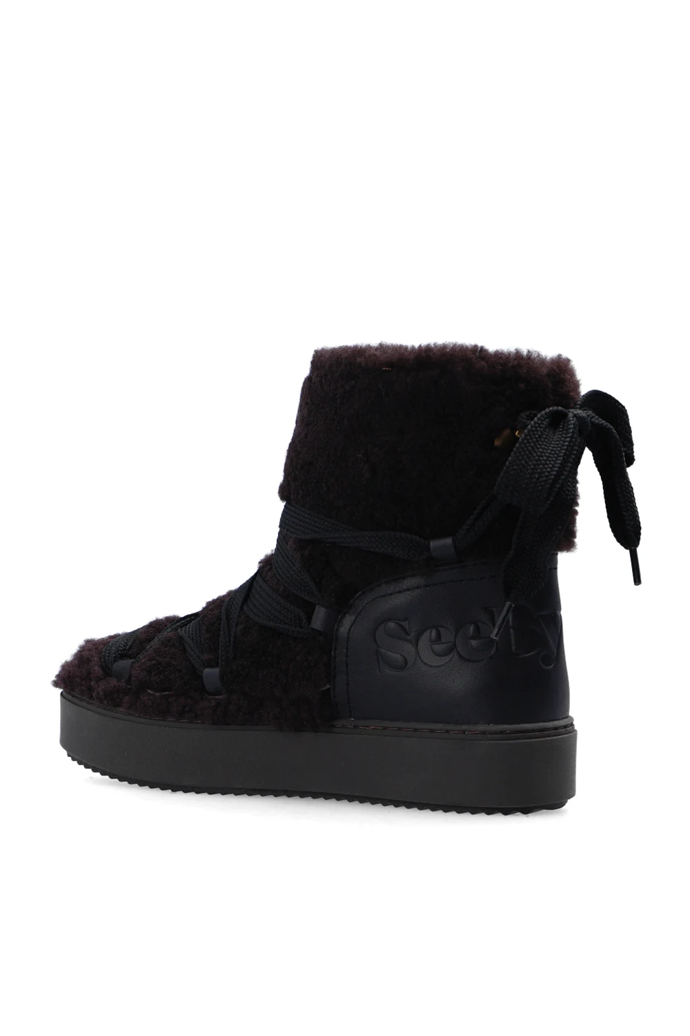 Dark brown 'Mary' snow boots from See By Chloé. Crafted from lamb leather and fur, this model features a lace-up front and back, logo-embossed leather panelling at the back and a dark brown rubber sole at the base.