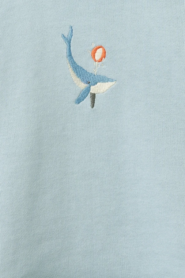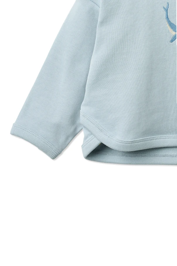 Emery Sweatshirt ist eine exquisite Wahl für die Jüngsten und vereint klassische Eleganz mit dem feinen Charme kindlicher Unschuld. Der hellblaue Farbton des Stoffes begeistert durch seine Reinheit und Zartheit und bildet den perfekten Hintergrund für den kunstvoll gestickten Wal mit erhobenem Schwanz, der im Maul einen rot-weißen Ball hält.